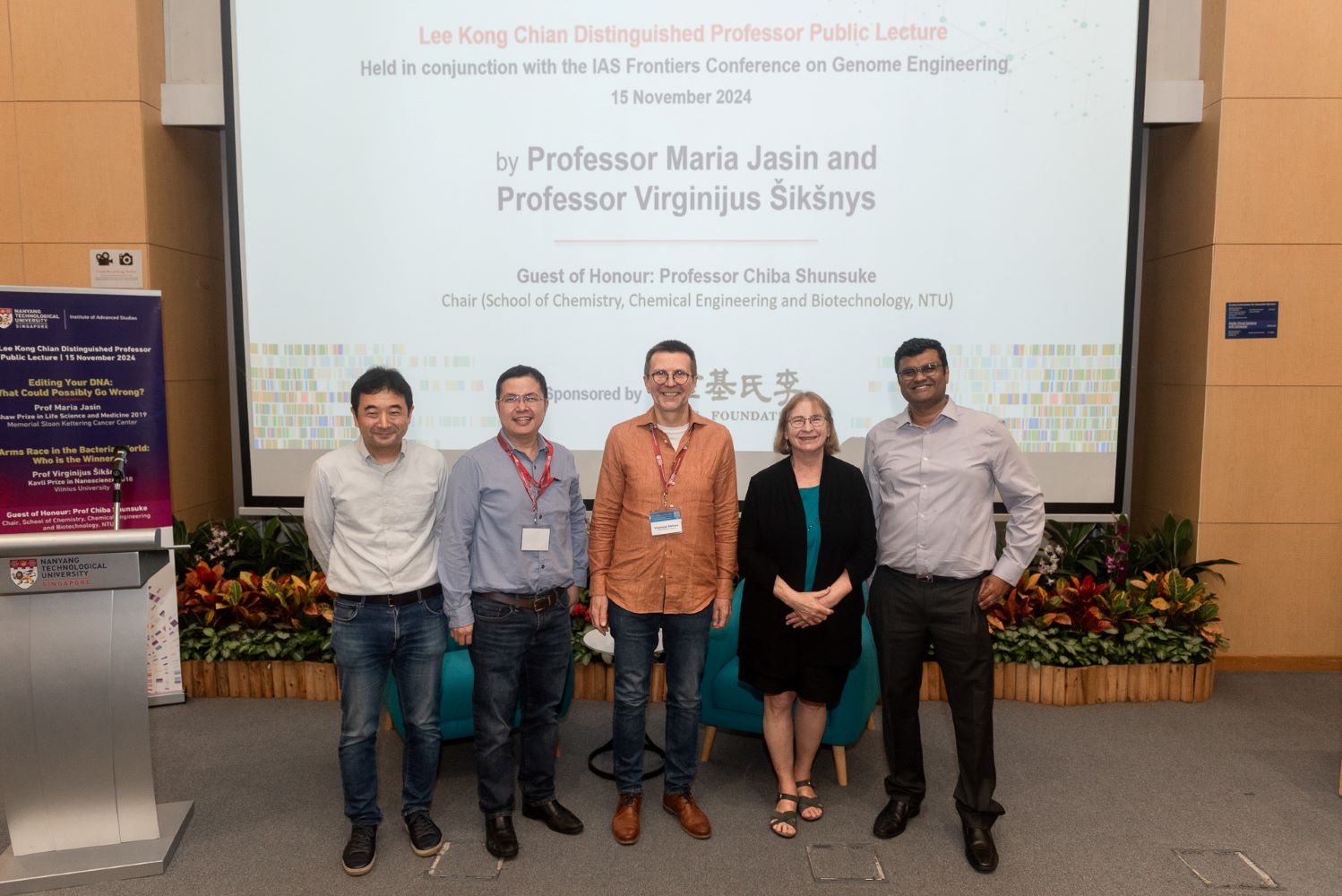 Our distinguished speakers, Prof Maria Jasin and Prof Virginijus Šikšnys, were appointed as Lee Kong Chian Distinguished Professors in relation to the public lecture on 15 November 2024. Sponsored by the Lee Foundation, the event was organised in conjunction with the IAS Frontiers Conference on Genome Engineering held at the School of Chemistry, Chemical Engineering, and Biotechnology (CCEB).