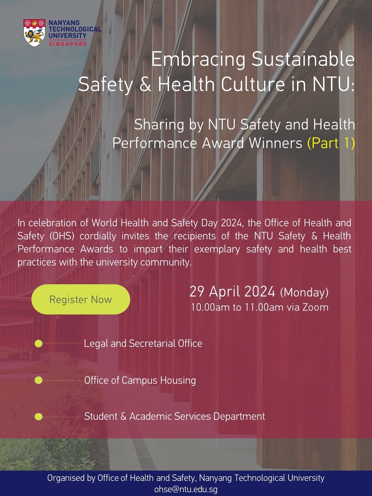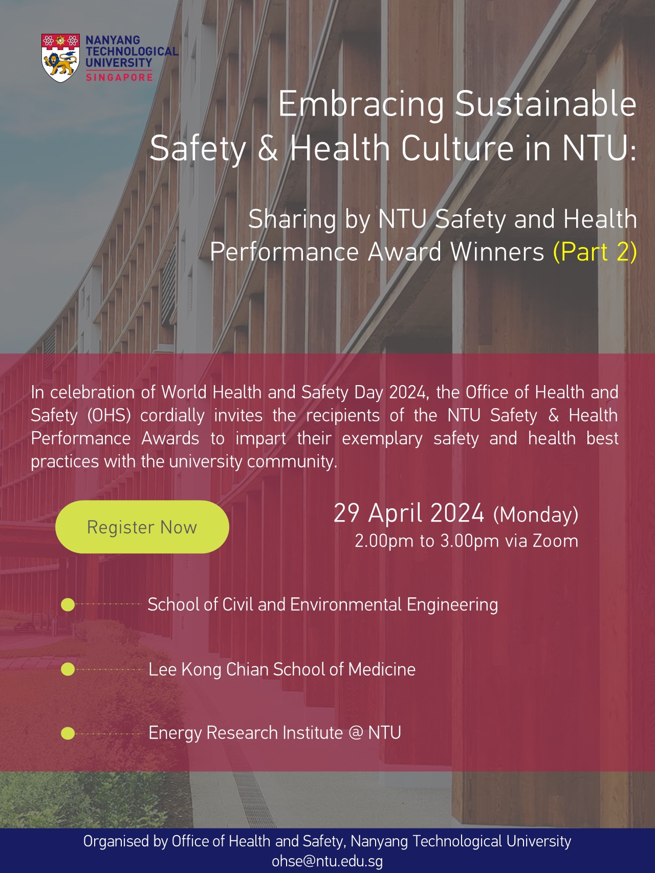 In celebration of World Health and Safety Day 2024, the Office of Health and Safety (OHS) cordially invites the recipients of the NTU Safety & Health Performance Awards to impart their exemplary safety and health best practices with the university community.