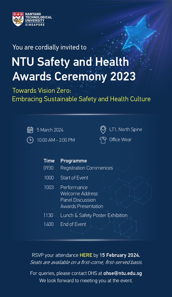 The NTU Safety & Health Awards 2023 is a platform to reward and recognize the safety and the health performance and best practices of various Schools, Departments and Centres in year 2023.