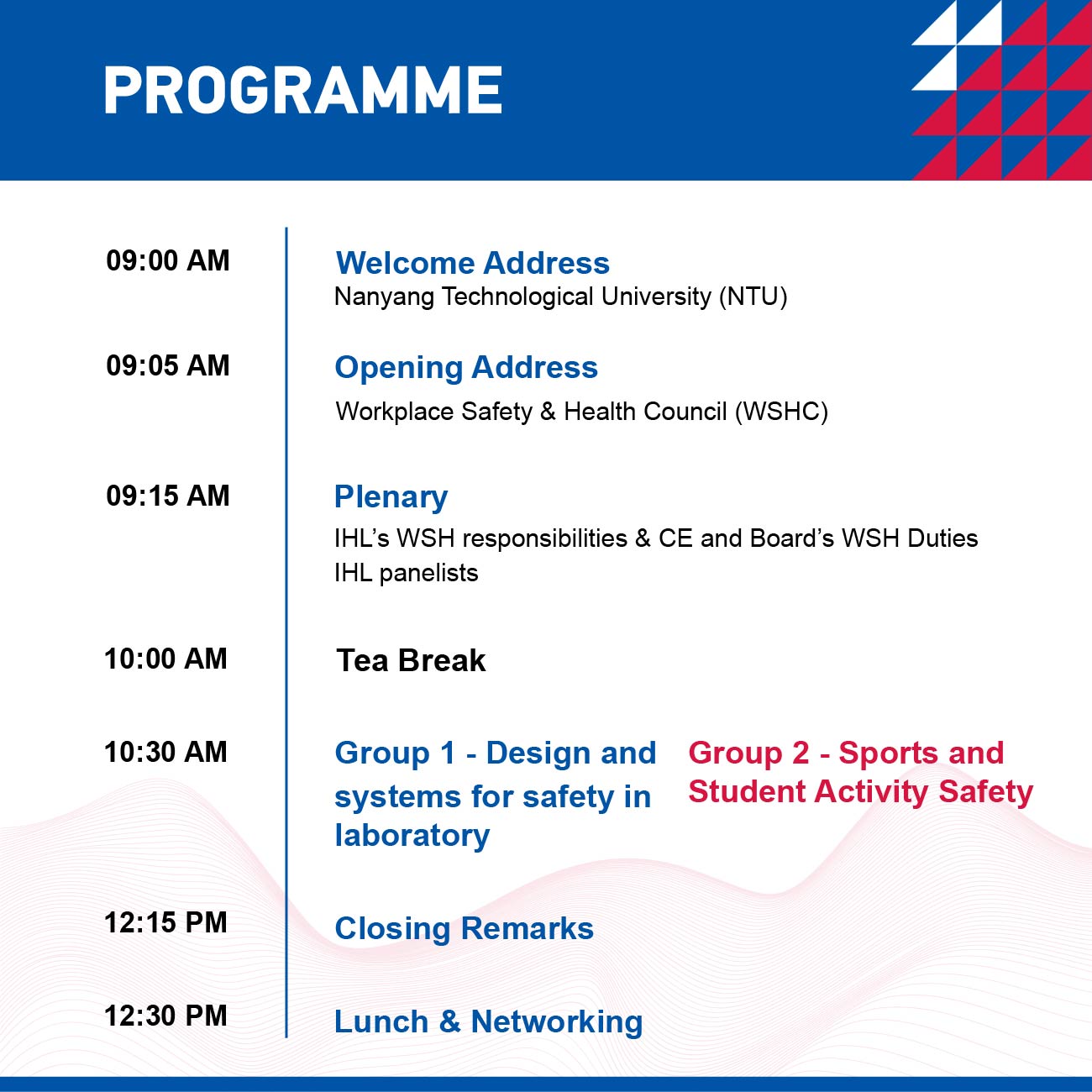 The WSH Council (Higher Education and Research) Working Group is pleased to announce an upcoming Safety & Health Forum scheduled for Thursday, 5 October 2023. The theme of the forum is “Creating a Stronger Safety & Health Culture: Key Success Factors and Practices”. We invite you to participate in this session, which aims to address emerging safety and health concerns while fostering the exchange of best practices among Institutes of Higher Learning.