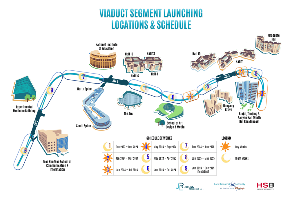 As part of the Jurong Region Line (JRL) MRT construction project, viaduct segment launching works will be carried out from end December 2023 until Q4 2025. Please see the infographic below for the schedule and location of the works.