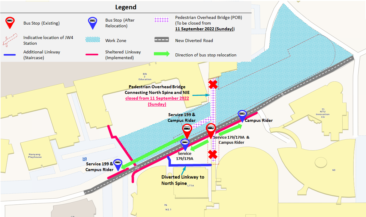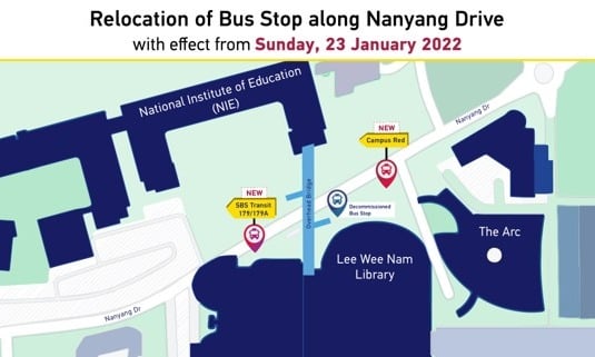 - To facilitate the construction of the Jurong Region Line's JW4 MRT station, the existing bus stop in front of Lee Wee Nam Library along Nanyang Drive will be relocated to two separate locations for campus shuttle buses and public bus services 179/179A respectively from Sunday, 23 January 2022.