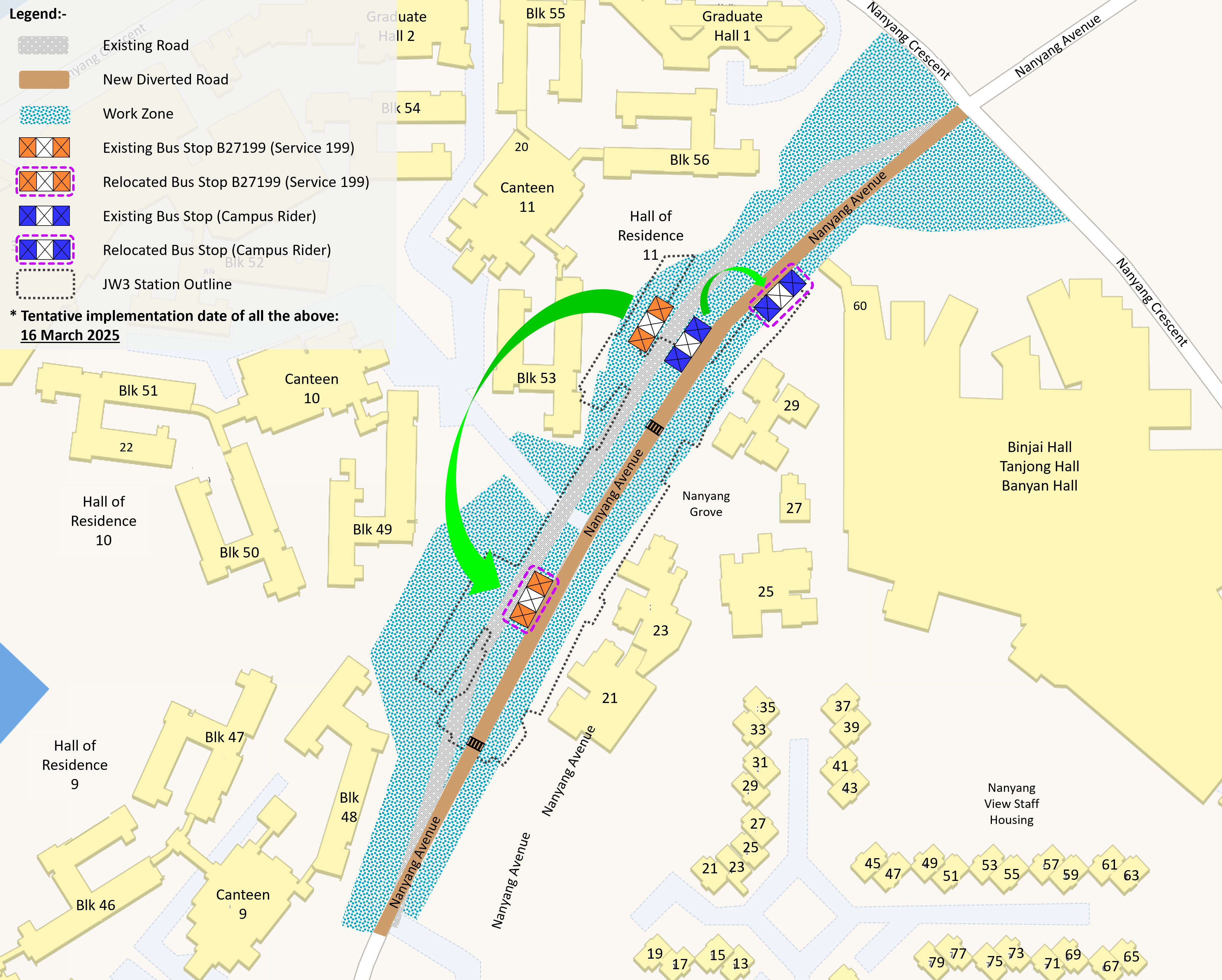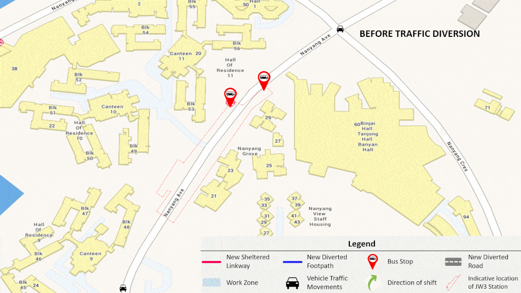 There will be traffic diversion and relocation of bus stops along Nanyang Avenue near Halls of Residence 10 and 11 with effect from 27 November 2022 (Sunday). This is to facilitate works on the viaduct and station structure for Jurong Region Line’s JW3 and JW4 MRT stations.
