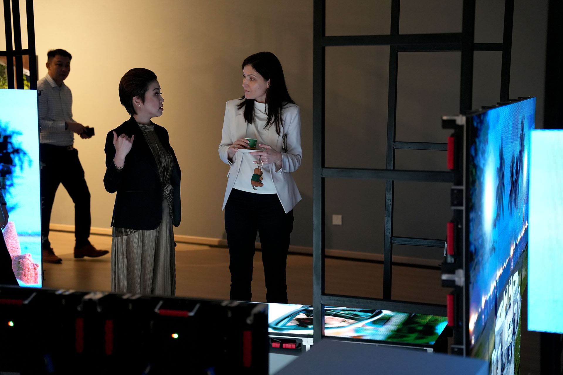 Unusually shaped LED screens are featured in this installation