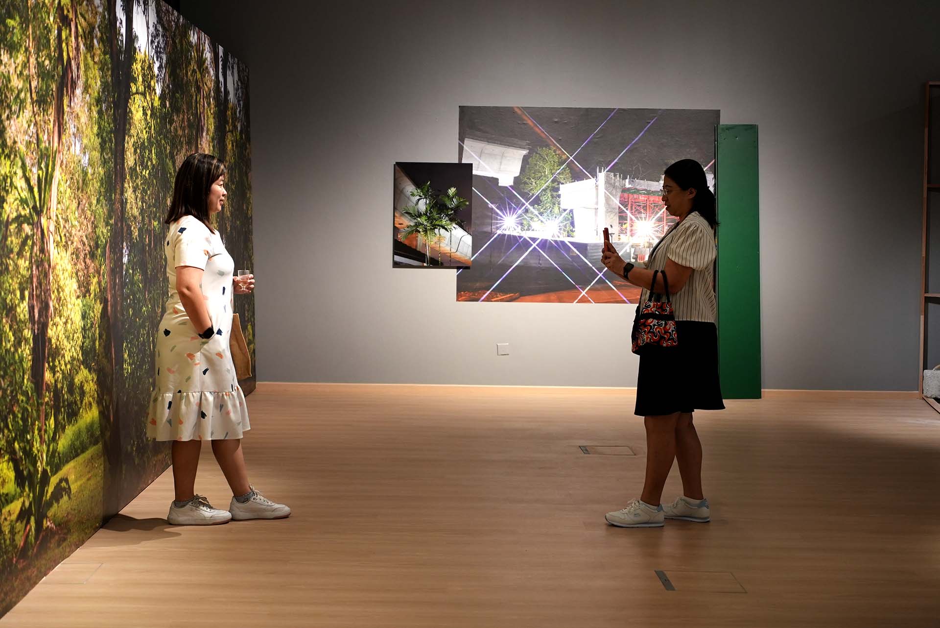 Further Reading investigates how urban construction shapes our encounters with nature, by examining the industry practice of featuring greenery images on construction hoardings. Tang presents photos and videos amidst an installation akin to a deconstructed construction site, aiming to “lift the veil” that construction hoardings serve. This invites viewers to observe and question the often-hidden processes behind these practices.