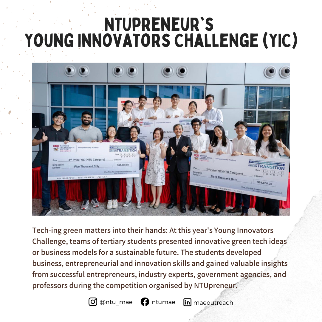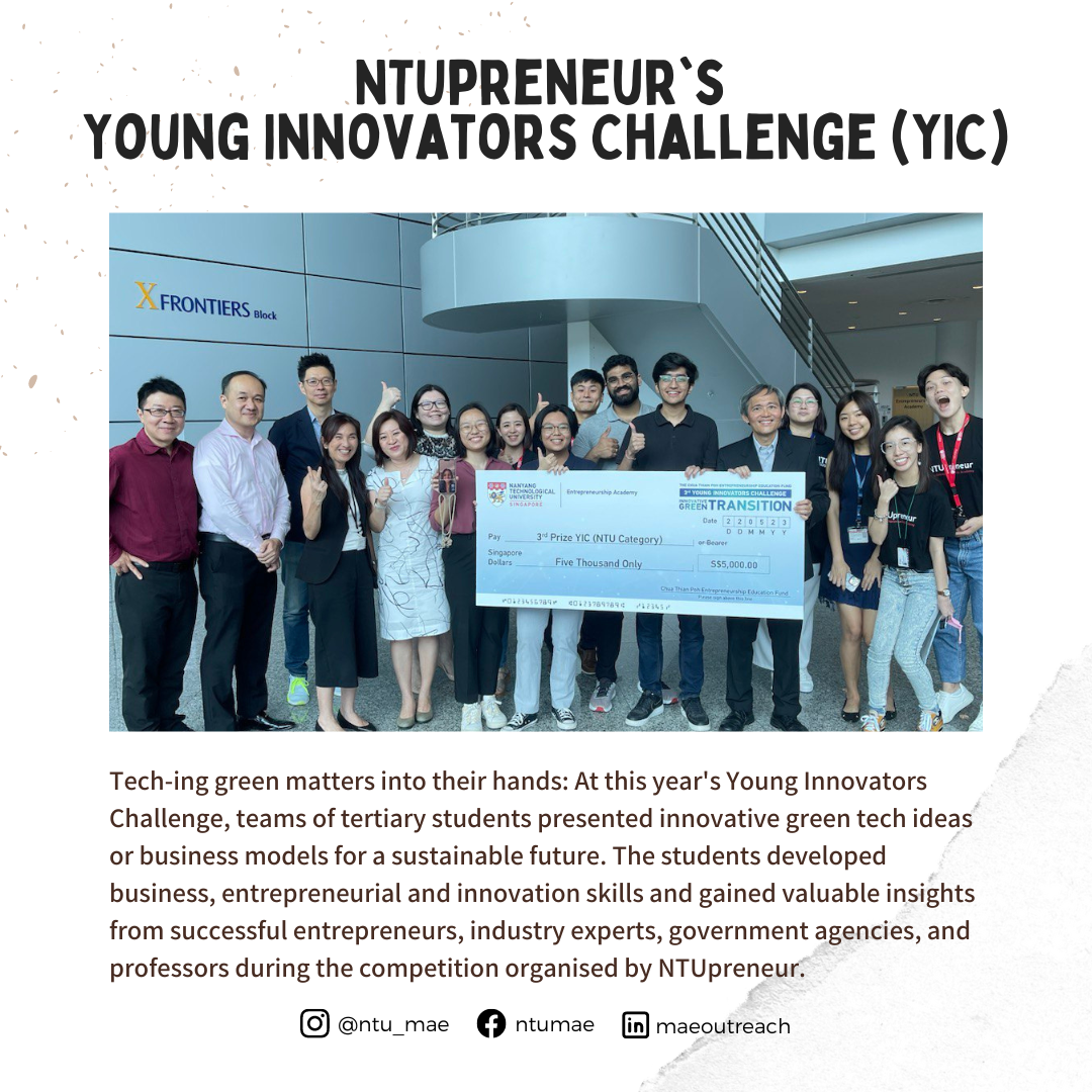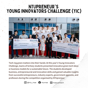 Tech-ing green matters into their hands: At this year's Young Innovators Challenge, teams of tertiary students presented innovative green tech ideas or business models for a sustainable future. The students developed business, entrepreneurial and innovation skills and gained valuable insights from successful entrepreneurs, industry experts, government agencies, and professors during the competition organised by NTUpreneur.