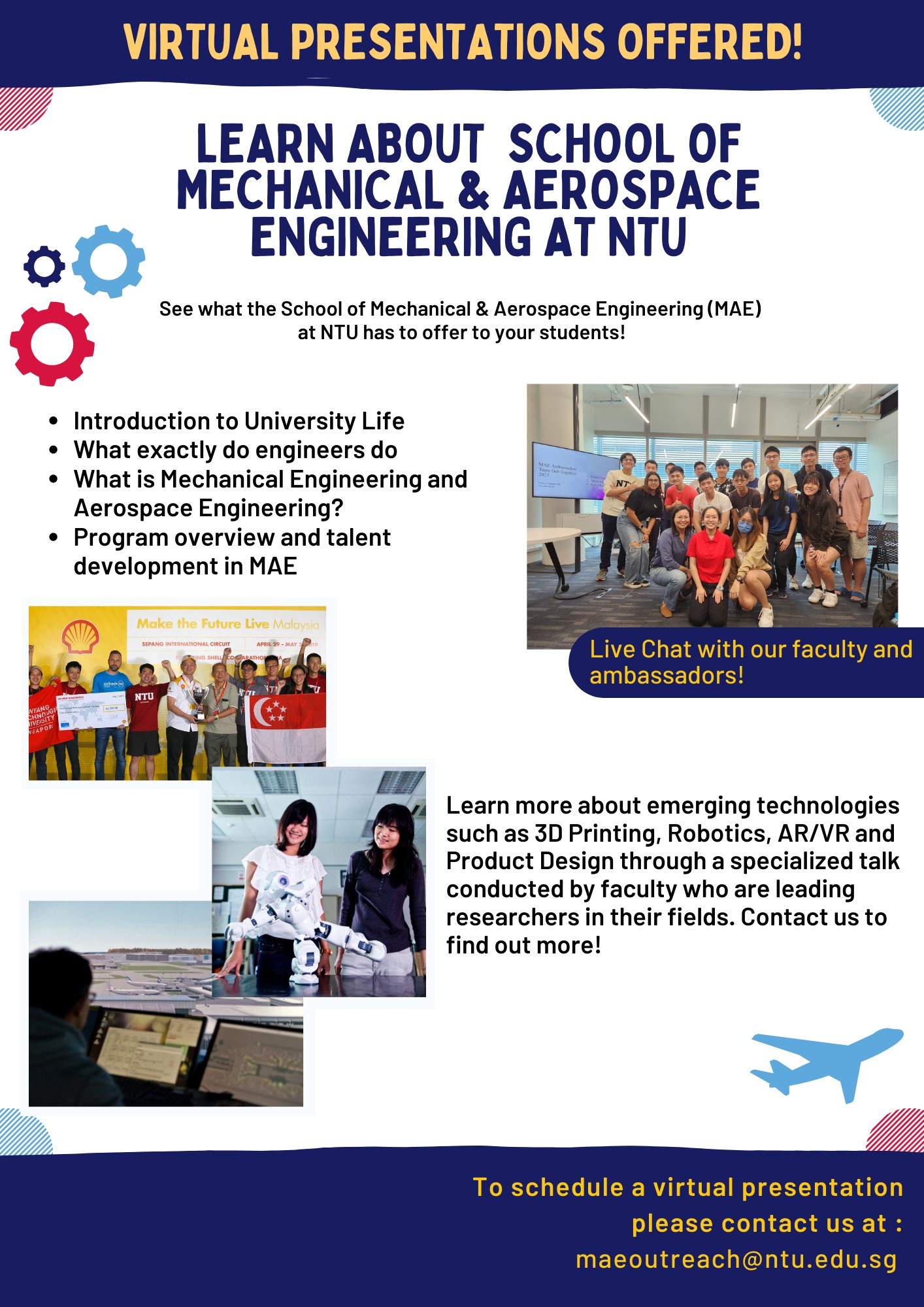 We invigorate and encourage prospective students in embarking their journey with NTU School of Mechanical and Aerospace Engineering.