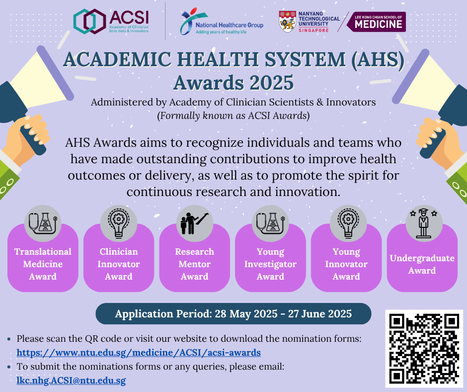 An annual effort to recognise individuals’ outstanding contributions in research and innovation, the Academy of Clinician Scientists & Innovators (ACSI) opened the call for nominations for the Academic Health System (AHS) Awards 2025 (formerly known as ACSI Awards) in Q2 of 2025. The winners were celebrated at the AHS Awards Ceremony, held on 29 September 2025 at LKCMedicine Clinical Sciences Building (CSB) Level 20 Flexi-Space.