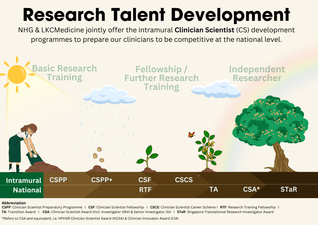 Guided by a comprehensive development roadmap, NHG builds up clinicians’ research capabilities through curated resources, training and guidance from experts, supporting them at different stages of their clinical / research career. The CS Development programmes are administered by the Clinician Scientist Development Office (CSDO), jointly supported by LKCMedicine.