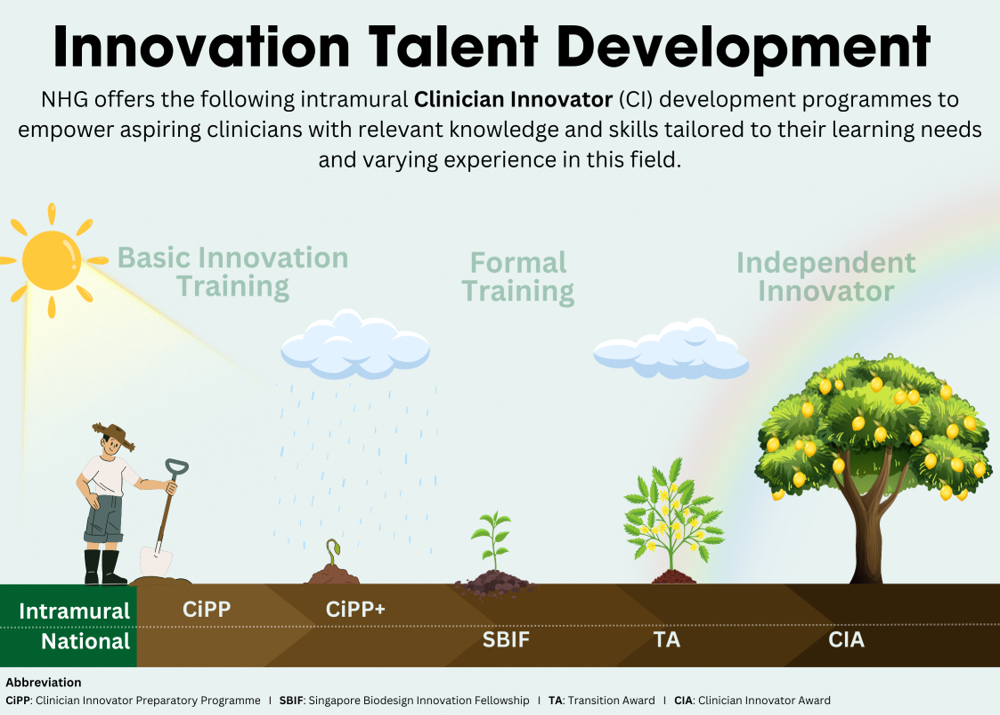 The CI Development programmes empower aspiring CIs with relevant knowledge and skills tailored to their learning needs and varying experience in this field. The programmes are overseen by the NHG Centre for Medical Technologies and Innovations (CMTi) and administered by the Clinician Scientist Development Office (CSDO).