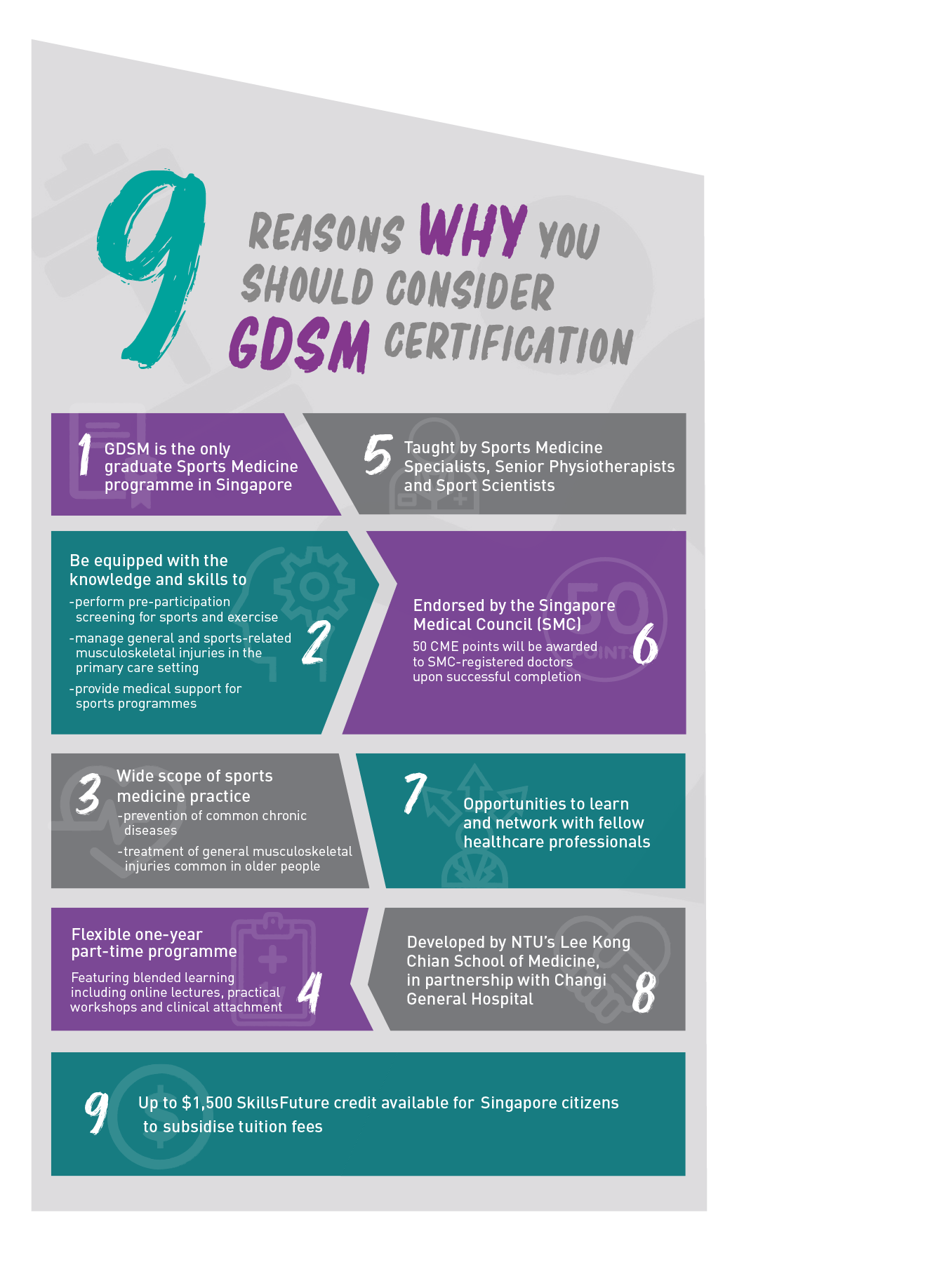 The Graduate Diploma in Sports Medicine (GDSM) programme, developed by LKCMedicine in partnership with the Singapore Sport & Exercise Medicine Centre @ Changi General Hospital (SSMC@CGH), is designed for medical doctors who are interested in extending their qualifications and training in this growing area of need.