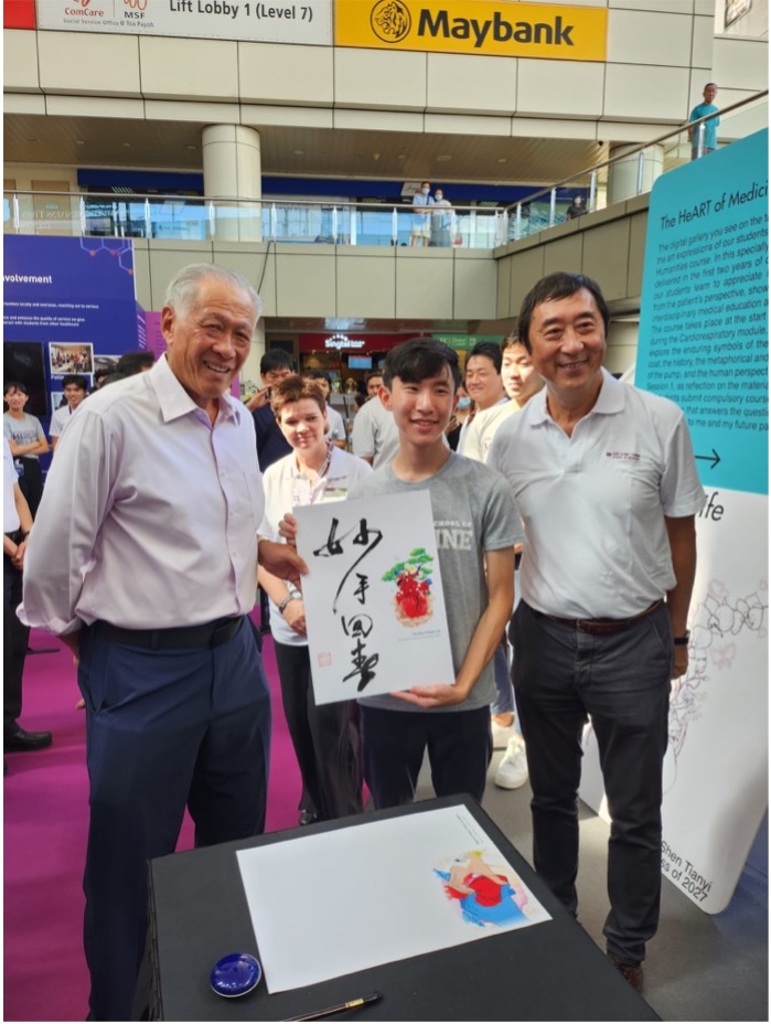To me, the most fascinating corner was the exhibition area showcasing the Art of Medicine, where our students displayed their wonderful drawings of the heart. These are artworks from their Medical Humanities course in which, through the use of colour and imagery, they conveyed the message that Medicine is very much a humanistic endeavour requiring empathy, optimism and sometimes a sense of humour. One of the drawings by our medical student was paired with my calligraphy, and presented to Minister Ng as a token of our appreciation for him gracing the festival.