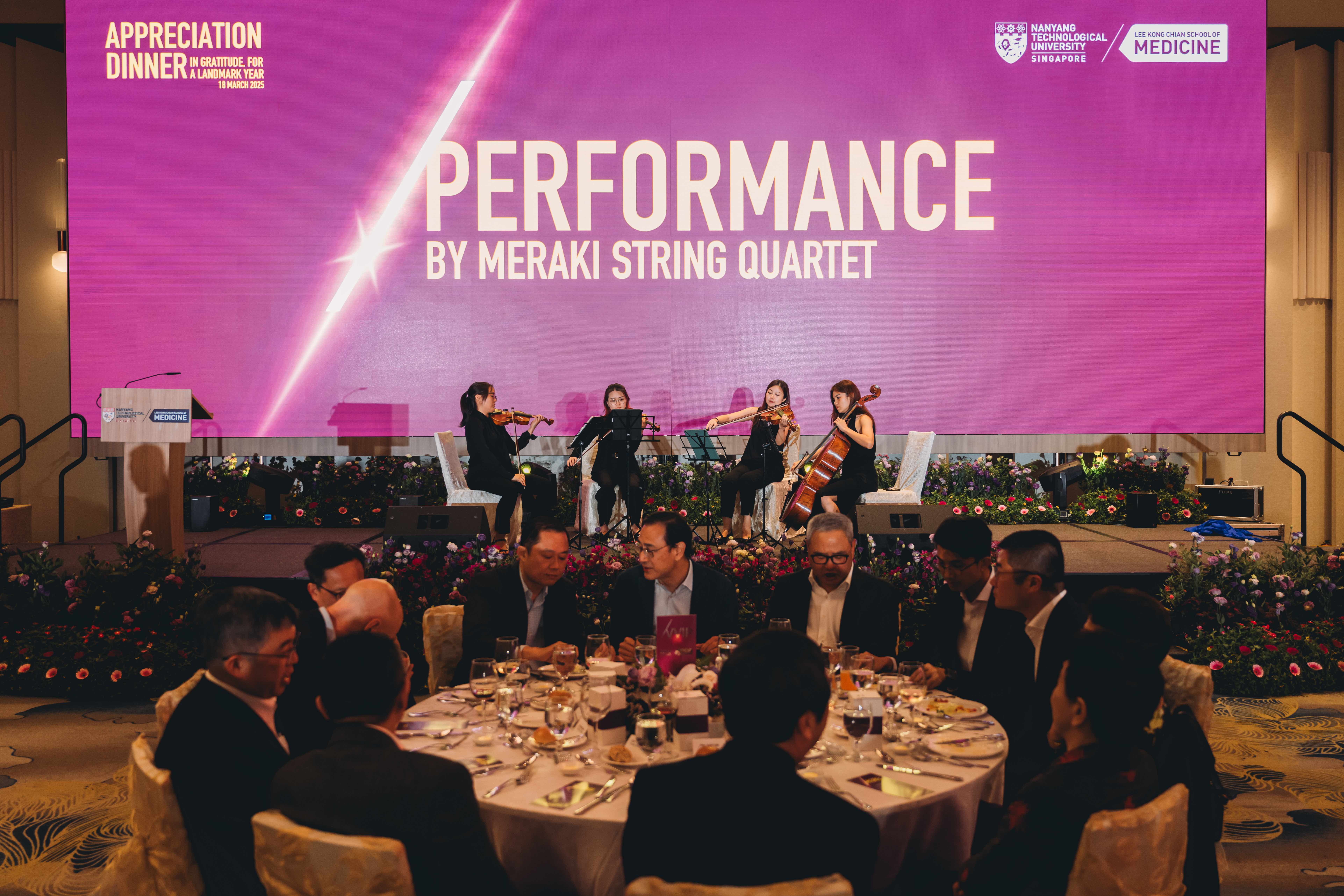 The evening’s performances culminated in a crowd-favourite moment—the appearance of MedLee, LKCMedicine’s student a cappella group who sang a catchy set, with infectious charisma and tight harmonies. Their energy lit up the room, drawing enthusiastic cheers and audience singalongs. MedLee’s performance captured the heart of the School’s spirit—youthful, passionate, and united. Their energetic setlist had guests smiling, swaying, and singing along.