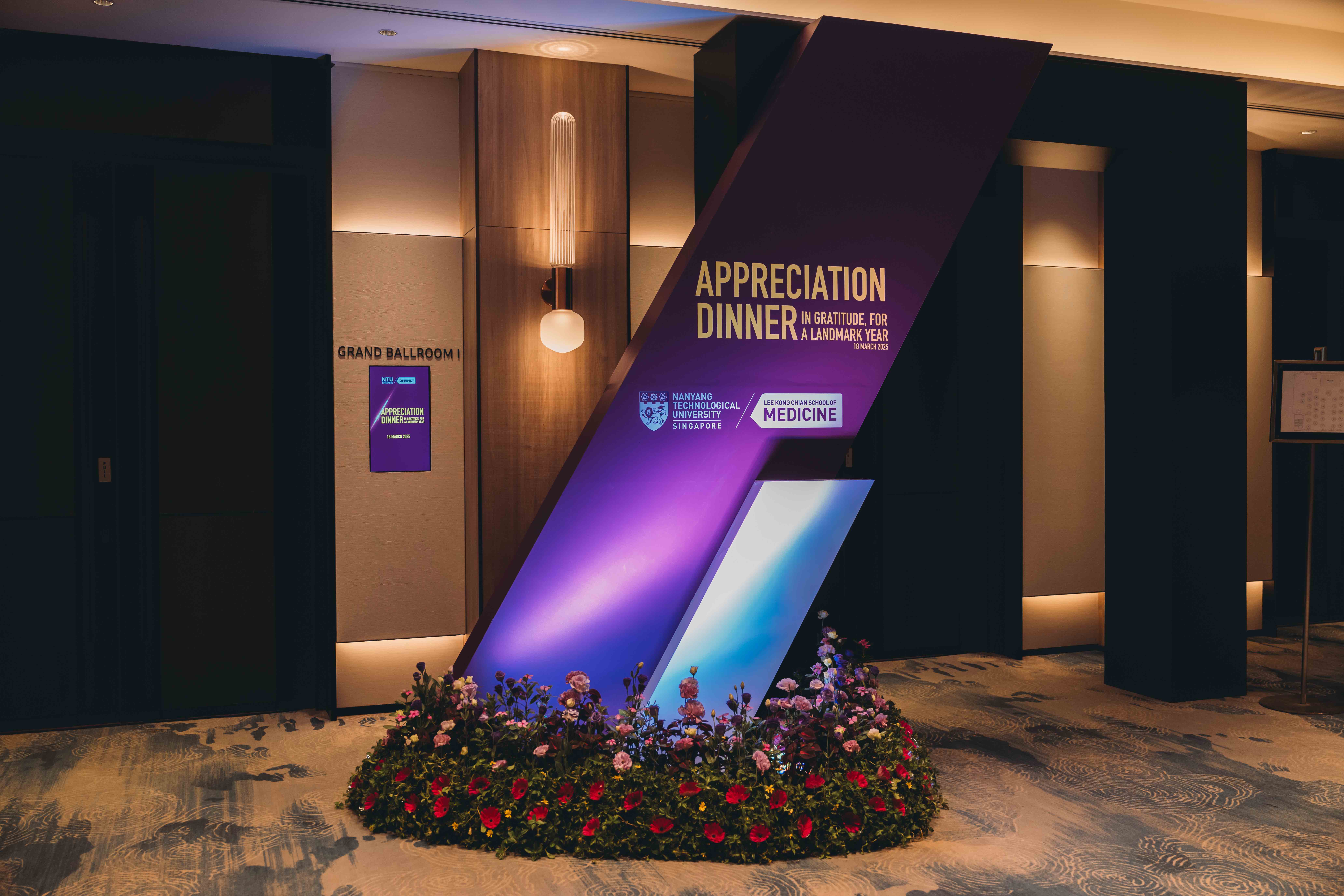 Guests were greeted by a striking entry sculpture designed to reflect LKCMedicine’s refreshed logo—an eye-catching installation that served as a popular photo backdrop and symbol of the School’s refreshed identity. Positioned at the ballroom entrance, the vibrant structure drew guests in and quickly became a go-to spot for group photos and selfies.