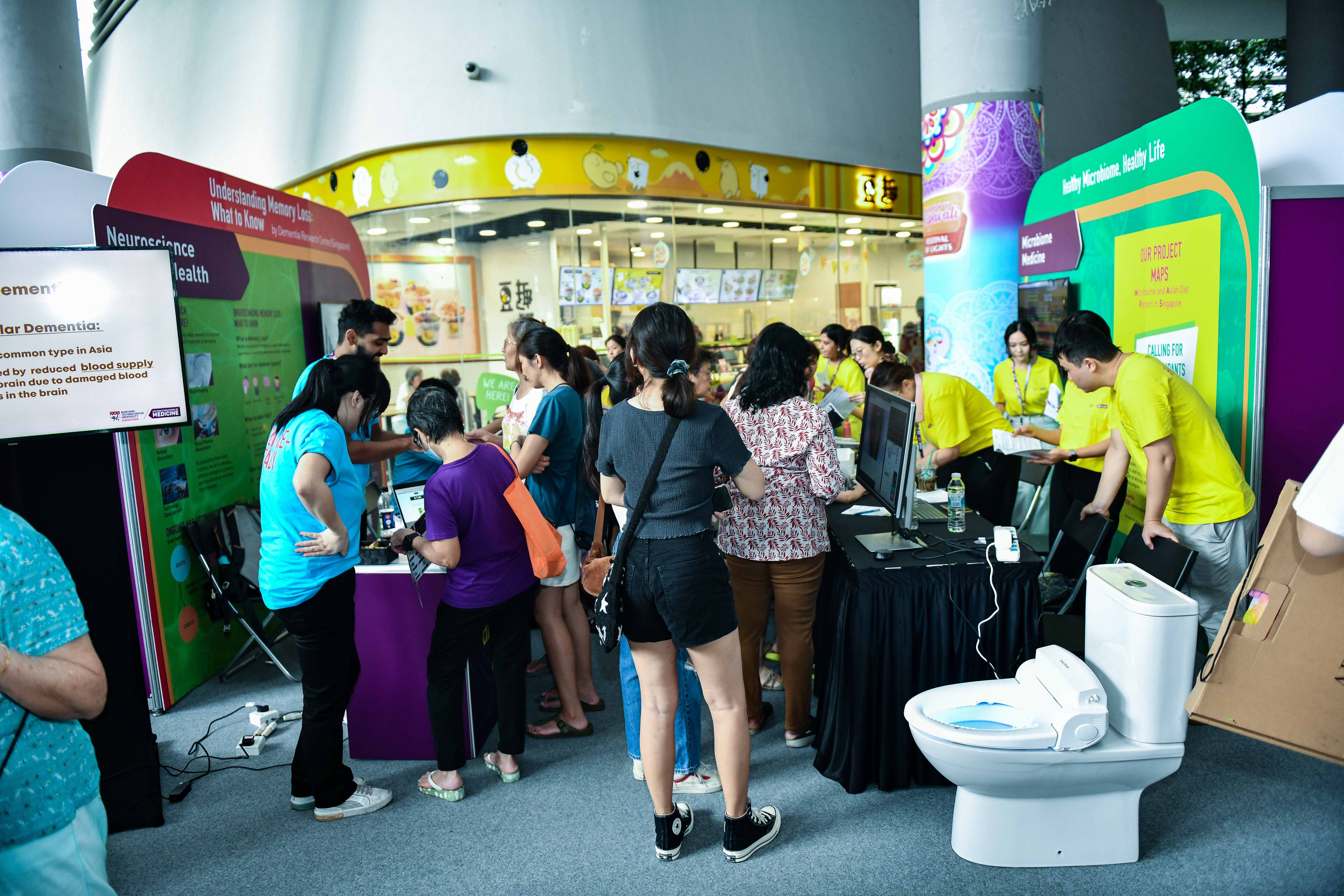 LKCMedicine’s newly set up Office of Patient Engagement (OPEN) invited visitors to engage in conversations about how ordinary people have an impactful role to play in research studies. At the Microbiome Medicine booth, visitors had the unusual but fun experience of testing a mock AI toilet that provided information about the user’s gut health. This was then followed by a questionnaire about their digestive health and some useful tips from our researchers. The Cancer Discovery and Regenerative Medicine team showcased their work in cancer genesis and therapy as well as organoid research; Data Science and AI booth demonstrated the potential of biomedical data through cutting-edge analytics and AI methodologies; while the Dementia Research Centre (Singapore) and Brain Bank booths stressed the importance of early intervention for neurological conditions.