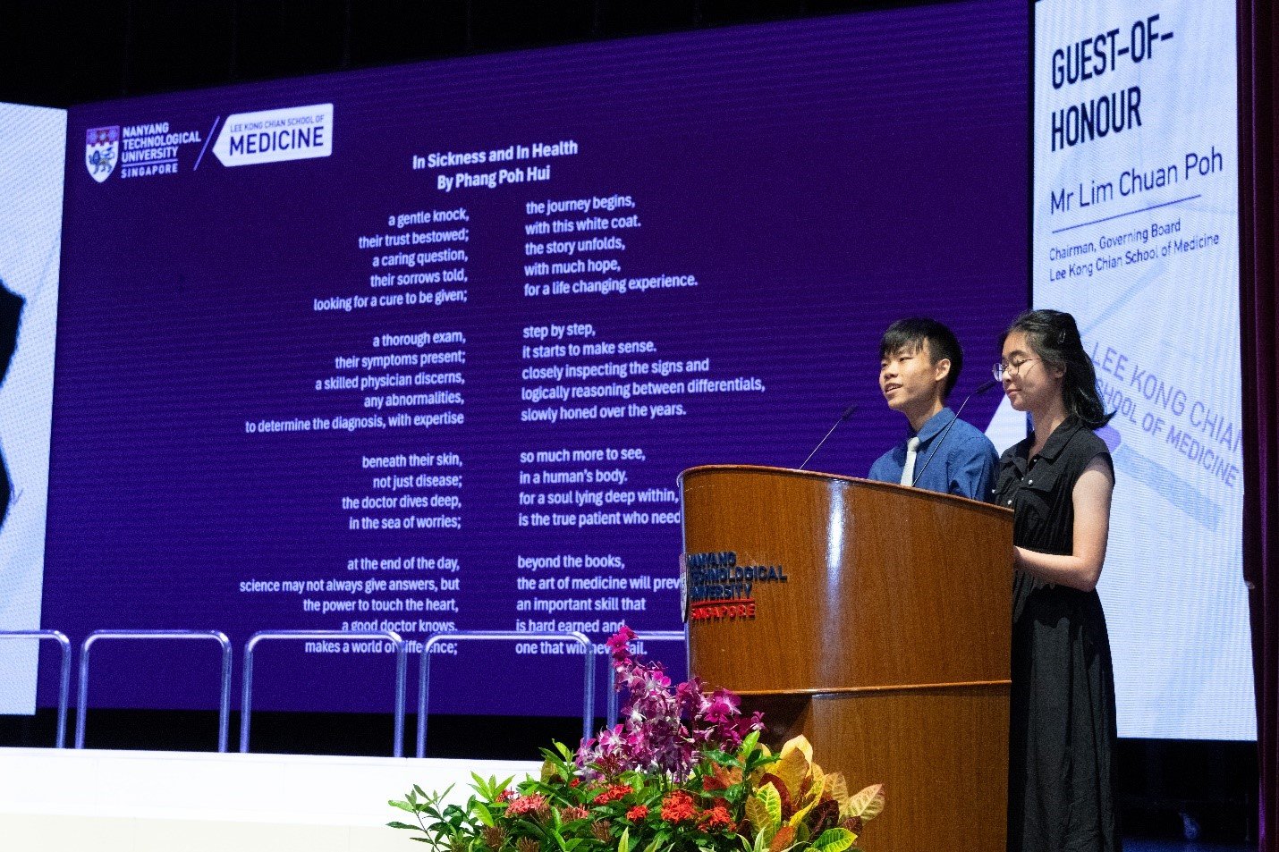 This year’s White Coat Ceremony featured the chosen poem “In Sickness and in Health”, written by Year 3 student Phang Poh Hui, which was recited by Year 2 students Emily Ho and Koh Kai Yi. Written in a “twin cinema form”, the poem talks of two perspectives (in two columns), that of a patient, and a medical student, and lessons learnt. When read together, the lines paint the picture of a doctor’s experience and reflections on interacting with patients.