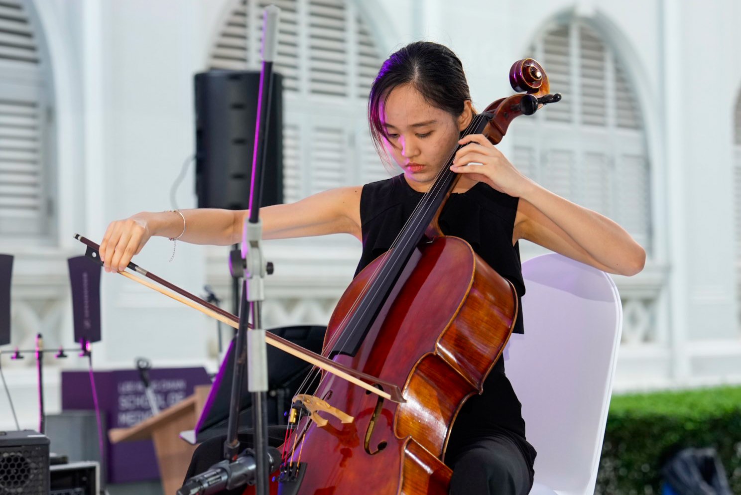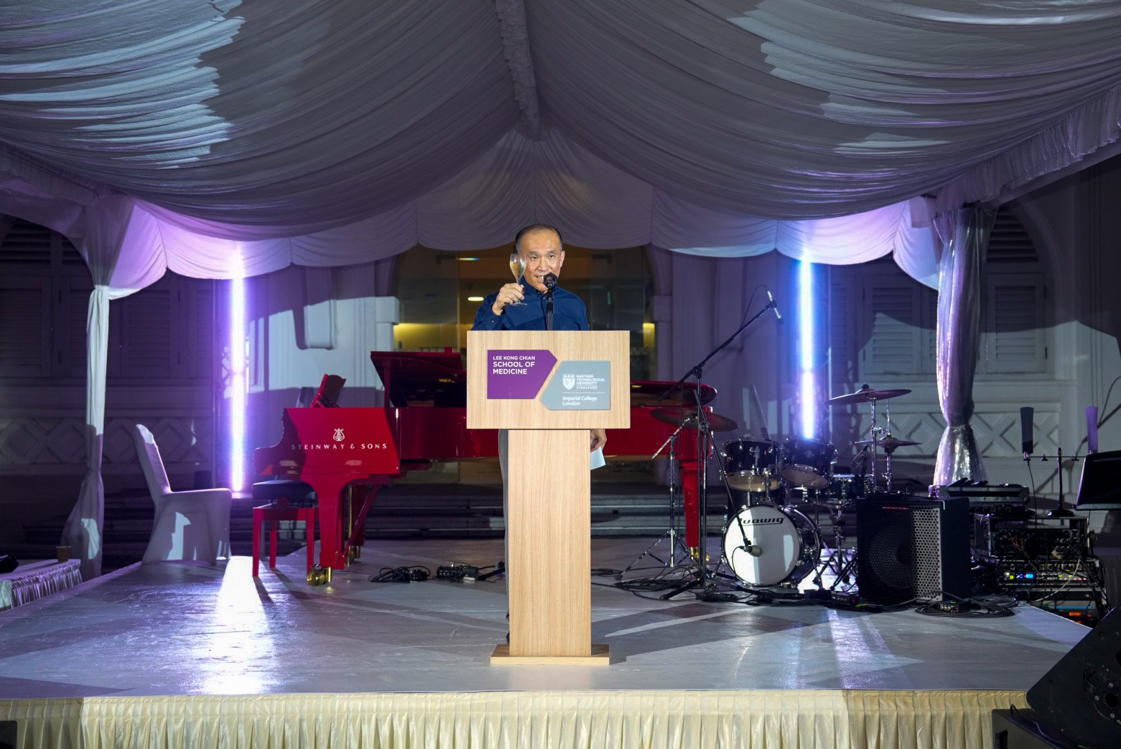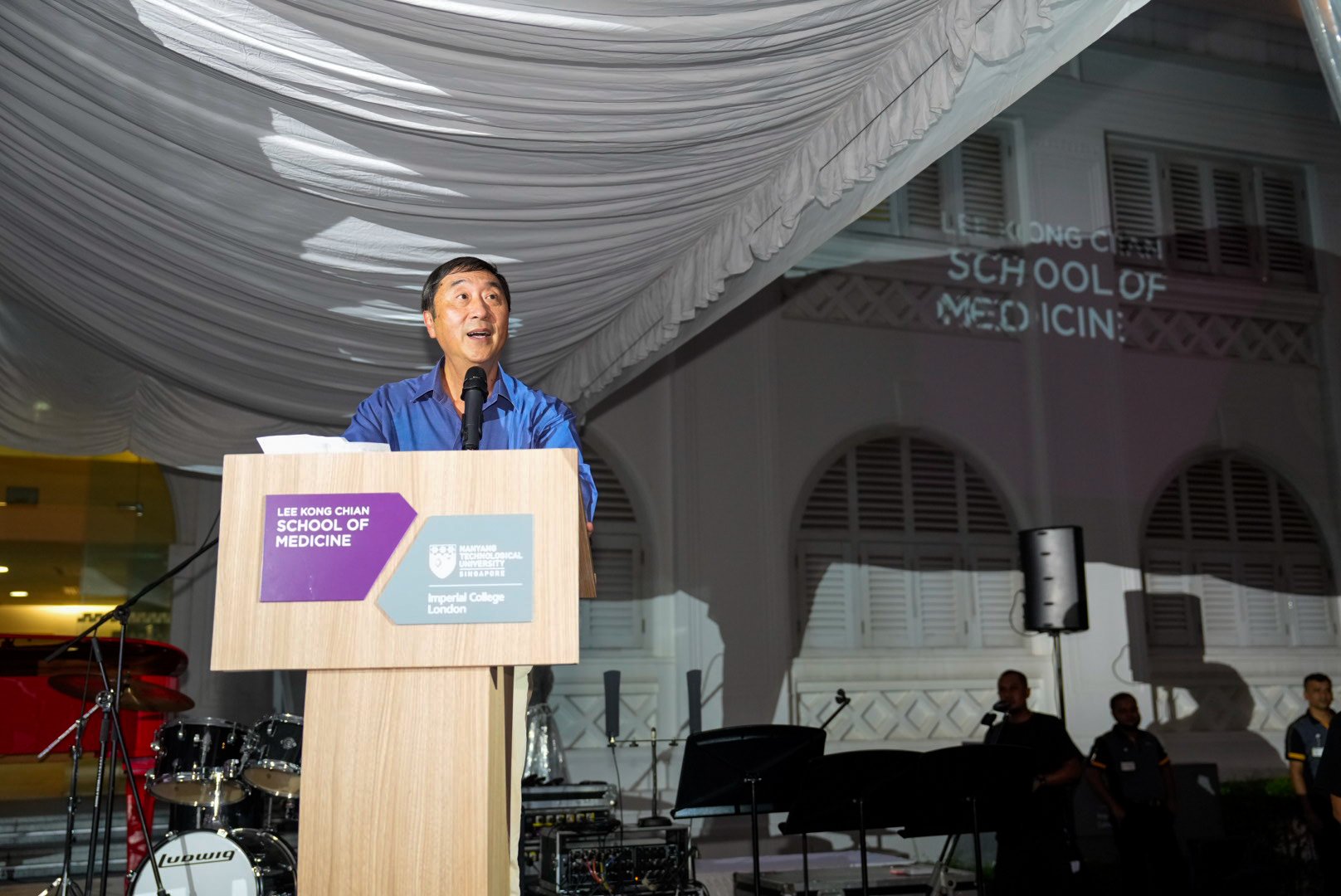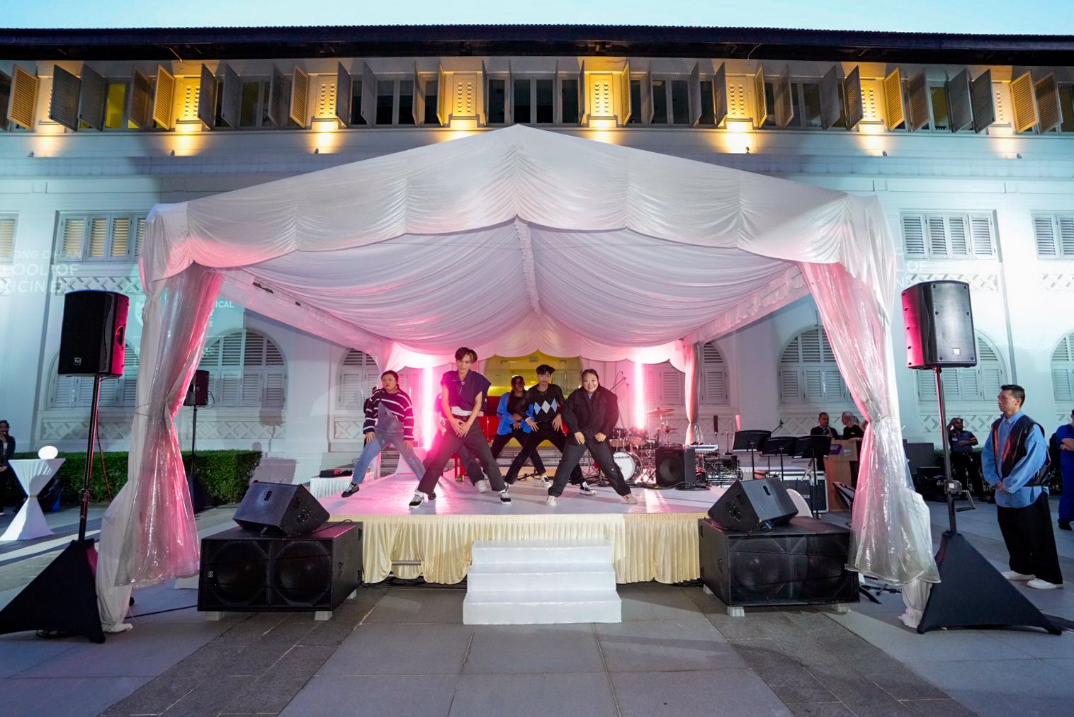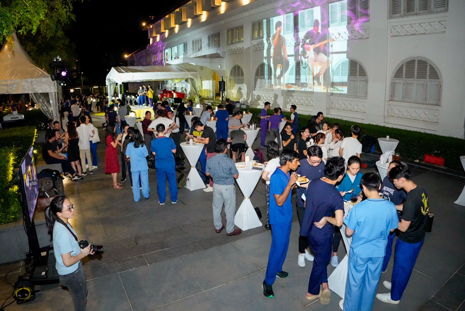 While invitees mingled and dined, they were also treated to performances throughout the evening, ranging from NTU Symphony Orchestra’s rendition of Mozart’s and Vivaldi’s compositions to pop songs by LKCMedSoc’s very own talented singers and musicians. This was complemented by a spectacular lightshow on the HQ building, illuminating it in a kaleidoscope of stunning lights and images of LKCMedicine students and activities over the years.