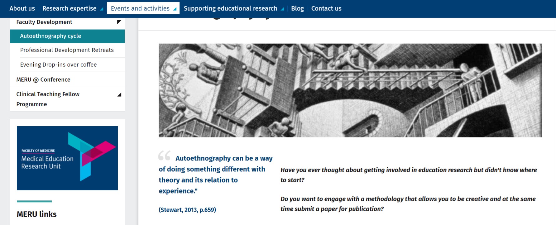 For more information please visit: https://www.imperial.ac.uk/medicine/meru/events-activities/faculty-development/autoethnography-cycle/