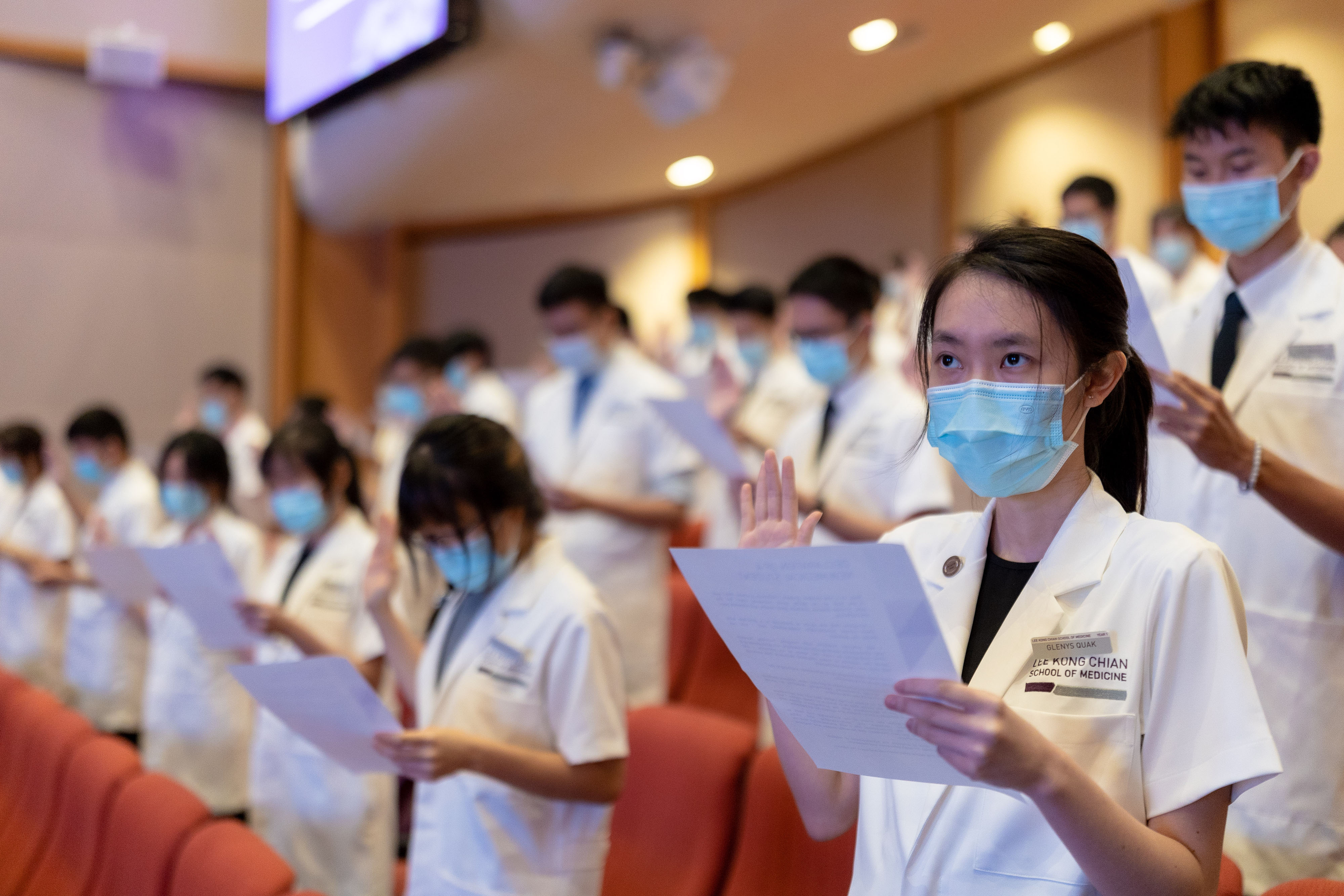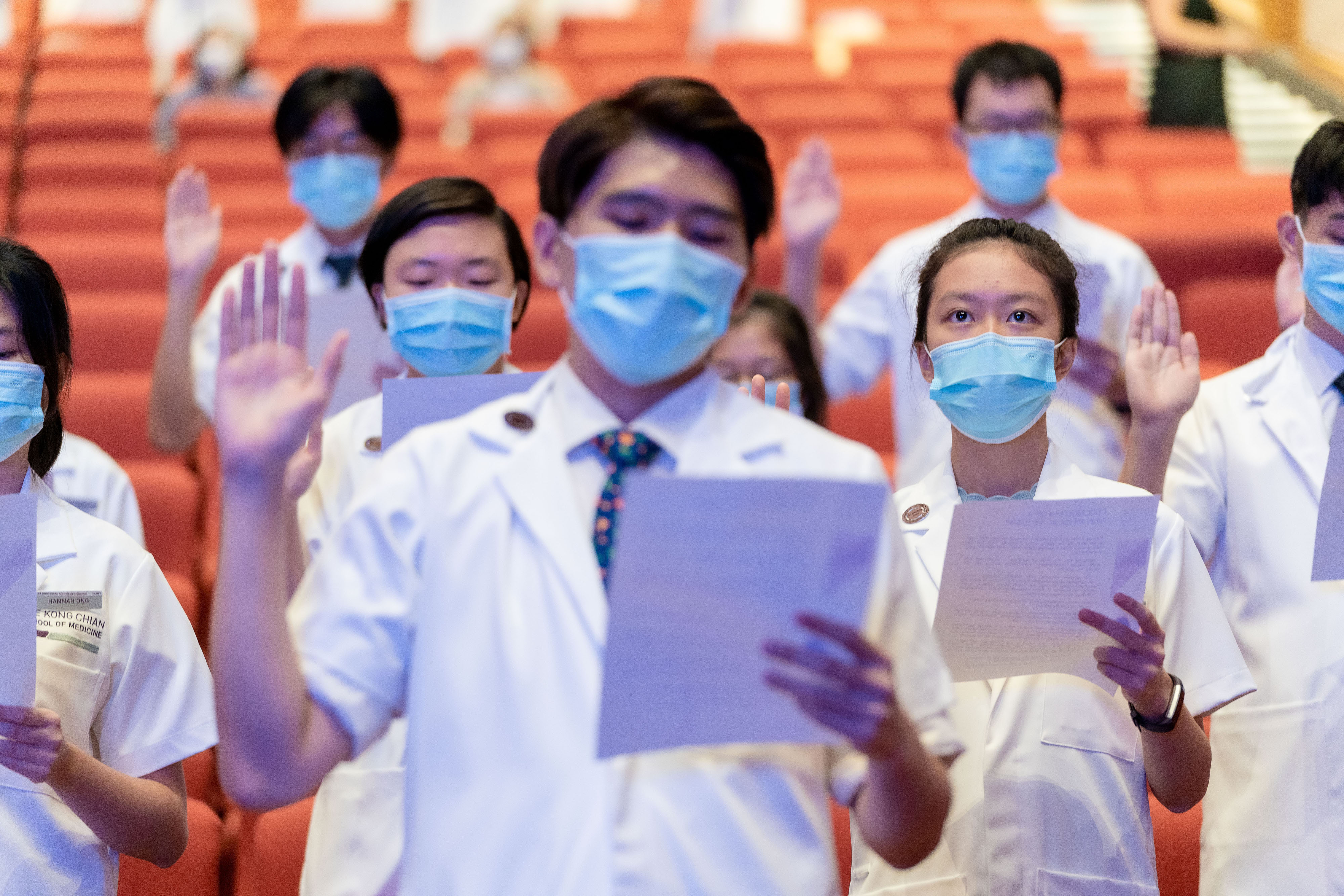 With safe distancing measures in place, LKCMedicine was able to resume the in-person ceremony at the Nanyang Auditorium. Students were grouped in their respective Houses with masks on throughout the event while family and friends witnessed the momentous occasion through a livestream.