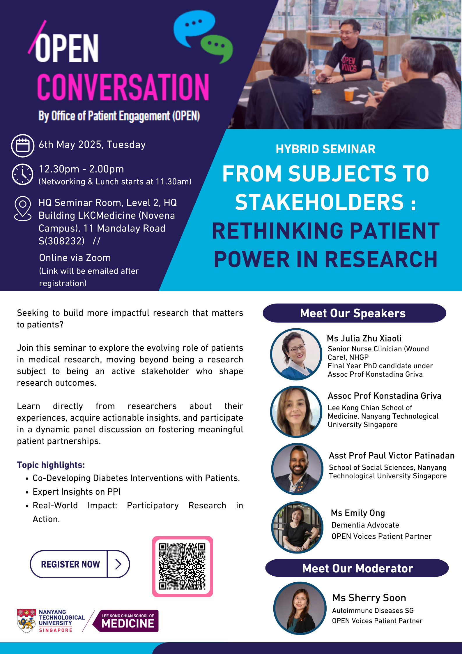 Join us for an engaging OPEN Conversation seminar, "From Subjects to Stakeholders: Rethinking Patient Power in Research," on Tuesday, 6th May 2025. This seminar will explore the evolving role of patients in medical research, focusing on their transition from research subjects to active stakeholders who influence research outcomes.