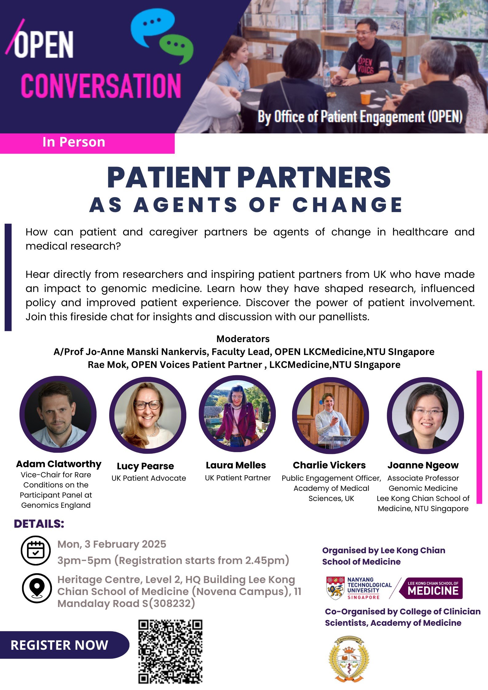 This year, we kick off with an exclusive in-person seminar, “Patient Partners as Agents of Change”, featuring a Clinician Scientist and truly inspiring patient partners from the UK and Singapore on the impact of patient involvement in genomic medicine. We are pleased to co-organise this seminar with the College of Clinician Scientists, Academy of Medicine, Singapore.