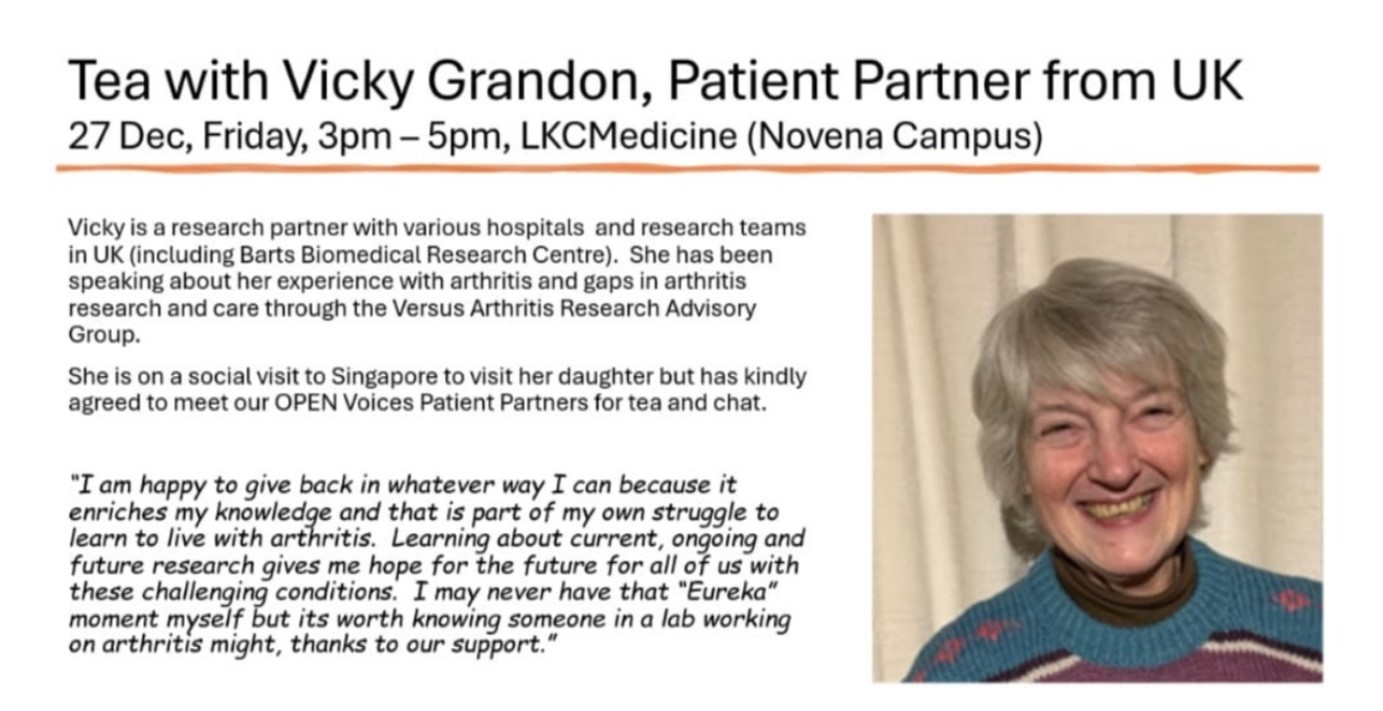 OPEN Voices Patient Partners had an engaging chat with Vicky Grandon, a patient partner with hospitals and research teams in the UK. Attendees discussed the joys and challenges of being a patient partner and how to collaborate with researchers to enrich medical science. This is the first “Tea with…” series organised by OPEN.
