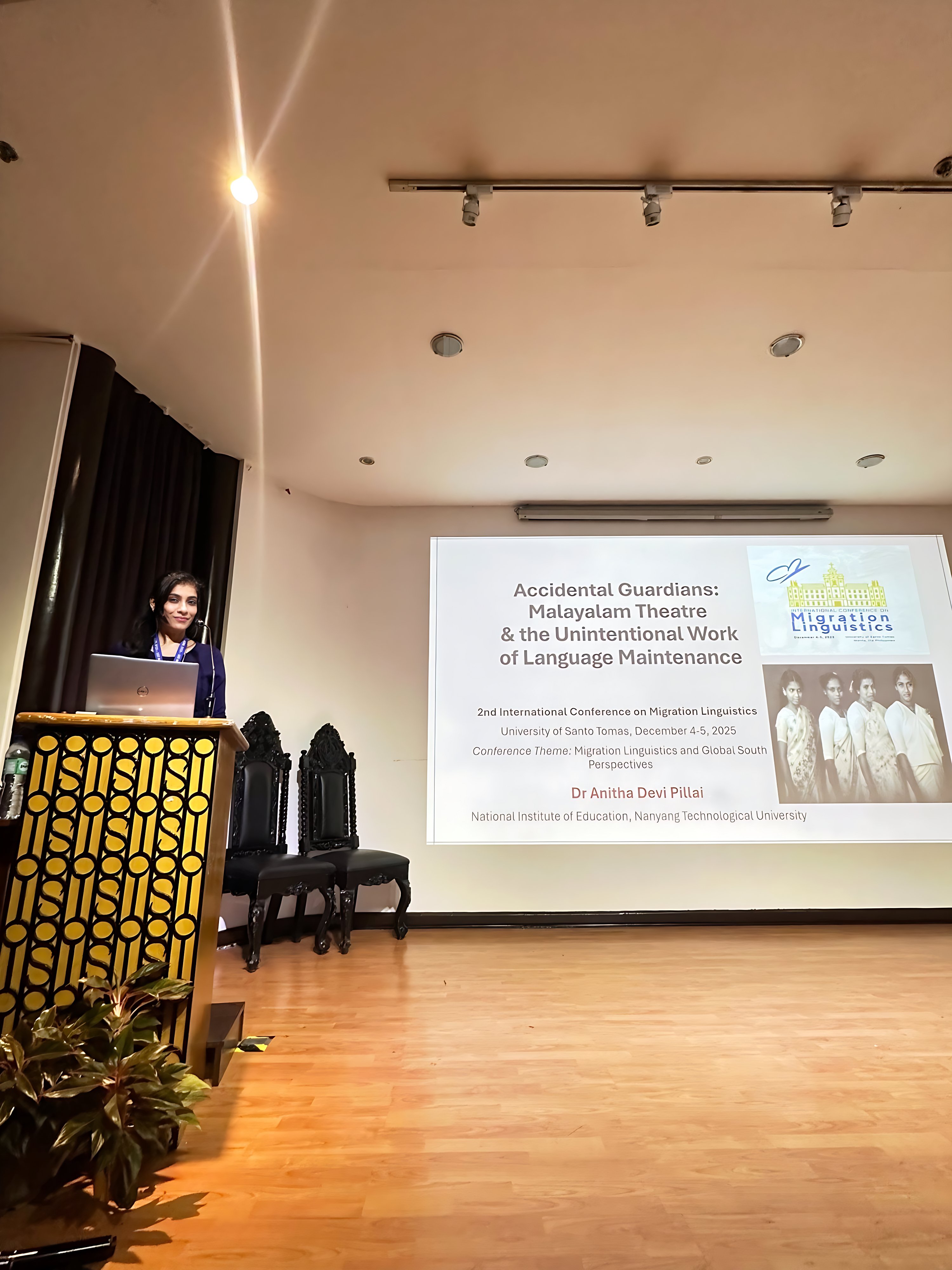 Dr Anitha Devi Pillai delivered an invited plenary address at the 2nd International Conference on Migration Linguistics, held on 4–5 December 2025. Her talk, titled “Accidental Guardians: Malayalam Theatre & the Unintentional Work of Language Maintenance,” drew on two decades of ethnographic research with the Singapore Malayalee community.