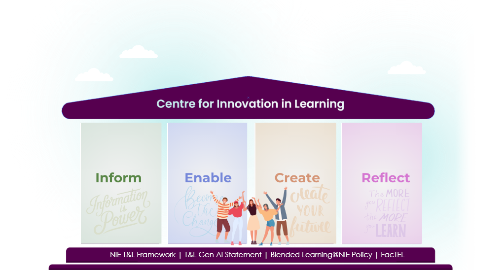 At IN-Learning, we champion our faculty every step of the way through our four core pillars: Inform, Enable, Create, and Reflect. Designed to meet them where they are, our initiatives nurture growth, ignite fresh teaching ideas, and empower faculty to make a real, lasting impact on teaching and learning. Together, these pillars fuel their journey to innovate with confidence and lead meaningful change within NIE’s vibrant educational community.