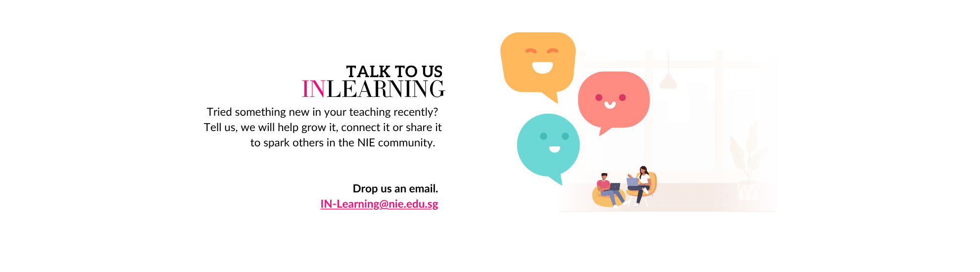 Exploring innovative solutions for your teaching and learning? Free free to drop by the IN-Learning office at block 2 for a chat with our IN-Learning folks over coffee! Let’s explore how we can collaborate to bring our ideas to life at NIE.