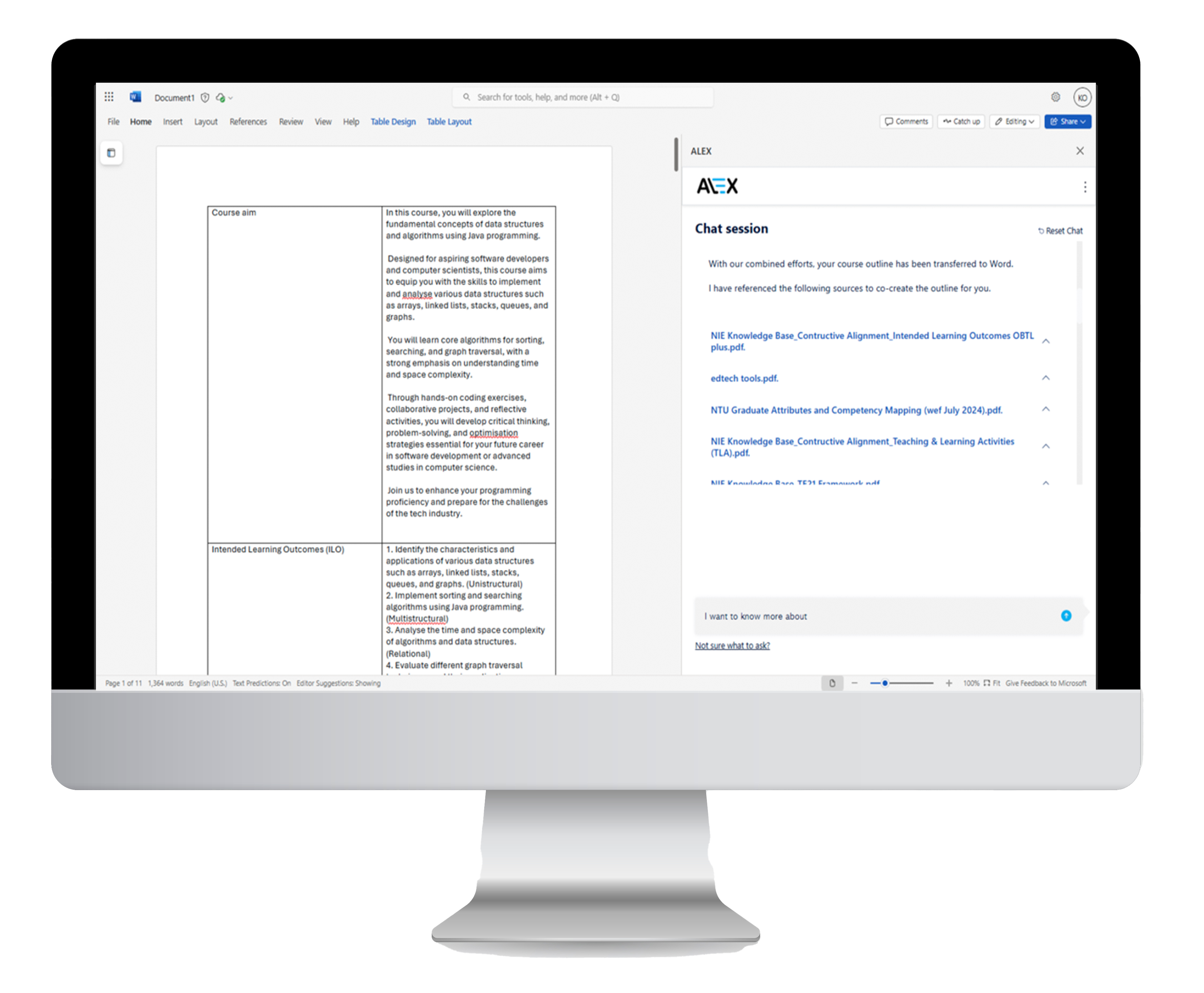 ALEX is a Generative AI-powered Microsoft Word add-in developed by NIE in collaboration with Microsoft. Integrated directly into Word, it enables faculty to generate contextually aligned course outlines within minutes. Powered by OpenAI’s GPT-4o, ALEX combines human expertise with AI efficiency to make course design faster and smarter.