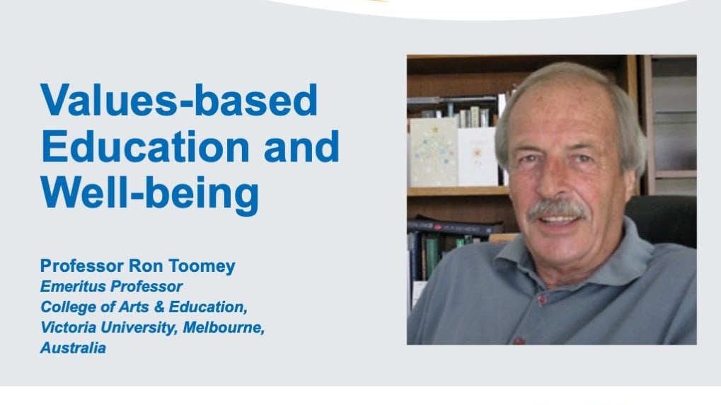 ![]() | Values-based Education and Well-beingThis three-part presentation will draw on Prof Toomey's work with the Australian Government’s Values Education Research Project and his subsequent research on Values-based Education (VbE). |