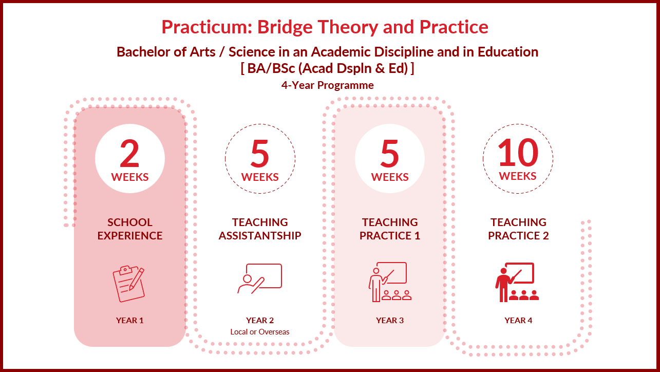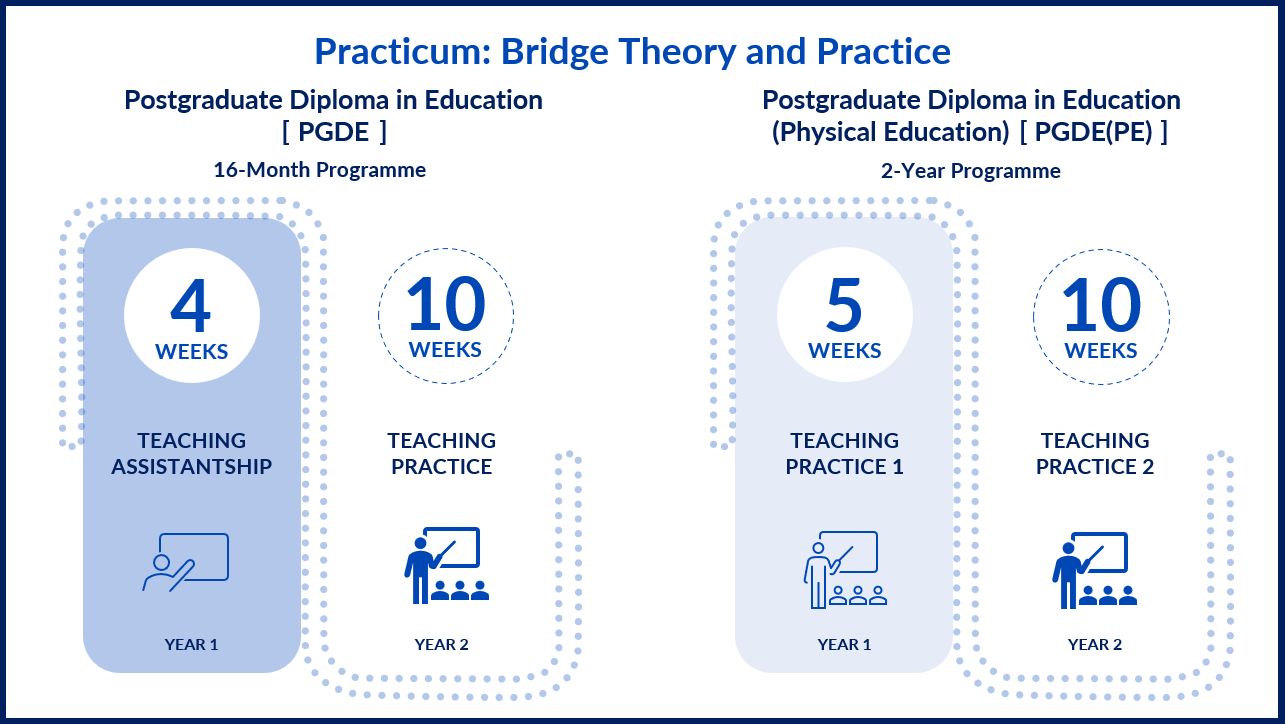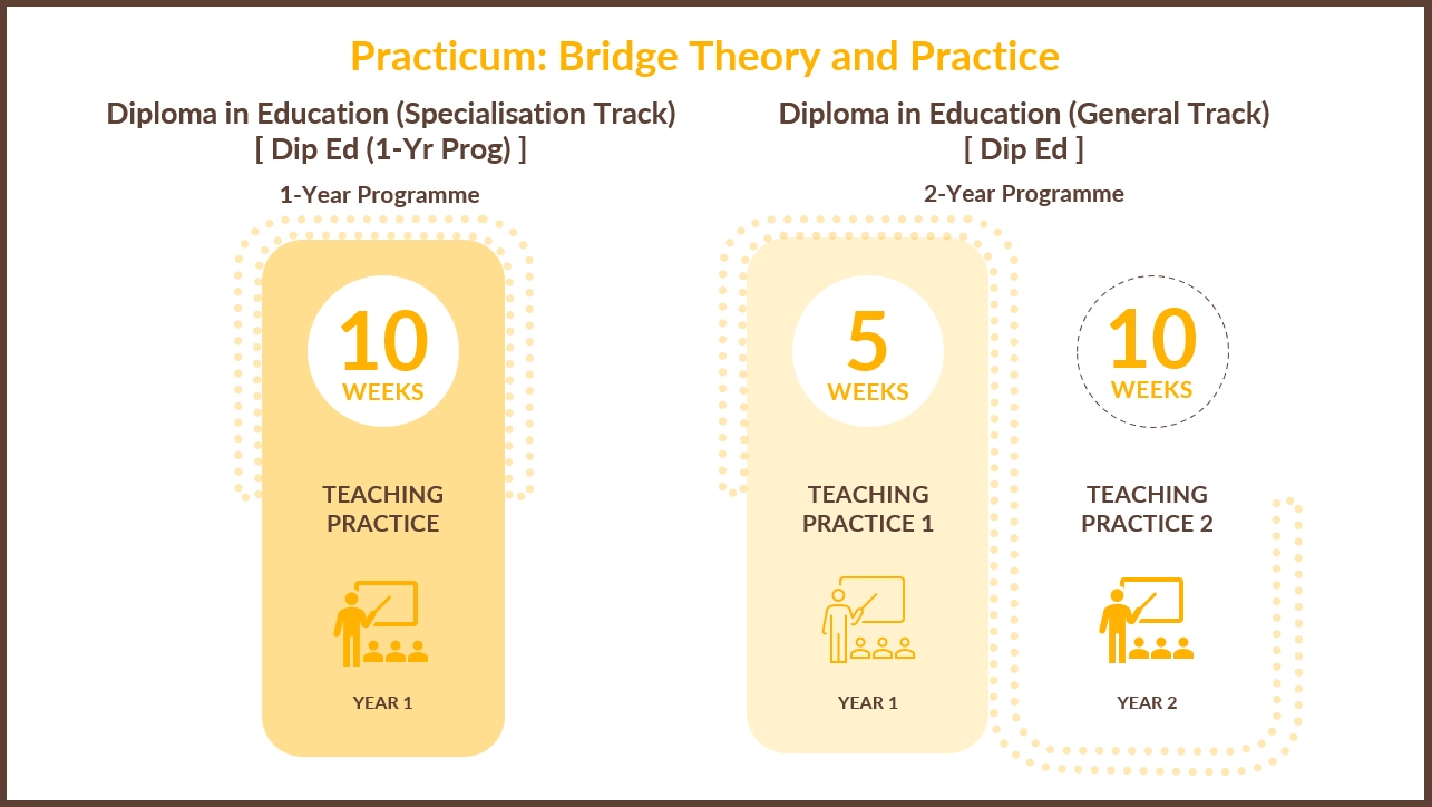 The practicum enables student teachers to acquire beginning teaching competencies and is a core component of the Initial Teacher Preparation programme in NIE. The purpose of the practicum is to help prepare student teachers for the realities of student teaching by providing them with a clear understanding of the contexts for schooling.