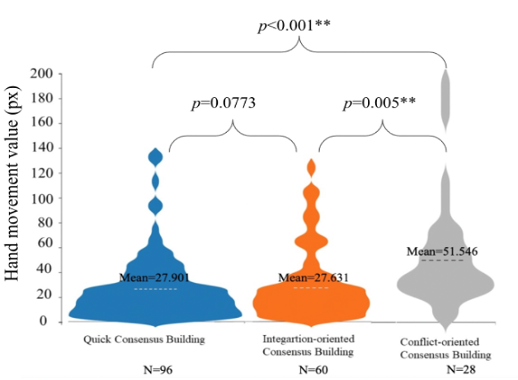- Students applied significantly more hand movement in conflict-oriented consensus building than quick consensus building.