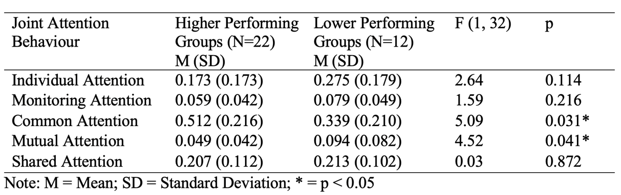 - Higher performing groups tended to pay more joint attention to their own screens (Common Attention) than lower performing groups;