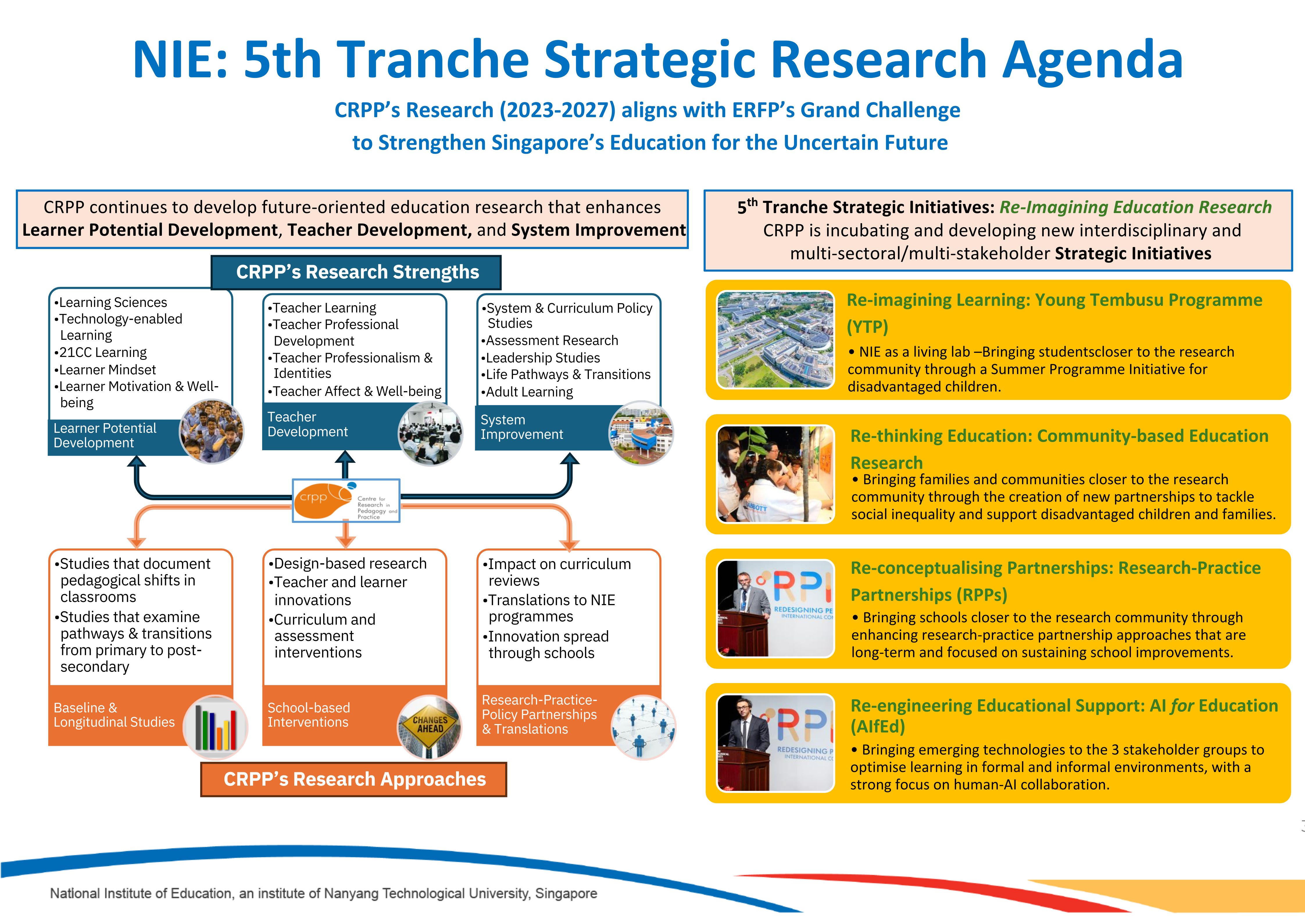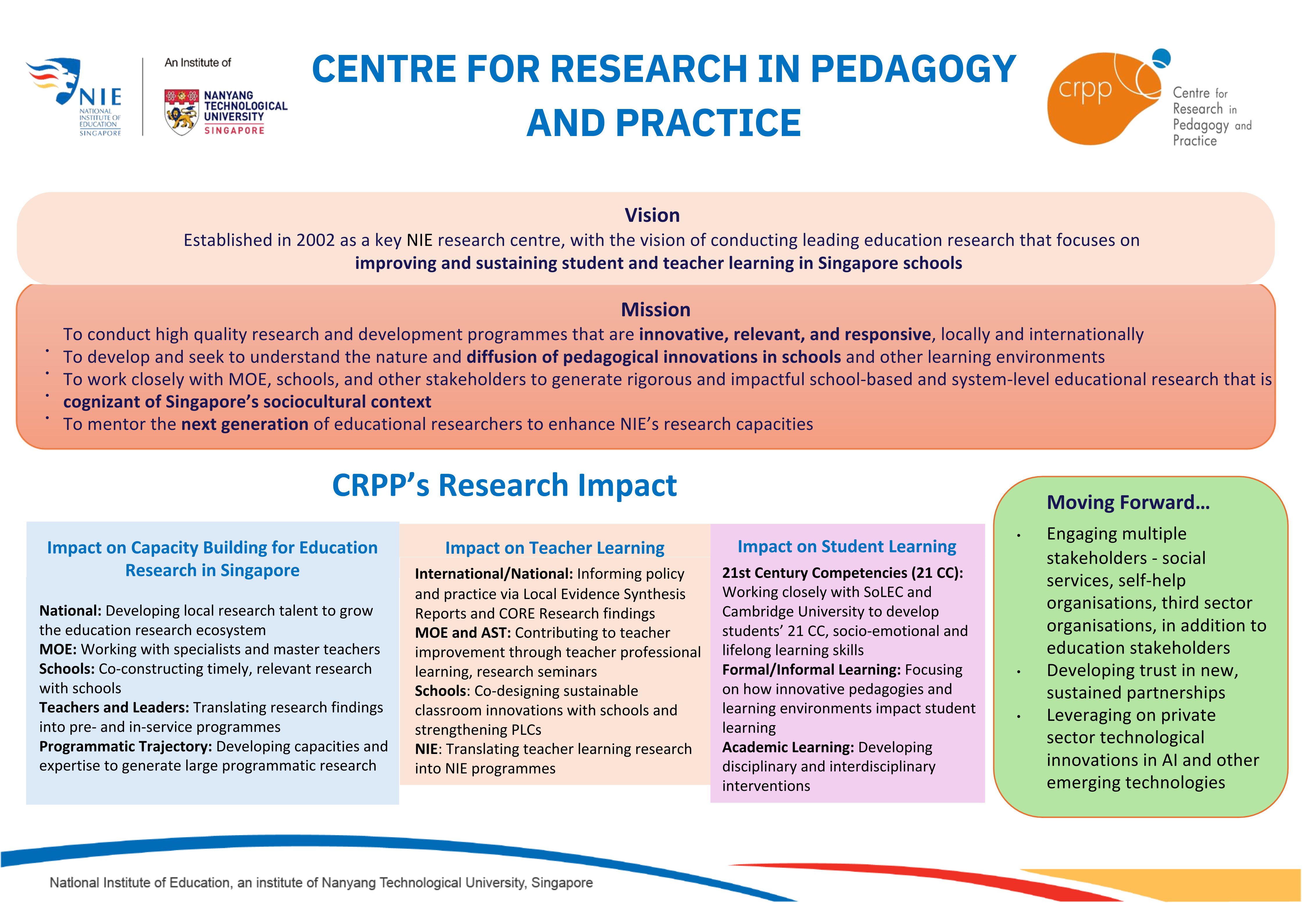 Greetings from the Centre for Research in Pedagogy and Practice (CRPP). Launched in 2002 as a key research centre of the National Institute of Education (NIE) by the then-Minister for Education Mr Teo Chee Hean, our roots of education research trace back to the 1970s, with Dr Ruth Wong and Dr Sim Wong Kooi who saw the importance of research for the Institute’s credibility and development. The Ministry of Education's (MOE) establishment of the Education Research Funding Programme (ERFP) in NIE in 1999 was a concerted effort to harness research for practice and policy, as the Singapore education system began major shifts in the nature of teaching and learning, the increasing professionalisation of teachers, and system efforts to improve schools. CRPP's genesis was embedded in this bedrock of research transformation and acceleration, fueled by national initiatives such as Thinking Schools, Leaming Nation and global recognition of the importance of rigorous and relevant evidence-based education policies and practices.