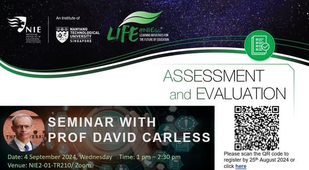 About the SpeakerDavid Carless works as a Professor at the Faculty of Education, University of Hong Kong, and is Head of the Academic Unit SCAPE (Social Contexts and Policies in Education). He is one of the pioneers of feedback literacy research and is listed as a top 0.1% cited researcher in the Stanford top 2% list for social sciences. His books include "Designing effective feedback processes in higher education: A learning-focused approach", by Winstone and Carless, 2019 published by Routledge. He was the winner of a University Outstanding Teaching Award in 2016. The latest details of his work are on his website: https://davidcarless.edu.hku.hk/. | Appointment of Visiting Scholar:The Centre for Assessment & Evaluation (CAE) is delighted towelcome Professor David Carless as Assessment's VisitingScholar. He will contribute significantly to the state of assessmentin NIE and school contexts through seminars and consultations.Prof Carless has an upcoming seminar titled, AssessmentRe-designs for GenAI: Principles and Practices this September.The seminar will touch on some key principles andpractices to inform assessment design in the age of GenAI.For more information on the seminar, kindly view the detailsfound below: |
