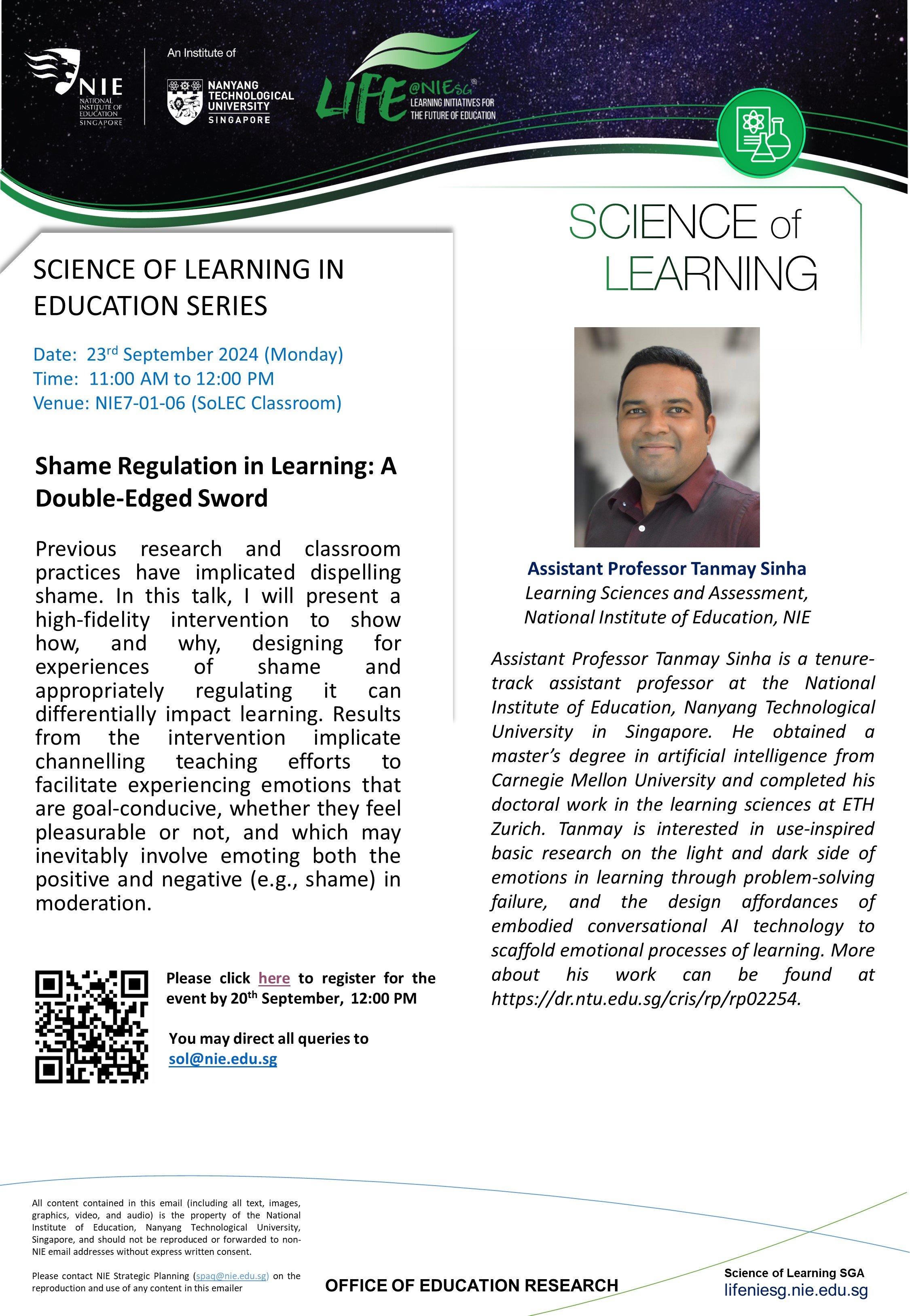 Join us in our Science of Learning in Education Series on Monday, 23rd September 2024 where Asst Prof Tanmay Sinha will present a high-fidelity intervention to show how, and why, designing for experiences of shame and appropriately regulating it can differentially impact learning. Sign up here: https://survey.ntu.edu.sg/EFM/se/3B871640631A29F7