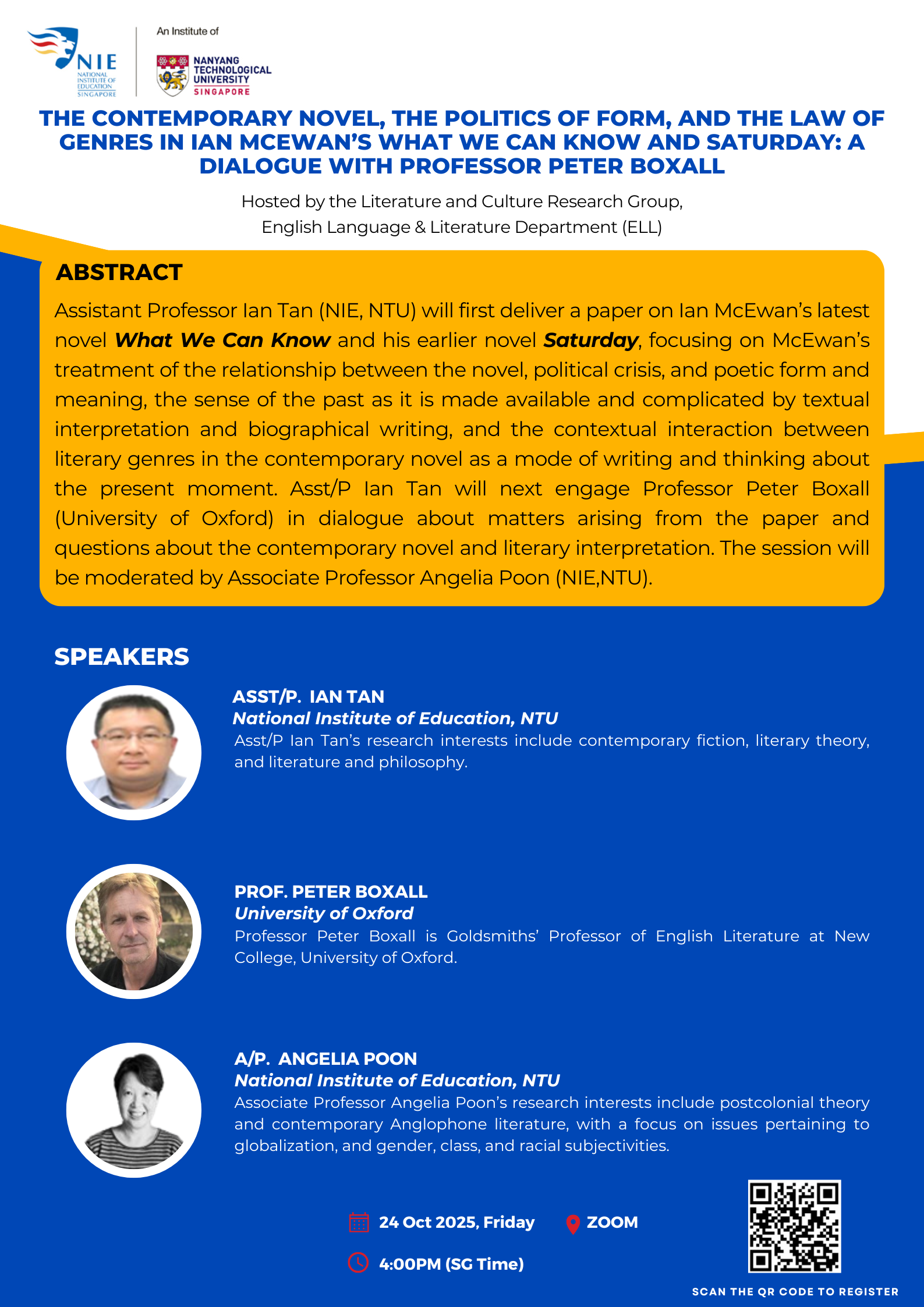 Asst/P Ian Tan (NIE NTU) will first deliver a paper on Ian McEwan’s latest novel What We Can Know and his earlier novel Saturday, focusing on McEwan’s treatment of the relationship between the novel, political crisis, and poetic form and meaning, the sense of the past as it is made available and complicated by textual interpretation and biographical writing, and the contextual interaction between literary genres in the contemporary novel as a mode of writing and thinking about the present moment. Asst/P Ian Tan will next engage Professor Peter Boxall (University of Oxford) in dialogue about matters arising from the paper and questions about the contemporary novel and literary interpretation. The session will be moderated by Associate Professor Angelia Poon (NIE NTU).