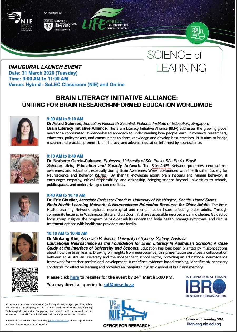 Join us in our Brain Literacy Initiative Alliance on Tuesday, 31 March 2026 by a series of speakers from multiple universities internationally on "Uniting for Brain Research-Informed Education Worldwide". Sign up here: https://forms.cloud.microsoft/Pages/ResponsePage.aspx?id=SJPOFSq-K0aPwOF2WpsgSgot5vD7JwhBvAYEqihGapxUNjZPNjU5MEUwMVJJMEhaVDZZOFQ4SEMwTi4u&origin=QRCode