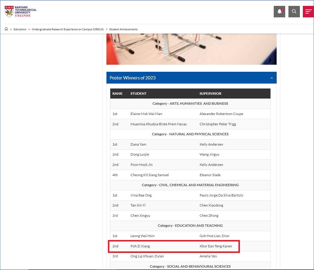 Dr Khor Ean Teng, Education Research Scientist from the Centre for Research in Pedagogy and Practice (CRPP), and her student, Poh Zi Xiang, took part in the 2023 DISCOVER URECA Poster Competition alongside 132 other URECA students from all schools in Nanyang Technological University including National Institute of Education, Sports Science & Management and Lee Kong Chian School of Medicine.