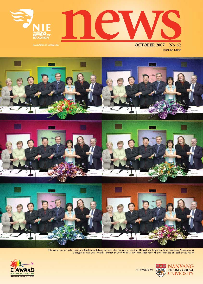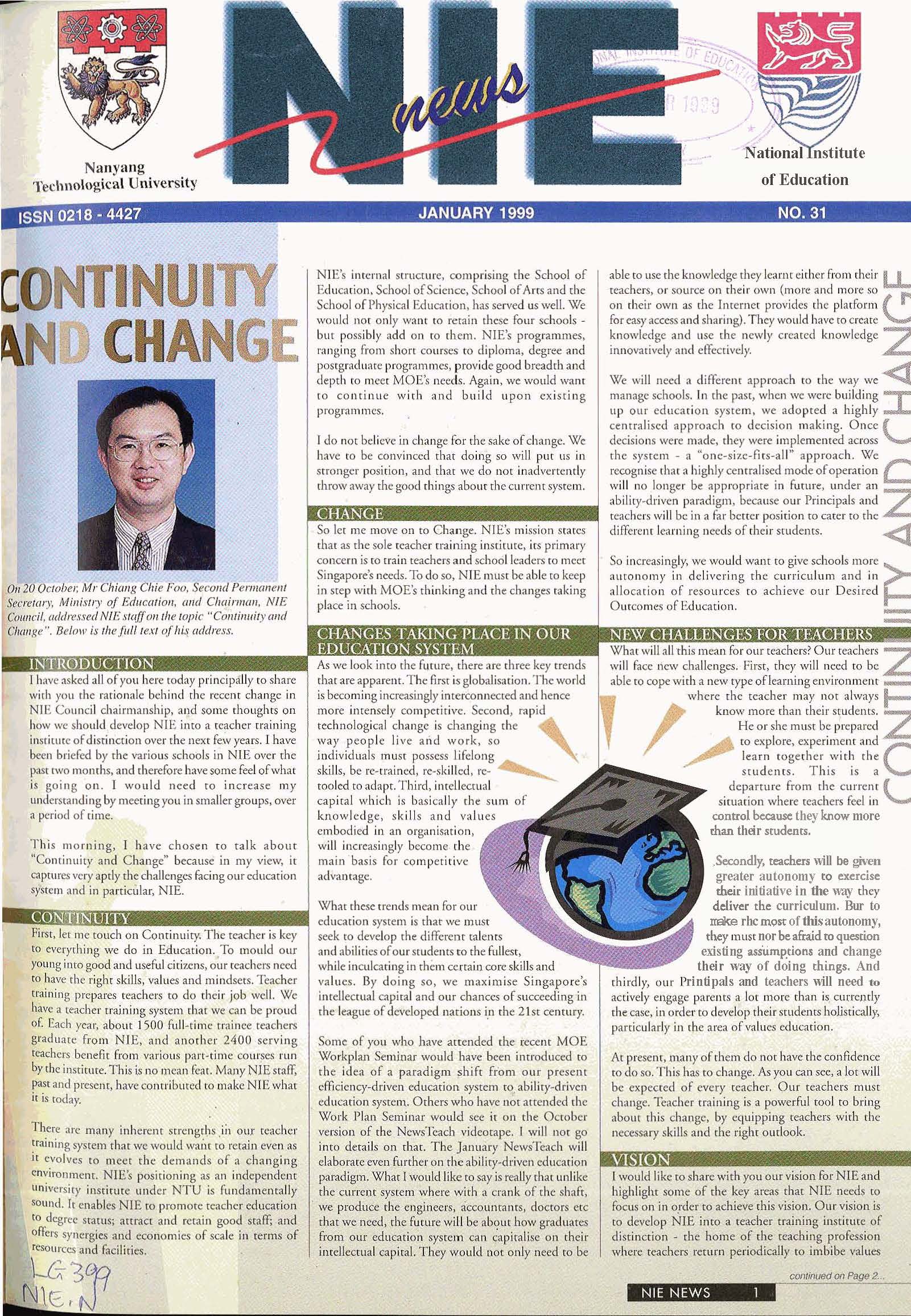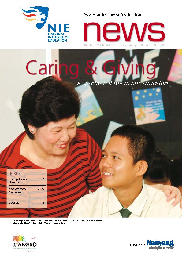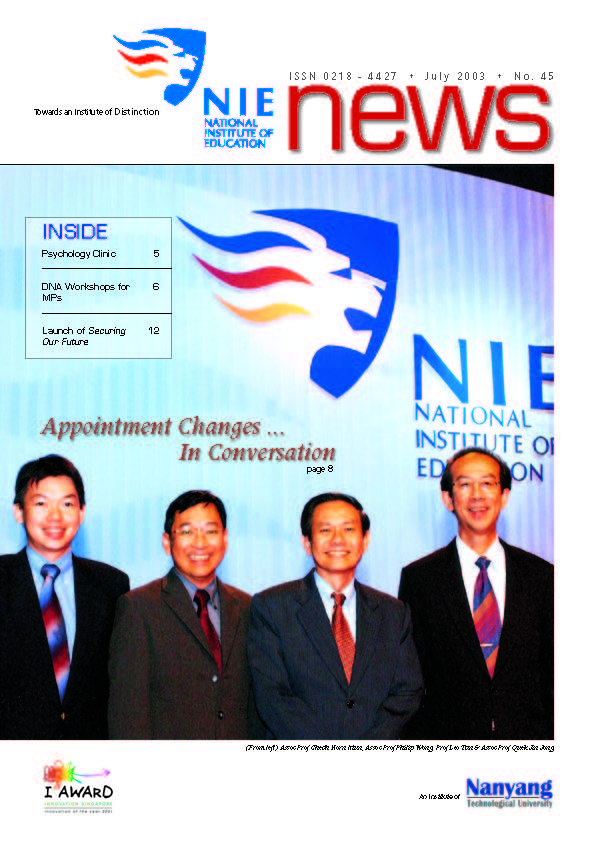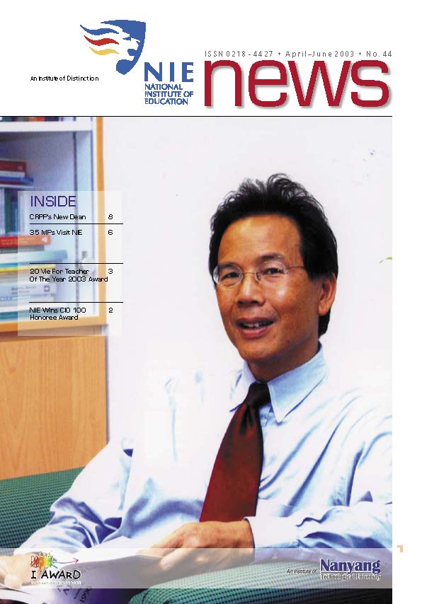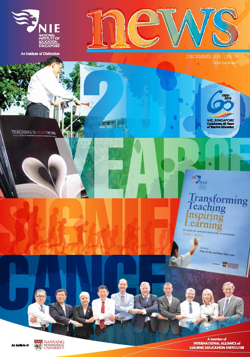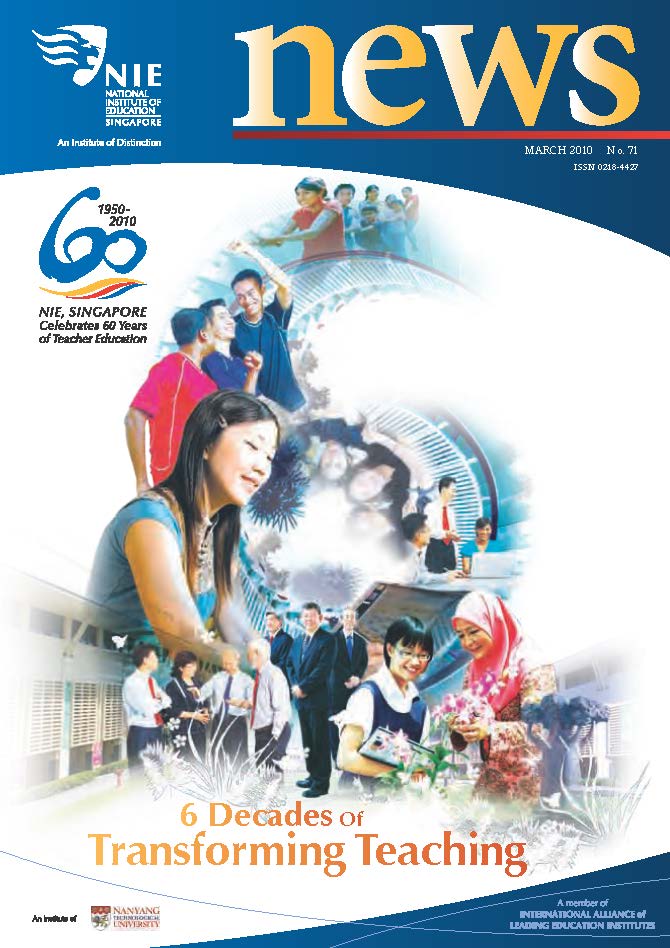 NIEWS 2020s #131 Unlocking Potential With Strategic SynergyMarch 2025 #132 Innovation through Inclusive EducationJune 2025 #133 Supercharging Teacher DevelopmentSeptember 2025 #134 Reflecting On Our Collective AchievementsDecember 2025 #130 Strengthening NetworksDecember 2024 #129 Instilling a Caring CultureSeptember 2024 #128 Championing Knowledge CreationJune 2024 #127 Unlocking the power for EdTechMarch 2024 #126 Ready for the FutureDecember 2023 #125Wired for KnowledgeSeptember 2023 #124Diversity in LearningJune 2023 #123Inspired to ServeMarch 2023 #122Reinforcing ValuesDecember 2022 #121Reimagining EducationSeptember 2022 #120Rethinking PossibilitiesJune 2022 #119Reconnecting LearningMarch 2022 #118Play to LearnDecember 2021 #117Building ResilienceSeptember 2021 #116Reimagining PedagogiesJune 2021 #115Rekindling InnovationMarch 2021 #114From Z to ADecember 2020 #113Learning UnlimitedSeptember 2020 #112The Teacher's Digital ToolboxJune 2020 #111Growing Into TeacherhoodMarch 2020 2010s #110Forward & UpwardDecember 2019 #109Celebrating Educators of TodaySeptember 2019 #108Architects of Learning EnvironmentJune 2019 #107Steering Learners in a Borderless WorldMarch 2019 #106A Future-Ready NIEDecember 2018 #105Prism of PossibilitiesSeptember 2018 #104Through A Different LensJune 2018 #103Nurture & NatureApril 2018 #102Transformation & ContinuityJanuary 2018 #101Advancing in Leadership and Educational ChangeOctober 2017 #100100th Issue: The Joy of LearningJuly 2017 #99Leading LearnerMarch 2017 #98Growing GlobalDecember 2016 #97Harnessing TalentSeptember 2016 #96Powering PassionJune 2016 #95Challenging CreativityMarch 2016 #94Impacting InsightDecember 2015 #93Driving DiscoverySeptember 2015 #92Scripting IntelligenceJune 2015 #91Seeding TalentMarch 2015 #90Reinventing the Future of LearningDecember 2014 #89Mapping Out Good LearningSeptember 2014 #88Opening Doors for Higher EducationJune 2014 #87Breaking Ground for EducationMarch 2014 #86Classroom InnovatorsDecember 2013 #85Growing ExcellenceSeptember 2013 #84Learning InspirationJune 2013 #83Leading ChangeMarch 2013 #82Designing the FutureDecember 2012 #81Teaching InspirationSeptember 2012 #80Growing ExcellenceJune 2012 #79Passion for TeachingMarch 2012 #78Passion for ServingDecember 2011 #77Passion for CollaboratingSeptember 2011 #76Passion for LearningJune 2011 #7521st Century Educators Lead with PassionMarch 2011 2000s #7460 Years of EducationDecember 2010 #73Touching Hearts and Transforming MindsSeptember 2010 #72Singapore Youth Olympic Games 2010 Special IssueJune 2010 #716 Decades of Transforming TeachingMarch 2010 #70Teacher Education in the 21st CenturyDecember 2009 #69Convocation 2009September 2009 #68Research. Art Gallery. Creativity. Innovative Teaching Technology.May 2009 #67Search Wikipedia: NIE AchievementsFebruary 2009 #66NIE Director's Race 2008October 2008 #65Leaders in the Service of LearnersJuly 2008 #64Learning to Serve, Serving to LearnApril 2008 #63January 2008 #62October 2007 #61July 2007 #60April 2007 #59January 2007 #58October 2006 #57July 2006 #56April 2006 #55January 2006 #54NIE's Conservation Efforts Lead to Release of Hawksbill Turtle HatchlingsOctober 2005 #53NIE is Energy EfficientJuly 2005 #52Teach Less, Learn MoreApril 2005 #51Caring & GivingJanuary 2005 #50Caring & GivingOctober 2004 #49Celebrate Learning!July 2004 #48April 2004 #47Signing CeremonyJanuary 2004 #46October 2003 #45Appointment Changes in ConversationJuly 2003 #44April 2003 #43Professor Leo Tan Awarded Ordre National du MeriteJanuary 2003 #42The Caring Teacher Awards 2002October 2002 #41July 2002 #40NIE Official OpeningApril 2002 #39NIE of NantahJanuary 2002 #38NIE: An Institute of Distinction?October 2001 #37An Invitation to the NIE Open HouseJuly 2001 #36Thoughts on the NIE Corporate Seminar 2001April 2001 #35Yunnan Garden Here We ComeFebruary 2001 1990s #34The Reflective SpinOctober 1999 #33Teacher's Investiture CeremonyJuly 1999 #32April 1999 #31Continuity and ChangeJanuary 1999 #30NIE Convocation 1998October 1998 #29The Singapore Centre for Teaching ThinkingJuly 1998 #28Educating the FutureApril 1998 #27AIESEP Singapore 1997 World ConferenceJanuary 1998 #26It's Never Too LateOctober 1997 #25The Thinking ConferenceJuly 1997 #24Minister's VisitApril 1997 #23The Tan Kah Kee ProfessorshipJanuary 1997 #22Scholars in the Teaching ProfessionOctober 1996 #21A Sign of Things to ComeJuly 1996 #20Professor Sir Michael Howard Lee Kuan Yew Distinguished VisitorApril 1996 #19Principal's Executive Centre (PEC)January 1996 #18Convocation 1995October 1995 #17The Eighth Asian Workshop on Child and Adolescent DevelopmentJuly 1995 #16NIE Celebrates World ChampionApril 1995 #15Designing Drugs Through Computer SimulationJanuary 1995 #14Convocation 1994October 1994 #13Relocation of NIE to Jurong CampusJuly 1994 #12Programme for National AwarenessApril 1994 #11A Glorious First... Commonwealth Writer's Prize 1993January 1994 #10Mentoring in Management Education: The NIE ModelOctober 1993 #9NIE Signed Memorandum of Understanding with the National Parks BoardJuly 1993 #8Elaine Feinstein: NTU's First Writer In-Residence - A Brief and Personal ResponseApril 1993 #7NIE Convocation 1992January 1993 #6NTU Open DayOctober 1992 #5Visit to UK UniversitiesJuly 1992 #4The Tree of Education - A Sculpture by Chern Lian ShanApril 1992 #3NIE (NTU) - SISIR Joint Project Agreement on the Lettuce Research ProjectJanuary 1992 #2Ministers Visit NIEOctober 1991 #1NTU Inauguration - A Major Step ForwardJuly 1991