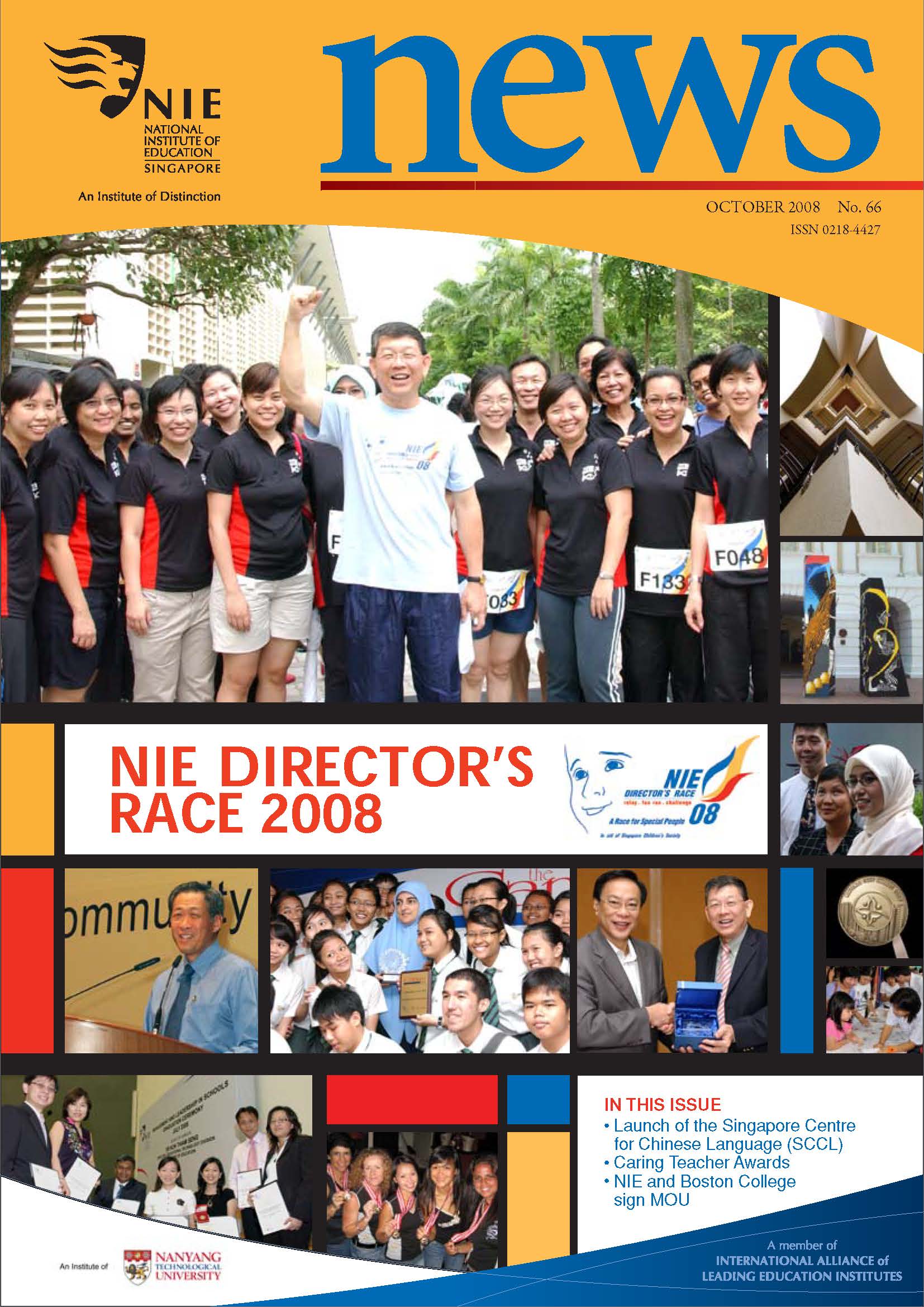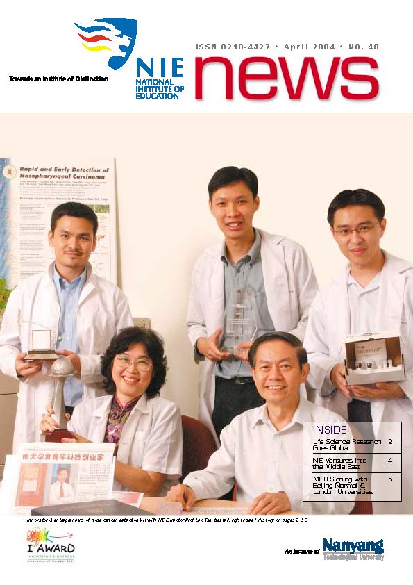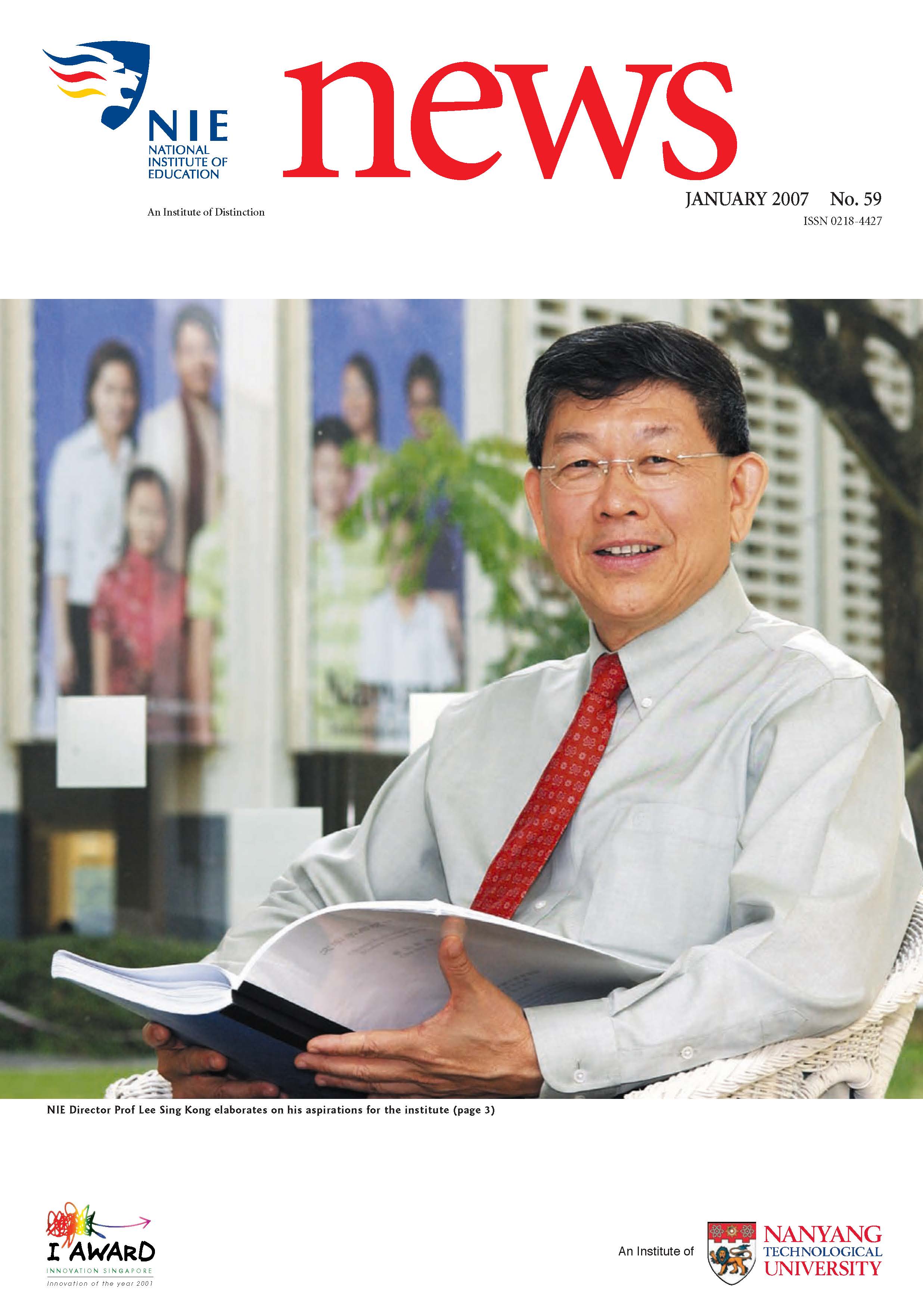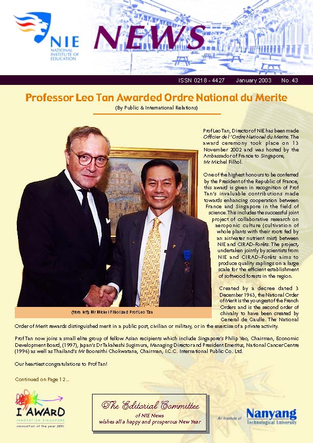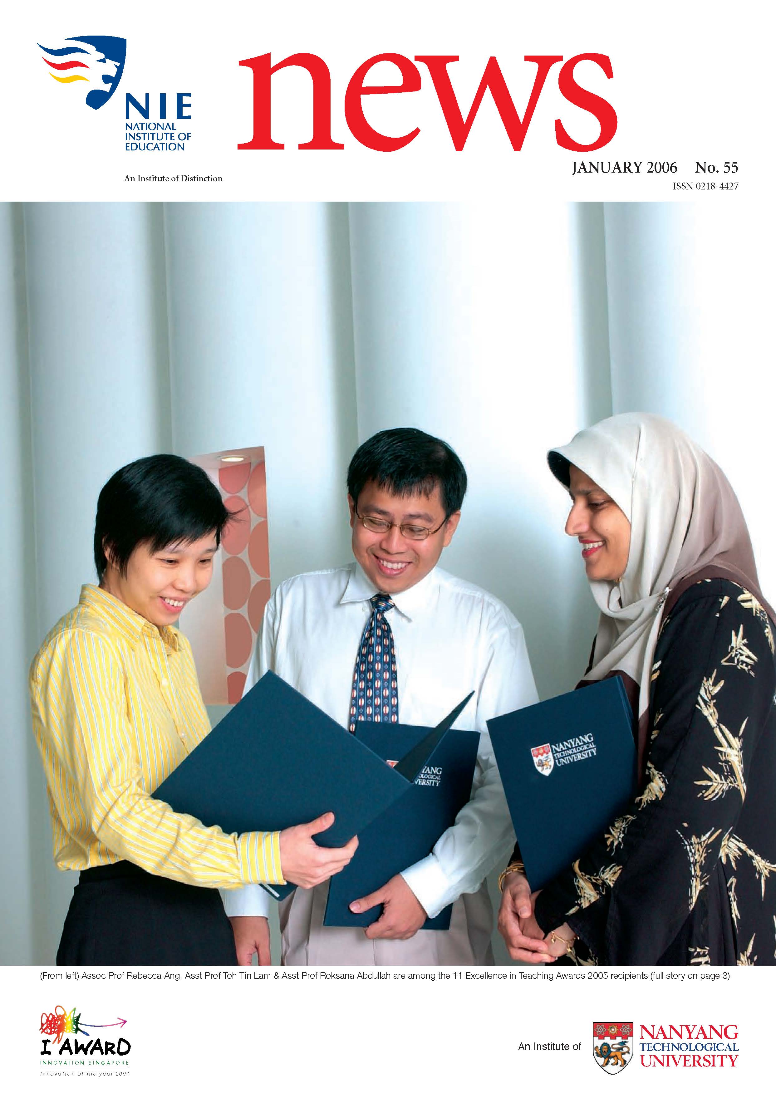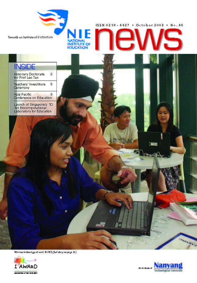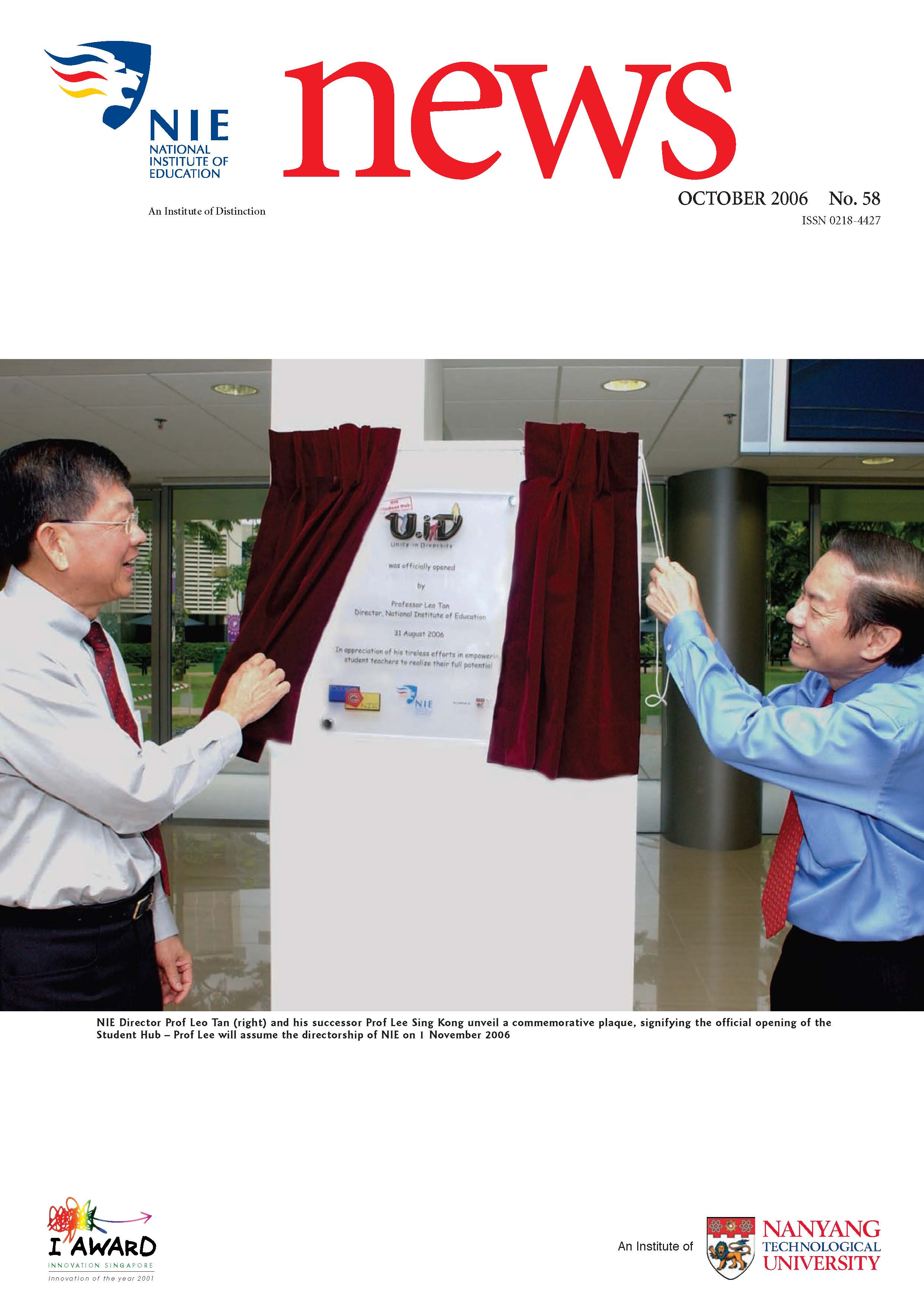NIEWS 2020s #131 Unlocking Potential With Strategic SynergyMarch 2025 #132 Innovation through Inclusive EducationJune 2025 #133 Supercharging Teacher DevelopmentSeptember 2025 #134 Reflecting On Our Collective AchievementsDecember 2025 #130 Strengthening NetworksDecember 2024 #129 Instilling a Caring CultureSeptember 2024 #128 Championing Knowledge CreationJune 2024 #127 Unlocking the power for EdTechMarch 2024 #126 Ready for the FutureDecember 2023 #125Wired for KnowledgeSeptember 2023 #124Diversity in LearningJune 2023 #123Inspired to ServeMarch 2023 #122Reinforcing ValuesDecember 2022 #121Reimagining EducationSeptember 2022 #120Rethinking PossibilitiesJune 2022 #119Reconnecting LearningMarch 2022 #118Play to LearnDecember 2021 #117Building ResilienceSeptember 2021 #116Reimagining PedagogiesJune 2021 #115Rekindling InnovationMarch 2021 #114From Z to ADecember 2020 #113Learning UnlimitedSeptember 2020 #112The Teacher's Digital ToolboxJune 2020 #111Growing Into TeacherhoodMarch 2020 2010s #110Forward & UpwardDecember 2019 #109Celebrating Educators of TodaySeptember 2019 #108Architects of Learning EnvironmentJune 2019 #107Steering Learners in a Borderless WorldMarch 2019 #106A Future-Ready NIEDecember 2018 #105Prism of PossibilitiesSeptember 2018 #104Through A Different LensJune 2018 #103Nurture & NatureApril 2018 #102Transformation & ContinuityJanuary 2018 #101Advancing in Leadership and Educational ChangeOctober 2017 #100100th Issue: The Joy of LearningJuly 2017 #99Leading LearnerMarch 2017 #98Growing GlobalDecember 2016 #97Harnessing TalentSeptember 2016 #96Powering PassionJune 2016 #95Challenging CreativityMarch 2016 #94Impacting InsightDecember 2015 #93Driving DiscoverySeptember 2015 #92Scripting IntelligenceJune 2015 #91Seeding TalentMarch 2015 #90Reinventing the Future of LearningDecember 2014 #89Mapping Out Good LearningSeptember 2014 #88Opening Doors for Higher EducationJune 2014 #87Breaking Ground for EducationMarch 2014 #86Classroom InnovatorsDecember 2013 #85Growing ExcellenceSeptember 2013 #84Learning InspirationJune 2013 #83Leading ChangeMarch 2013 #82Designing the FutureDecember 2012 #81Teaching InspirationSeptember 2012 #80Growing ExcellenceJune 2012 #79Passion for TeachingMarch 2012 #78Passion for ServingDecember 2011 #77Passion for CollaboratingSeptember 2011 #76Passion for LearningJune 2011 #7521st Century Educators Lead with PassionMarch 2011 2000s #7460 Years of EducationDecember 2010 #73Touching Hearts and Transforming MindsSeptember 2010 #72Singapore Youth Olympic Games 2010 Special IssueJune 2010 #716 Decades of Transforming TeachingMarch 2010 #70Teacher Education in the 21st CenturyDecember 2009 #69Convocation 2009September 2009 #68Research. Art Gallery. Creativity. Innovative Teaching Technology.May 2009 #67Search Wikipedia: NIE AchievementsFebruary 2009 #66NIE Director's Race 2008October 2008 #65Leaders in the Service of LearnersJuly 2008 #64Learning to Serve, Serving to LearnApril 2008 #63January 2008 #62October 2007 #61July 2007 #60April 2007 #59January 2007 #58October 2006 #57July 2006 #56April 2006 #55January 2006 #54NIE's Conservation Efforts Lead to Release of Hawksbill Turtle HatchlingsOctober 2005 #53NIE is Energy EfficientJuly 2005 #52Teach Less, Learn MoreApril 2005 #51Caring & GivingJanuary 2005 #50Caring & GivingOctober 2004 #49Celebrate Learning!July 2004 #48April 2004 #47Signing CeremonyJanuary 2004 #46October 2003 #45Appointment Changes in ConversationJuly 2003 #44April 2003 #43Professor Leo Tan Awarded Ordre National du MeriteJanuary 2003 #42The Caring Teacher Awards 2002October 2002 #41July 2002 #40NIE Official OpeningApril 2002 #39NIE of NantahJanuary 2002 #38NIE: An Institute of Distinction?October 2001 #37An Invitation to the NIE Open HouseJuly 2001 #36Thoughts on the NIE Corporate Seminar 2001April 2001 #35Yunnan Garden Here We ComeFebruary 2001 1990s #34The Reflective SpinOctober 1999 #33Teacher's Investiture CeremonyJuly 1999 #32April 1999 #31Continuity and ChangeJanuary 1999 #30NIE Convocation 1998October 1998 #29The Singapore Centre for Teaching ThinkingJuly 1998 #28Educating the FutureApril 1998 #27AIESEP Singapore 1997 World ConferenceJanuary 1998 #26It's Never Too LateOctober 1997 #25The Thinking ConferenceJuly 1997 #24Minister's VisitApril 1997 #23The Tan Kah Kee ProfessorshipJanuary 1997 #22Scholars in the Teaching ProfessionOctober 1996 #21A Sign of Things to ComeJuly 1996 #20Professor Sir Michael Howard Lee Kuan Yew Distinguished VisitorApril 1996 #19Principal's Executive Centre (PEC)January 1996 #18Convocation 1995October 1995 #17The Eighth Asian Workshop on Child and Adolescent DevelopmentJuly 1995 #16NIE Celebrates World ChampionApril 1995 #15Designing Drugs Through Computer SimulationJanuary 1995 #14Convocation 1994October 1994 #13Relocation of NIE to Jurong CampusJuly 1994 #12Programme for National AwarenessApril 1994 #11A Glorious First... Commonwealth Writer's Prize 1993January 1994 #10Mentoring in Management Education: The NIE ModelOctober 1993 #9NIE Signed Memorandum of Understanding with the National Parks BoardJuly 1993 #8Elaine Feinstein: NTU's First Writer In-Residence - A Brief and Personal ResponseApril 1993 #7NIE Convocation 1992January 1993 #6NTU Open DayOctober 1992 #5Visit to UK UniversitiesJuly 1992 #4The Tree of Education - A Sculpture by Chern Lian ShanApril 1992 #3NIE (NTU) - SISIR Joint Project Agreement on the Lettuce Research ProjectJanuary 1992 #2Ministers Visit NIEOctober 1991 #1NTU Inauguration - A Major Step ForwardJuly 1991