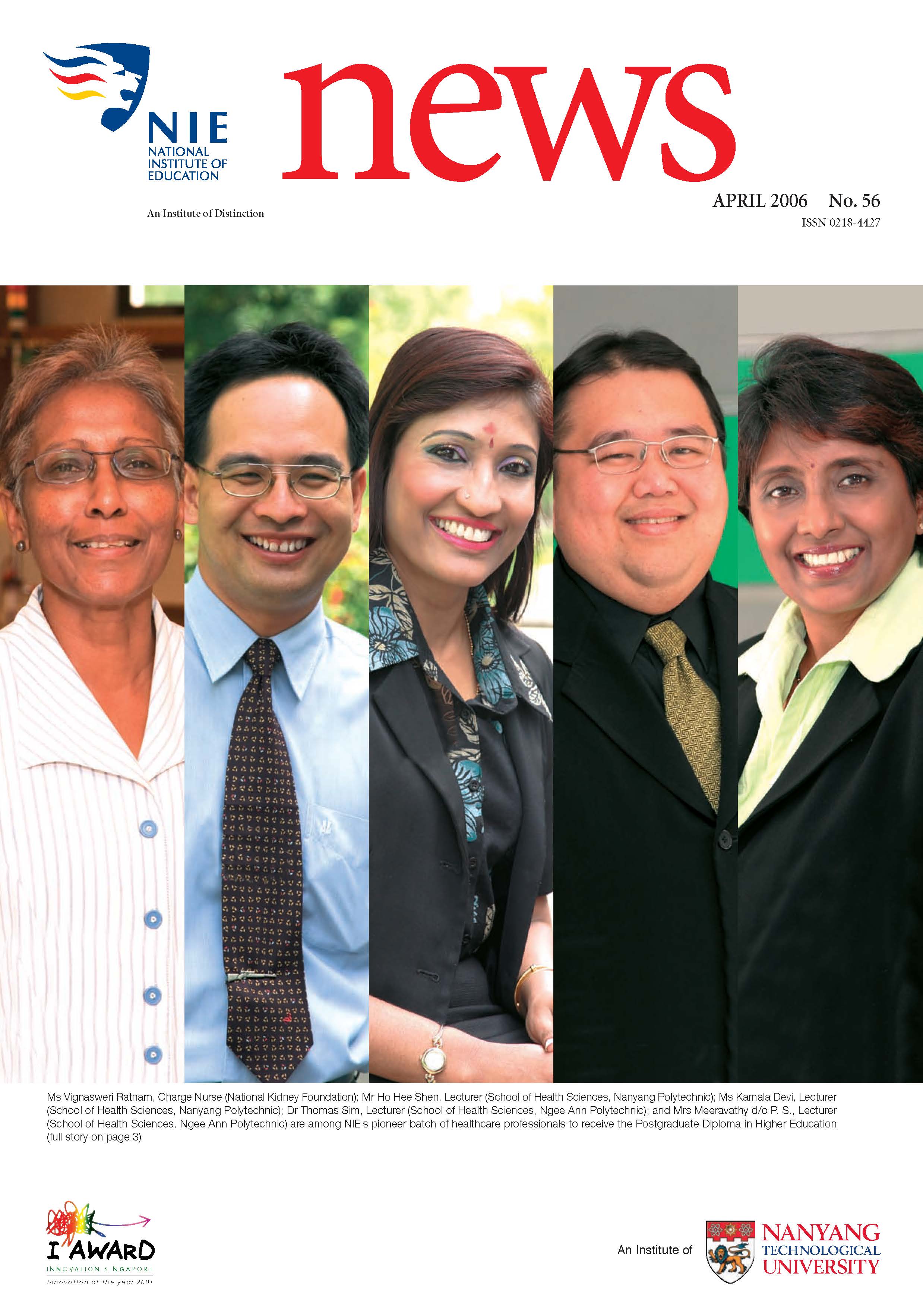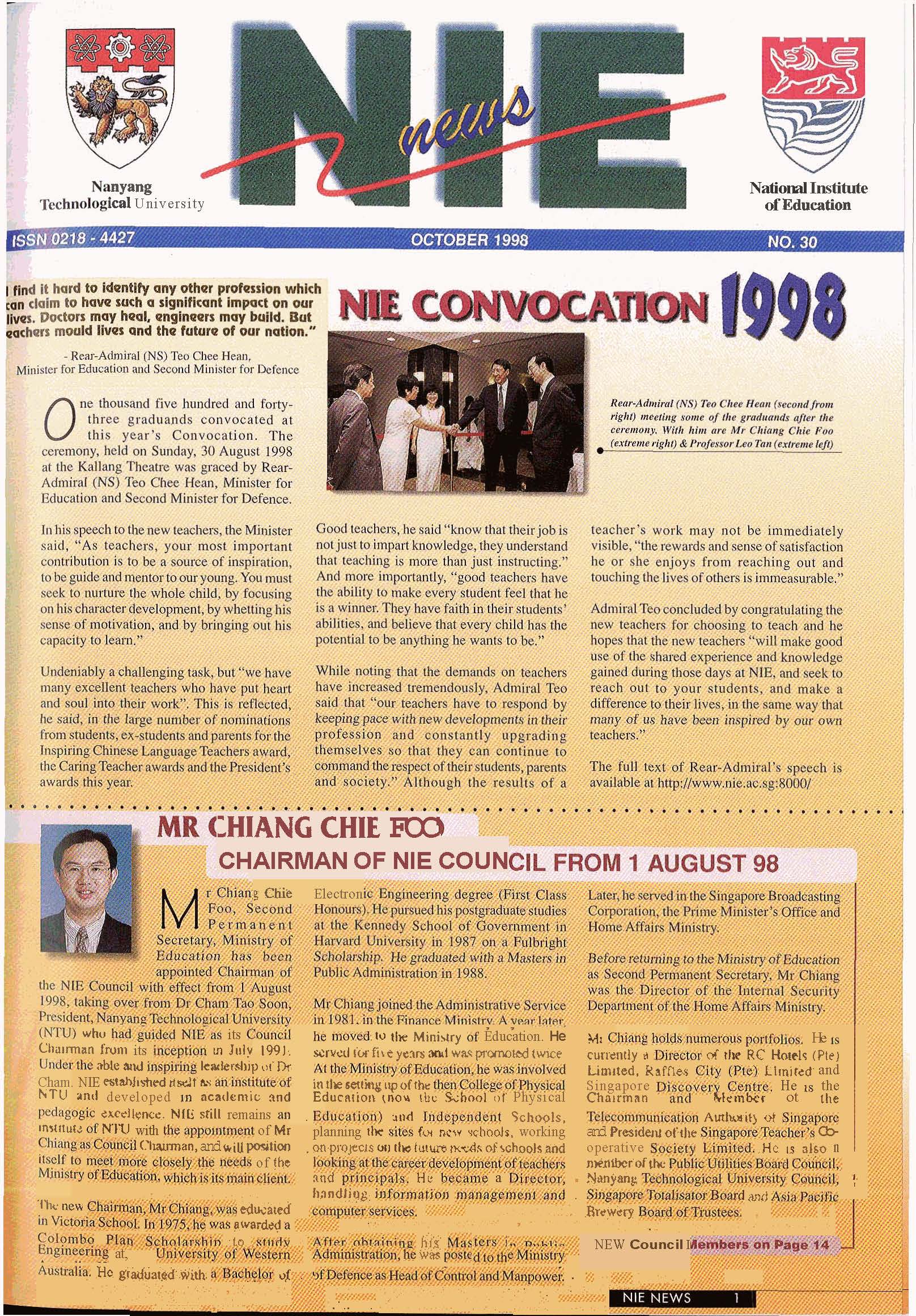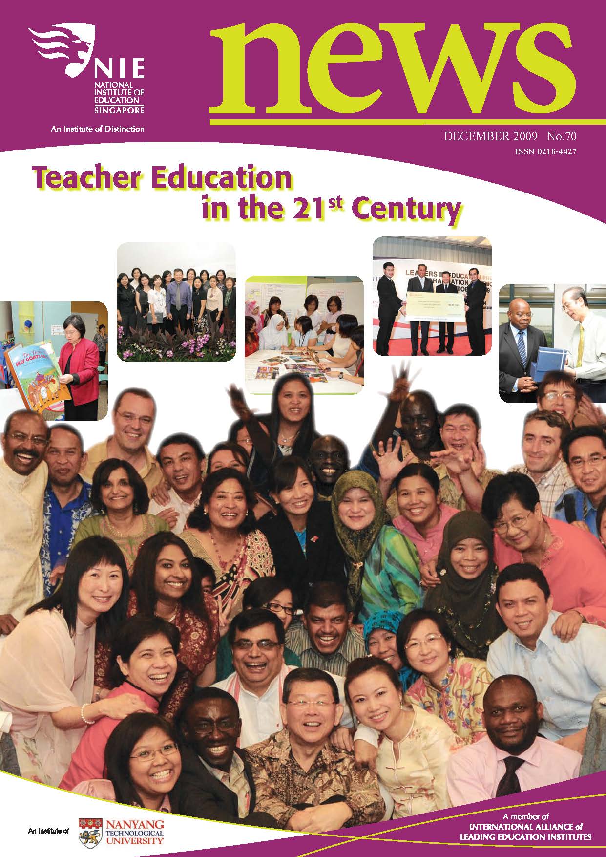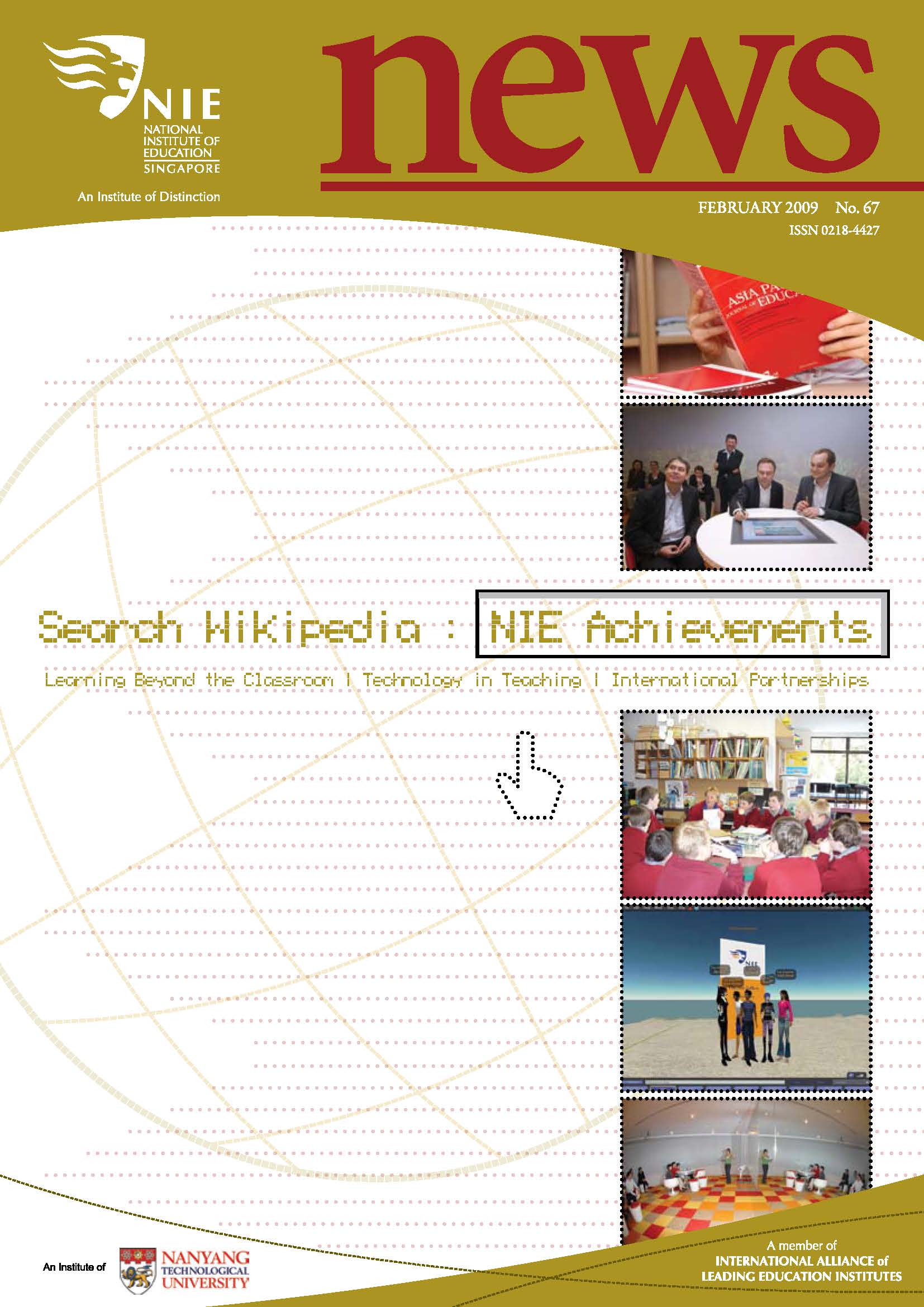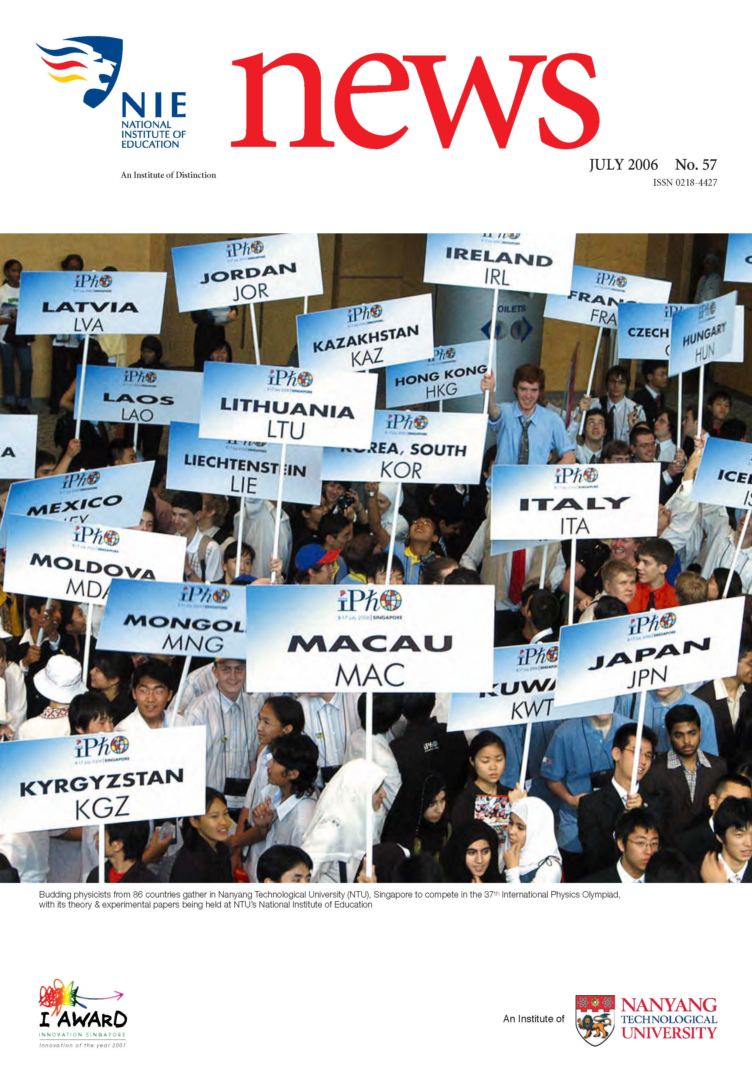 NIEWS 2020s #131 Unlocking Potential With Strategic SynergyMarch 2025 #132 Innovation through Inclusive EducationJune 2025 #133 Supercharging Teacher DevelopmentSeptember 2025 #134 Reflecting On Our Collective AchievementsDecember 2025 #130 Strengthening NetworksDecember 2024 #129 Instilling a Caring CultureSeptember 2024 #128 Championing Knowledge CreationJune 2024 #127 Unlocking the power for EdTechMarch 2024 #126 Ready for the FutureDecember 2023 #125Wired for KnowledgeSeptember 2023 #124Diversity in LearningJune 2023 #123Inspired to ServeMarch 2023 #122Reinforcing ValuesDecember 2022 #121Reimagining EducationSeptember 2022 #120Rethinking PossibilitiesJune 2022 #119Reconnecting LearningMarch 2022 #118Play to LearnDecember 2021 #117Building ResilienceSeptember 2021 #116Reimagining PedagogiesJune 2021 #115Rekindling InnovationMarch 2021 #114From Z to ADecember 2020 #113Learning UnlimitedSeptember 2020 #112The Teacher's Digital ToolboxJune 2020 #111Growing Into TeacherhoodMarch 2020 2010s #110Forward & UpwardDecember 2019 #109Celebrating Educators of TodaySeptember 2019 #108Architects of Learning EnvironmentJune 2019 #107Steering Learners in a Borderless WorldMarch 2019 #106A Future-Ready NIEDecember 2018 #105Prism of PossibilitiesSeptember 2018 #104Through A Different LensJune 2018 #103Nurture & NatureApril 2018 #102Transformation & ContinuityJanuary 2018 #101Advancing in Leadership and Educational ChangeOctober 2017 #100100th Issue: The Joy of LearningJuly 2017 #99Leading LearnerMarch 2017 #98Growing GlobalDecember 2016 #97Harnessing TalentSeptember 2016 #96Powering PassionJune 2016 #95Challenging CreativityMarch 2016 #94Impacting InsightDecember 2015 #93Driving DiscoverySeptember 2015 #92Scripting IntelligenceJune 2015 #91Seeding TalentMarch 2015 #90Reinventing the Future of LearningDecember 2014 #89Mapping Out Good LearningSeptember 2014 #88Opening Doors for Higher EducationJune 2014 #87Breaking Ground for EducationMarch 2014 #86Classroom InnovatorsDecember 2013 #85Growing ExcellenceSeptember 2013 #84Learning InspirationJune 2013 #83Leading ChangeMarch 2013 #82Designing the FutureDecember 2012 #81Teaching InspirationSeptember 2012 #80Growing ExcellenceJune 2012 #79Passion for TeachingMarch 2012 #78Passion for ServingDecember 2011 #77Passion for CollaboratingSeptember 2011 #76Passion for LearningJune 2011 #7521st Century Educators Lead with PassionMarch 2011 2000s #7460 Years of EducationDecember 2010 #73Touching Hearts and Transforming MindsSeptember 2010 #72Singapore Youth Olympic Games 2010 Special IssueJune 2010 #716 Decades of Transforming TeachingMarch 2010 #70Teacher Education in the 21st CenturyDecember 2009 #69Convocation 2009September 2009 #68Research. Art Gallery. Creativity. Innovative Teaching Technology.May 2009 #67Search Wikipedia: NIE AchievementsFebruary 2009 #66NIE Director's Race 2008October 2008 #65Leaders in the Service of LearnersJuly 2008 #64Learning to Serve, Serving to LearnApril 2008 #63January 2008 #62October 2007 #61July 2007 #60April 2007 #59January 2007 #58October 2006 #57July 2006 #56April 2006 #55January 2006 #54NIE's Conservation Efforts Lead to Release of Hawksbill Turtle HatchlingsOctober 2005 #53NIE is Energy EfficientJuly 2005 #52Teach Less, Learn MoreApril 2005 #51Caring & GivingJanuary 2005 #50Caring & GivingOctober 2004 #49Celebrate Learning!July 2004 #48April 2004 #47Signing CeremonyJanuary 2004 #46October 2003 #45Appointment Changes in ConversationJuly 2003 #44April 2003 #43Professor Leo Tan Awarded Ordre National du MeriteJanuary 2003 #42The Caring Teacher Awards 2002October 2002 #41July 2002 #40NIE Official OpeningApril 2002 #39NIE of NantahJanuary 2002 #38NIE: An Institute of Distinction?October 2001 #37An Invitation to the NIE Open HouseJuly 2001 #36Thoughts on the NIE Corporate Seminar 2001April 2001 #35Yunnan Garden Here We ComeFebruary 2001 1990s #34The Reflective SpinOctober 1999 #33Teacher's Investiture CeremonyJuly 1999 #32April 1999 #31Continuity and ChangeJanuary 1999 #30NIE Convocation 1998October 1998 #29The Singapore Centre for Teaching ThinkingJuly 1998 #28Educating the FutureApril 1998 #27AIESEP Singapore 1997 World ConferenceJanuary 1998 #26It's Never Too LateOctober 1997 #25The Thinking ConferenceJuly 1997 #24Minister's VisitApril 1997 #23The Tan Kah Kee ProfessorshipJanuary 1997 #22Scholars in the Teaching ProfessionOctober 1996 #21A Sign of Things to ComeJuly 1996 #20Professor Sir Michael Howard Lee Kuan Yew Distinguished VisitorApril 1996 #19Principal's Executive Centre (PEC)January 1996 #18Convocation 1995October 1995 #17The Eighth Asian Workshop on Child and Adolescent DevelopmentJuly 1995 #16NIE Celebrates World ChampionApril 1995 #15Designing Drugs Through Computer SimulationJanuary 1995 #14Convocation 1994October 1994 #13Relocation of NIE to Jurong CampusJuly 1994 #12Programme for National AwarenessApril 1994 #11A Glorious First... Commonwealth Writer's Prize 1993January 1994 #10Mentoring in Management Education: The NIE ModelOctober 1993 #9NIE Signed Memorandum of Understanding with the National Parks BoardJuly 1993 #8Elaine Feinstein: NTU's First Writer In-Residence - A Brief and Personal ResponseApril 1993 #7NIE Convocation 1992January 1993 #6NTU Open DayOctober 1992 #5Visit to UK UniversitiesJuly 1992 #4The Tree of Education - A Sculpture by Chern Lian ShanApril 1992 #3NIE (NTU) - SISIR Joint Project Agreement on the Lettuce Research ProjectJanuary 1992 #2Ministers Visit NIEOctober 1991 #1NTU Inauguration - A Major Step ForwardJuly 1991