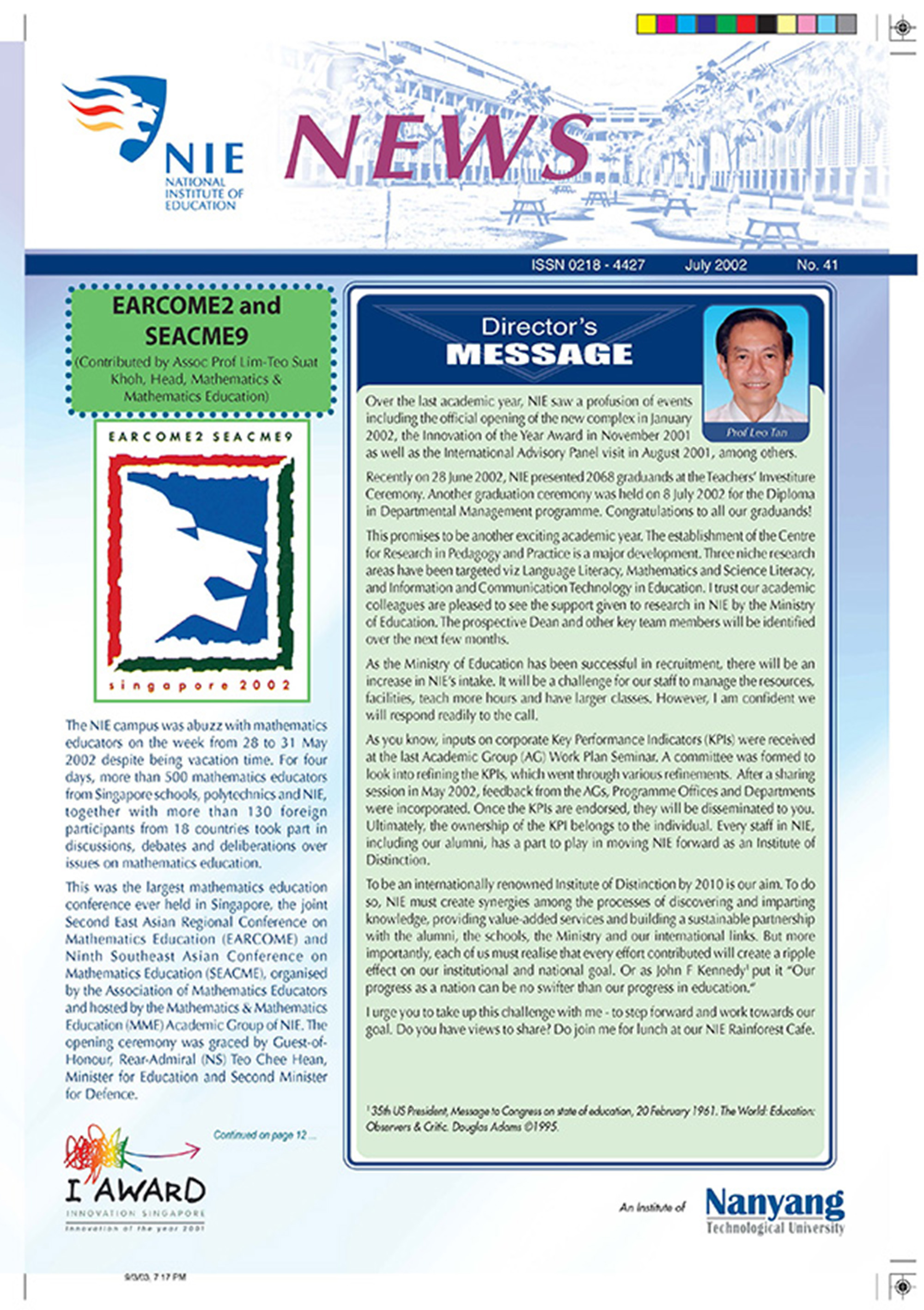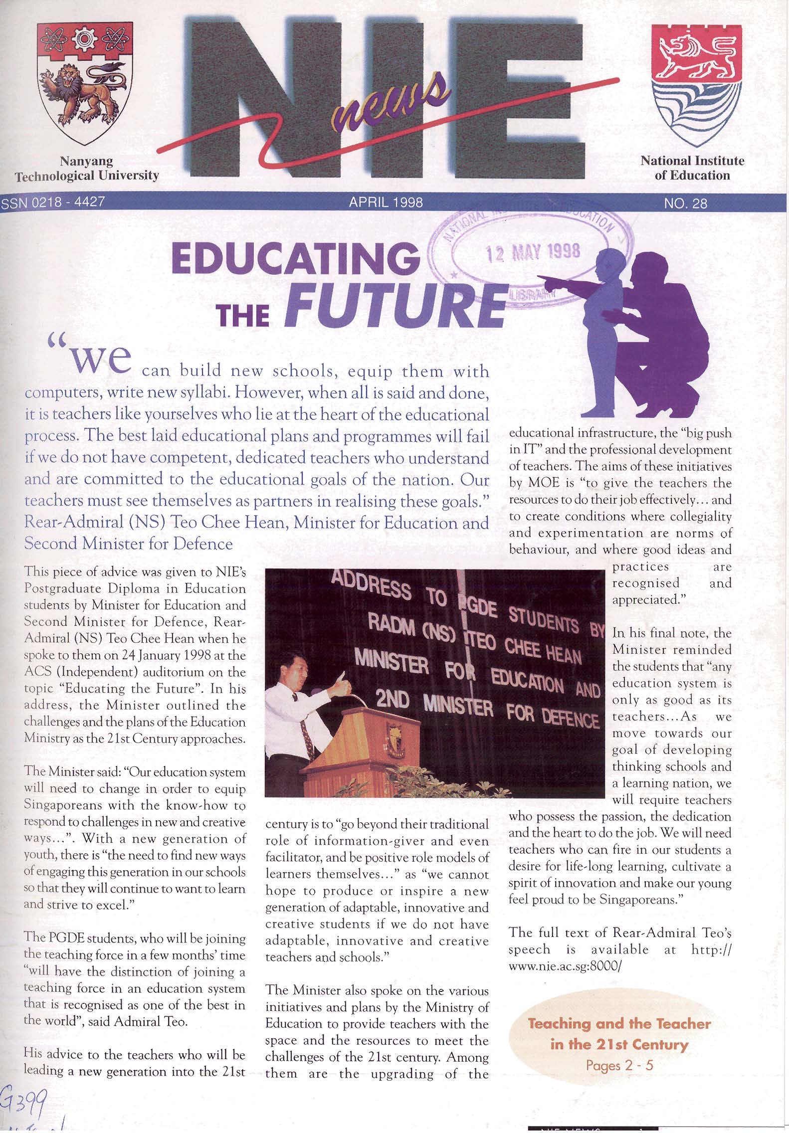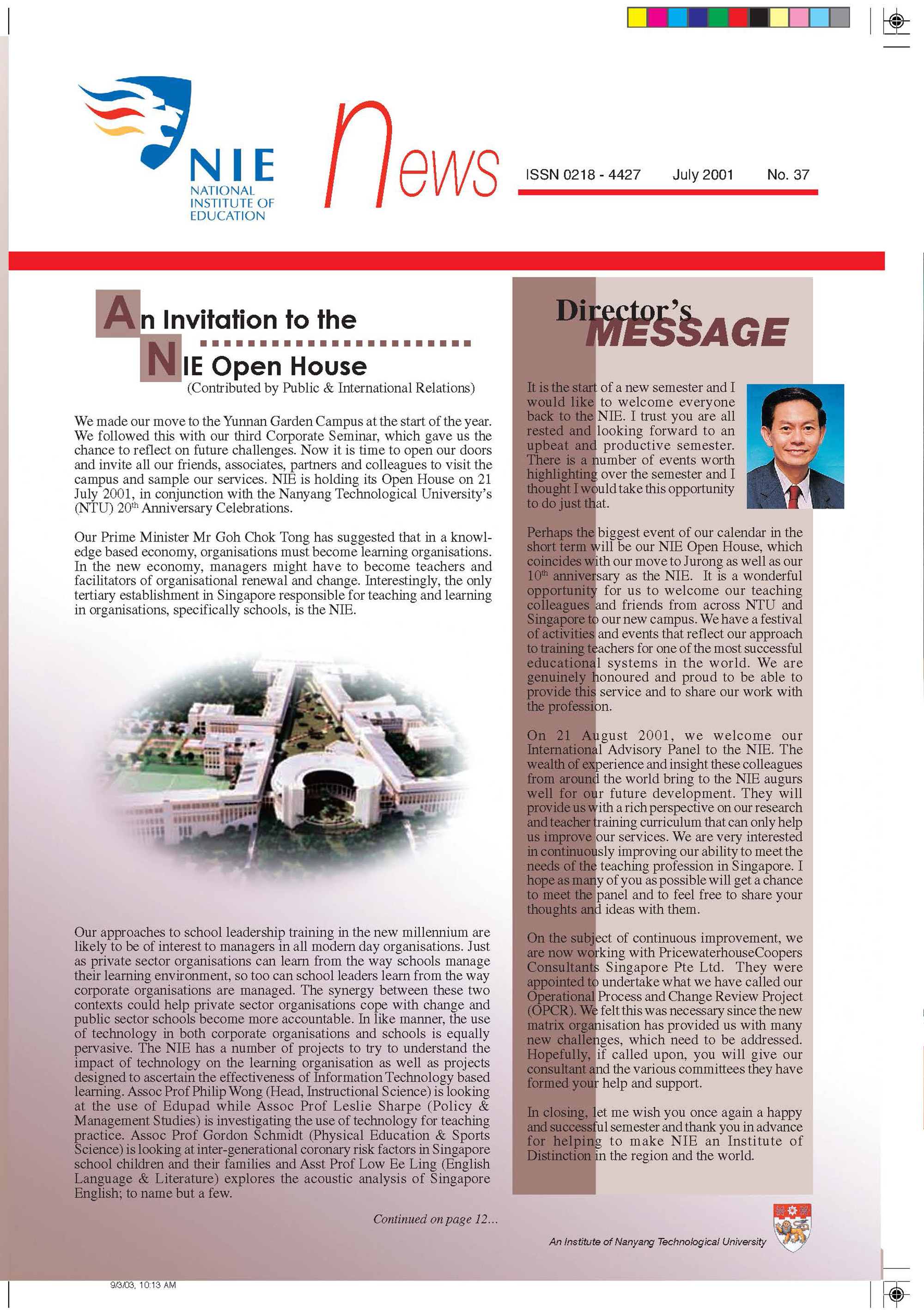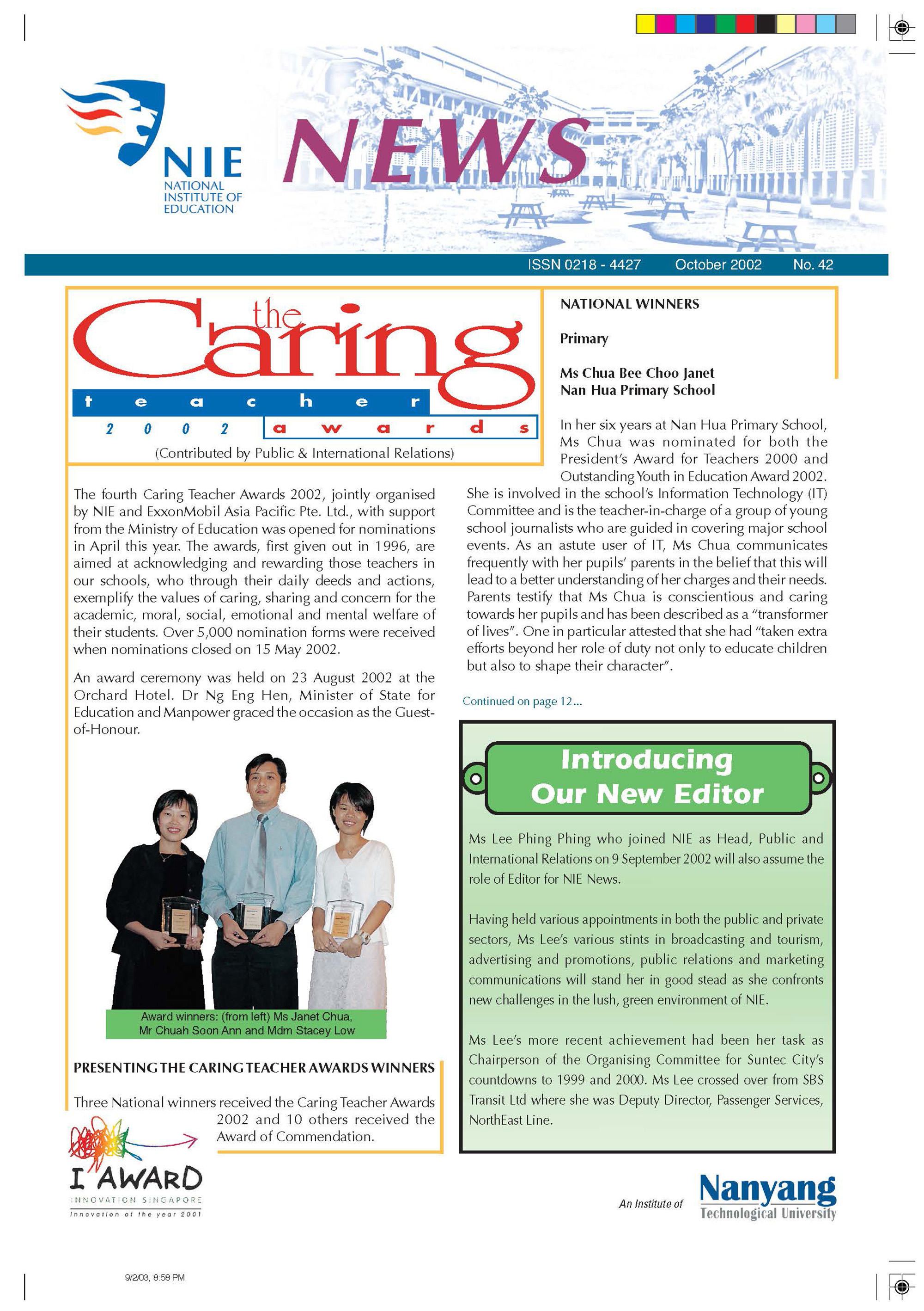 NIEWS 2020s #131 Unlocking Potential With Strategic SynergyMarch 2025 #132 Innovation through Inclusive EducationJune 2025 #133 Supercharging Teacher DevelopmentSeptember 2025 #134 Reflecting On Our Collective AchievementsDecember 2025 #130 Strengthening NetworksDecember 2024 #129 Instilling a Caring CultureSeptember 2024 #128 Championing Knowledge CreationJune 2024 #127 Unlocking the power for EdTechMarch 2024 #126 Ready for the FutureDecember 2023 #125Wired for KnowledgeSeptember 2023 #124Diversity in LearningJune 2023 #123Inspired to ServeMarch 2023 #122Reinforcing ValuesDecember 2022 #121Reimagining EducationSeptember 2022 #120Rethinking PossibilitiesJune 2022 #119Reconnecting LearningMarch 2022 #118Play to LearnDecember 2021 #117Building ResilienceSeptember 2021 #116Reimagining PedagogiesJune 2021 #115Rekindling InnovationMarch 2021 #114From Z to ADecember 2020 #113Learning UnlimitedSeptember 2020 #112The Teacher's Digital ToolboxJune 2020 #111Growing Into TeacherhoodMarch 2020 2010s #110Forward & UpwardDecember 2019 #109Celebrating Educators of TodaySeptember 2019 #108Architects of Learning EnvironmentJune 2019 #107Steering Learners in a Borderless WorldMarch 2019 #106A Future-Ready NIEDecember 2018 #105Prism of PossibilitiesSeptember 2018 #104Through A Different LensJune 2018 #103Nurture & NatureApril 2018 #102Transformation & ContinuityJanuary 2018 #101Advancing in Leadership and Educational ChangeOctober 2017 #100100th Issue: The Joy of LearningJuly 2017 #99Leading LearnerMarch 2017 #98Growing GlobalDecember 2016 #97Harnessing TalentSeptember 2016 #96Powering PassionJune 2016 #95Challenging CreativityMarch 2016 #94Impacting InsightDecember 2015 #93Driving DiscoverySeptember 2015 #92Scripting IntelligenceJune 2015 #91Seeding TalentMarch 2015 #90Reinventing the Future of LearningDecember 2014 #89Mapping Out Good LearningSeptember 2014 #88Opening Doors for Higher EducationJune 2014 #87Breaking Ground for EducationMarch 2014 #86Classroom InnovatorsDecember 2013 #85Growing ExcellenceSeptember 2013 #84Learning InspirationJune 2013 #83Leading ChangeMarch 2013 #82Designing the FutureDecember 2012 #81Teaching InspirationSeptember 2012 #80Growing ExcellenceJune 2012 #79Passion for TeachingMarch 2012 #78Passion for ServingDecember 2011 #77Passion for CollaboratingSeptember 2011 #76Passion for LearningJune 2011 #7521st Century Educators Lead with PassionMarch 2011 2000s #7460 Years of EducationDecember 2010 #73Touching Hearts and Transforming MindsSeptember 2010 #72Singapore Youth Olympic Games 2010 Special IssueJune 2010 #716 Decades of Transforming TeachingMarch 2010 #70Teacher Education in the 21st CenturyDecember 2009 #69Convocation 2009September 2009 #68Research. Art Gallery. Creativity. Innovative Teaching Technology.May 2009 #67Search Wikipedia: NIE AchievementsFebruary 2009 #66NIE Director's Race 2008October 2008 #65Leaders in the Service of LearnersJuly 2008 #64Learning to Serve, Serving to LearnApril 2008 #63January 2008 #62October 2007 #61July 2007 #60April 2007 #59January 2007 #58October 2006 #57July 2006 #56April 2006 #55January 2006 #54NIE's Conservation Efforts Lead to Release of Hawksbill Turtle HatchlingsOctober 2005 #53NIE is Energy EfficientJuly 2005 #52Teach Less, Learn MoreApril 2005 #51Caring & GivingJanuary 2005 #50Caring & GivingOctober 2004 #49Celebrate Learning!July 2004 #48April 2004 #47Signing CeremonyJanuary 2004 #46October 2003 #45Appointment Changes in ConversationJuly 2003 #44April 2003 #43Professor Leo Tan Awarded Ordre National du MeriteJanuary 2003 #42The Caring Teacher Awards 2002October 2002 #41July 2002 #40NIE Official OpeningApril 2002 #39NIE of NantahJanuary 2002 #38NIE: An Institute of Distinction?October 2001 #37An Invitation to the NIE Open HouseJuly 2001 #36Thoughts on the NIE Corporate Seminar 2001April 2001 #35Yunnan Garden Here We ComeFebruary 2001 1990s #34The Reflective SpinOctober 1999 #33Teacher's Investiture CeremonyJuly 1999 #32April 1999 #31Continuity and ChangeJanuary 1999 #30NIE Convocation 1998October 1998 #29The Singapore Centre for Teaching ThinkingJuly 1998 #28Educating the FutureApril 1998 #27AIESEP Singapore 1997 World ConferenceJanuary 1998 #26It's Never Too LateOctober 1997 #25The Thinking ConferenceJuly 1997 #24Minister's VisitApril 1997 #23The Tan Kah Kee ProfessorshipJanuary 1997 #22Scholars in the Teaching ProfessionOctober 1996 #21A Sign of Things to ComeJuly 1996 #20Professor Sir Michael Howard Lee Kuan Yew Distinguished VisitorApril 1996 #19Principal's Executive Centre (PEC)January 1996 #18Convocation 1995October 1995 #17The Eighth Asian Workshop on Child and Adolescent DevelopmentJuly 1995 #16NIE Celebrates World ChampionApril 1995 #15Designing Drugs Through Computer SimulationJanuary 1995 #14Convocation 1994October 1994 #13Relocation of NIE to Jurong CampusJuly 1994 #12Programme for National AwarenessApril 1994 #11A Glorious First... Commonwealth Writer's Prize 1993January 1994 #10Mentoring in Management Education: The NIE ModelOctober 1993 #9NIE Signed Memorandum of Understanding with the National Parks BoardJuly 1993 #8Elaine Feinstein: NTU's First Writer In-Residence - A Brief and Personal ResponseApril 1993 #7NIE Convocation 1992January 1993 #6NTU Open DayOctober 1992 #5Visit to UK UniversitiesJuly 1992 #4The Tree of Education - A Sculpture by Chern Lian ShanApril 1992 #3NIE (NTU) - SISIR Joint Project Agreement on the Lettuce Research ProjectJanuary 1992 #2Ministers Visit NIEOctober 1991 #1NTU Inauguration - A Major Step ForwardJuly 1991
