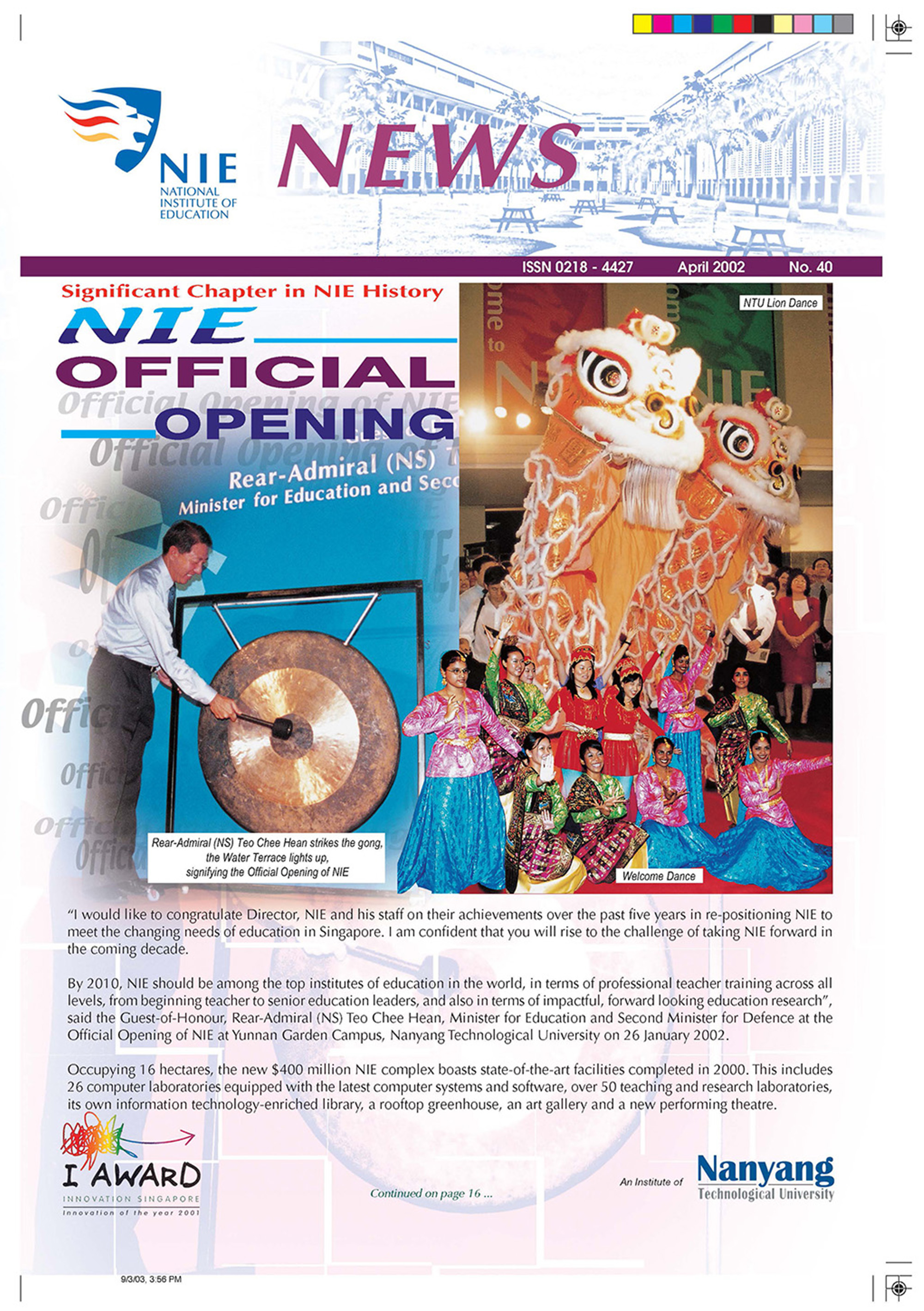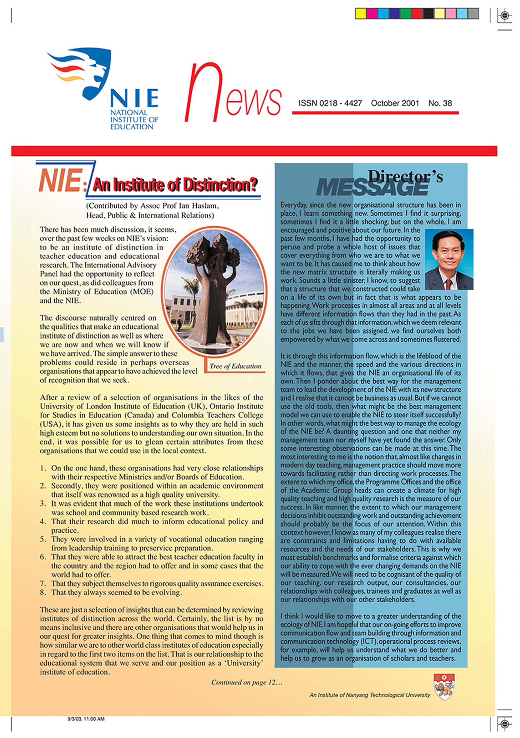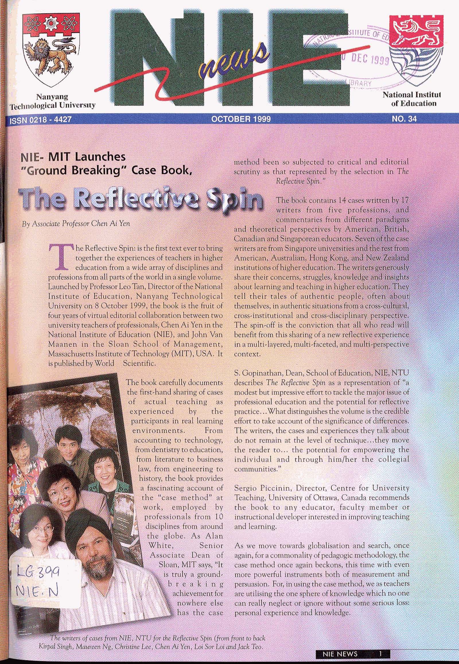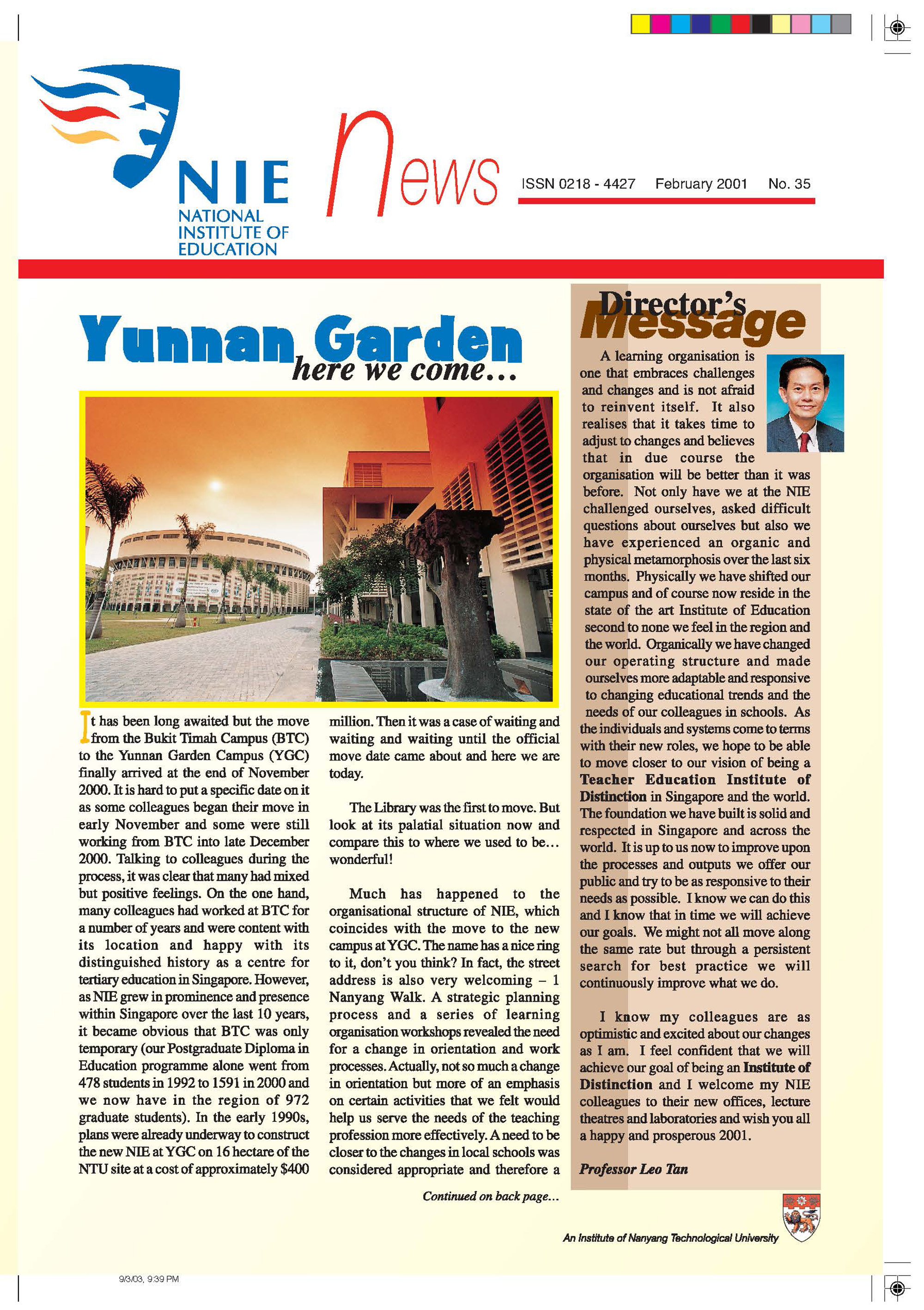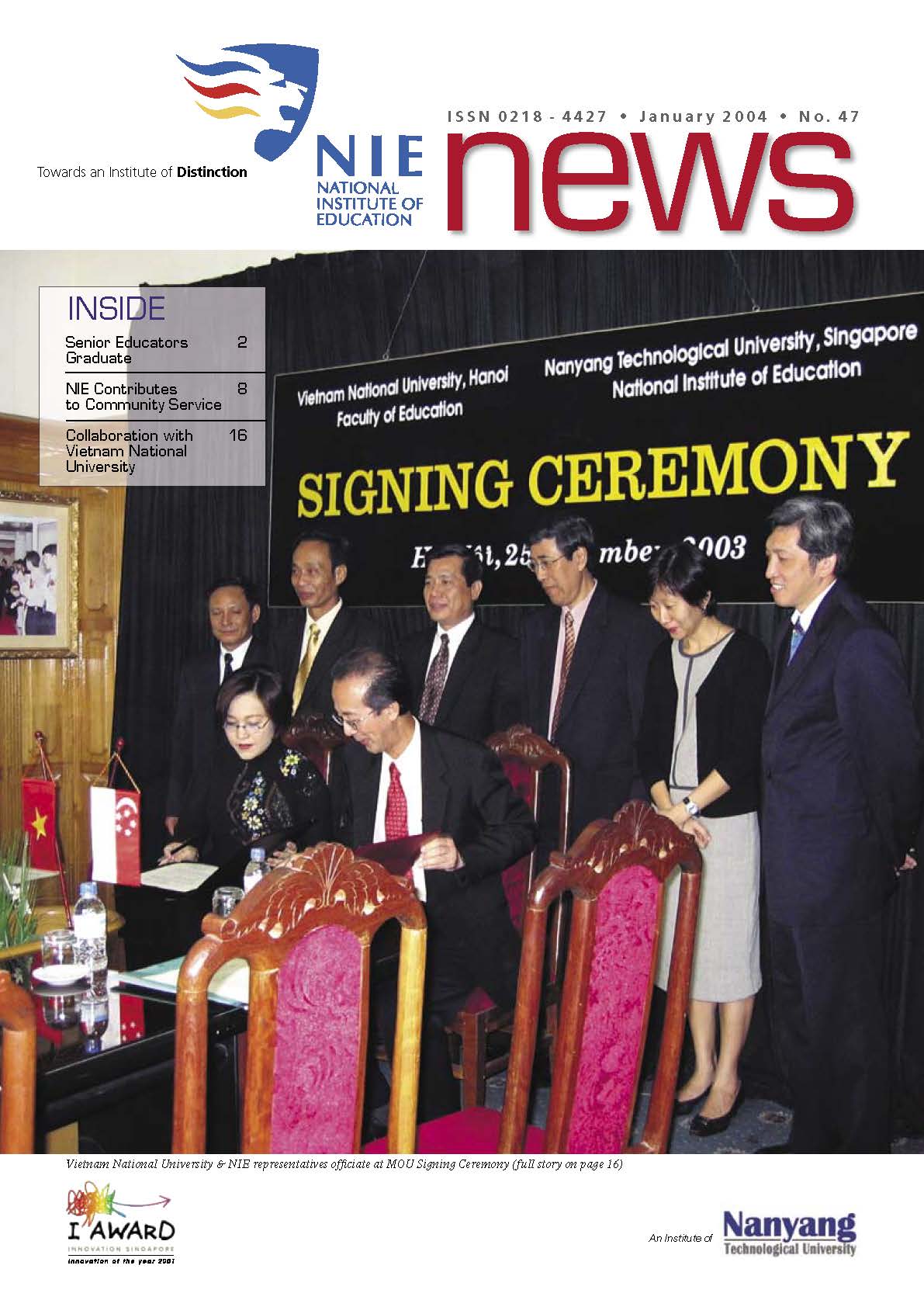 NIEWS 2020s #131 Unlocking Potential With Strategic SynergyMarch 2025 #132 Innovation through Inclusive EducationJune 2025 #133 Supercharging Teacher DevelopmentSeptember 2025 #134 Reflecting On Our Collective AchievementsDecember 2025 #130 Strengthening NetworksDecember 2024 #129 Instilling a Caring CultureSeptember 2024 #128 Championing Knowledge CreationJune 2024 #127 Unlocking the power for EdTechMarch 2024 #126 Ready for the FutureDecember 2023 #125Wired for KnowledgeSeptember 2023 #124Diversity in LearningJune 2023 #123Inspired to ServeMarch 2023 #122Reinforcing ValuesDecember 2022 #121Reimagining EducationSeptember 2022 #120Rethinking PossibilitiesJune 2022 #119Reconnecting LearningMarch 2022 #118Play to LearnDecember 2021 #117Building ResilienceSeptember 2021 #116Reimagining PedagogiesJune 2021 #115Rekindling InnovationMarch 2021 #114From Z to ADecember 2020 #113Learning UnlimitedSeptember 2020 #112The Teacher's Digital ToolboxJune 2020 #111Growing Into TeacherhoodMarch 2020 2010s #110Forward & UpwardDecember 2019 #109Celebrating Educators of TodaySeptember 2019 #108Architects of Learning EnvironmentJune 2019 #107Steering Learners in a Borderless WorldMarch 2019 #106A Future-Ready NIEDecember 2018 #105Prism of PossibilitiesSeptember 2018 #104Through A Different LensJune 2018 #103Nurture & NatureApril 2018 #102Transformation & ContinuityJanuary 2018 #101Advancing in Leadership and Educational ChangeOctober 2017 #100100th Issue: The Joy of LearningJuly 2017 #99Leading LearnerMarch 2017 #98Growing GlobalDecember 2016 #97Harnessing TalentSeptember 2016 #96Powering PassionJune 2016 #95Challenging CreativityMarch 2016 #94Impacting InsightDecember 2015 #93Driving DiscoverySeptember 2015 #92Scripting IntelligenceJune 2015 #91Seeding TalentMarch 2015 #90Reinventing the Future of LearningDecember 2014 #89Mapping Out Good LearningSeptember 2014 #88Opening Doors for Higher EducationJune 2014 #87Breaking Ground for EducationMarch 2014 #86Classroom InnovatorsDecember 2013 #85Growing ExcellenceSeptember 2013 #84Learning InspirationJune 2013 #83Leading ChangeMarch 2013 #82Designing the FutureDecember 2012 #81Teaching InspirationSeptember 2012 #80Growing ExcellenceJune 2012 #79Passion for TeachingMarch 2012 #78Passion for ServingDecember 2011 #77Passion for CollaboratingSeptember 2011 #76Passion for LearningJune 2011 #7521st Century Educators Lead with PassionMarch 2011 2000s #7460 Years of EducationDecember 2010 #73Touching Hearts and Transforming MindsSeptember 2010 #72Singapore Youth Olympic Games 2010 Special IssueJune 2010 #716 Decades of Transforming TeachingMarch 2010 #70Teacher Education in the 21st CenturyDecember 2009 #69Convocation 2009September 2009 #68Research. Art Gallery. Creativity. Innovative Teaching Technology.May 2009 #67Search Wikipedia: NIE AchievementsFebruary 2009 #66NIE Director's Race 2008October 2008 #65Leaders in the Service of LearnersJuly 2008 #64Learning to Serve, Serving to LearnApril 2008 #63January 2008 #62October 2007 #61July 2007 #60April 2007 #59January 2007 #58October 2006 #57July 2006 #56April 2006 #55January 2006 #54NIE's Conservation Efforts Lead to Release of Hawksbill Turtle HatchlingsOctober 2005 #53NIE is Energy EfficientJuly 2005 #52Teach Less, Learn MoreApril 2005 #51Caring & GivingJanuary 2005 #50Caring & GivingOctober 2004 #49Celebrate Learning!July 2004 #48April 2004 #47Signing CeremonyJanuary 2004 #46October 2003 #45Appointment Changes in ConversationJuly 2003 #44April 2003 #43Professor Leo Tan Awarded Ordre National du MeriteJanuary 2003 #42The Caring Teacher Awards 2002October 2002 #41July 2002 #40NIE Official OpeningApril 2002 #39NIE of NantahJanuary 2002 #38NIE: An Institute of Distinction?October 2001 #37An Invitation to the NIE Open HouseJuly 2001 #36Thoughts on the NIE Corporate Seminar 2001April 2001 #35Yunnan Garden Here We ComeFebruary 2001 1990s #34The Reflective SpinOctober 1999 #33Teacher's Investiture CeremonyJuly 1999 #32April 1999 #31Continuity and ChangeJanuary 1999 #30NIE Convocation 1998October 1998 #29The Singapore Centre for Teaching ThinkingJuly 1998 #28Educating the FutureApril 1998 #27AIESEP Singapore 1997 World ConferenceJanuary 1998 #26It's Never Too LateOctober 1997 #25The Thinking ConferenceJuly 1997 #24Minister's VisitApril 1997 #23The Tan Kah Kee ProfessorshipJanuary 1997 #22Scholars in the Teaching ProfessionOctober 1996 #21A Sign of Things to ComeJuly 1996 #20Professor Sir Michael Howard Lee Kuan Yew Distinguished VisitorApril 1996 #19Principal's Executive Centre (PEC)January 1996 #18Convocation 1995October 1995 #17The Eighth Asian Workshop on Child and Adolescent DevelopmentJuly 1995 #16NIE Celebrates World ChampionApril 1995 #15Designing Drugs Through Computer SimulationJanuary 1995 #14Convocation 1994October 1994 #13Relocation of NIE to Jurong CampusJuly 1994 #12Programme for National AwarenessApril 1994 #11A Glorious First... Commonwealth Writer's Prize 1993January 1994 #10Mentoring in Management Education: The NIE ModelOctober 1993 #9NIE Signed Memorandum of Understanding with the National Parks BoardJuly 1993 #8Elaine Feinstein: NTU's First Writer In-Residence - A Brief and Personal ResponseApril 1993 #7NIE Convocation 1992January 1993 #6NTU Open DayOctober 1992 #5Visit to UK UniversitiesJuly 1992 #4The Tree of Education - A Sculpture by Chern Lian ShanApril 1992 #3NIE (NTU) - SISIR Joint Project Agreement on the Lettuce Research ProjectJanuary 1992 #2Ministers Visit NIEOctober 1991 #1NTU Inauguration - A Major Step ForwardJuly 1991
