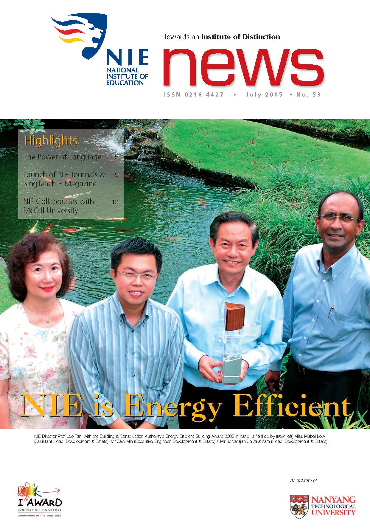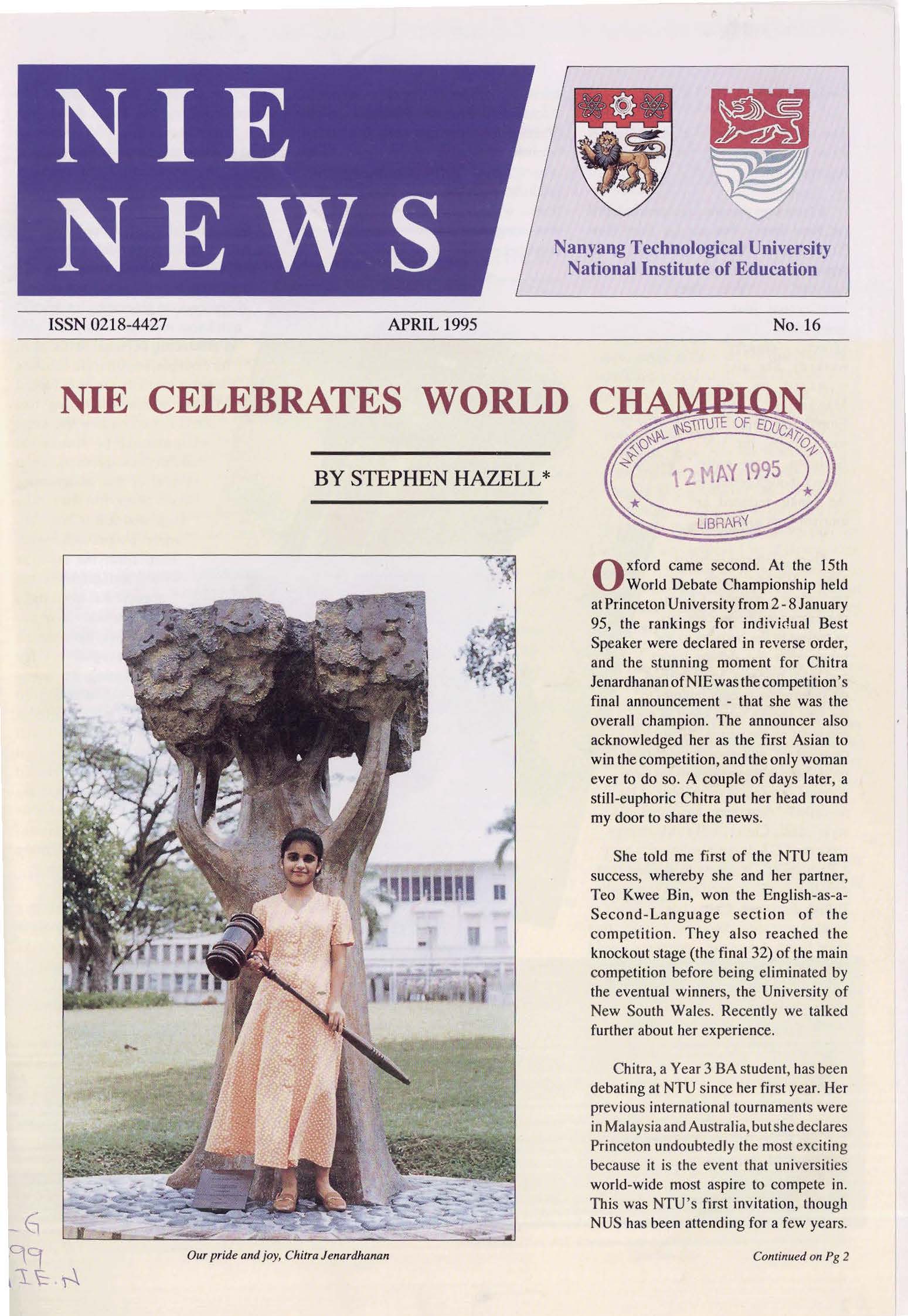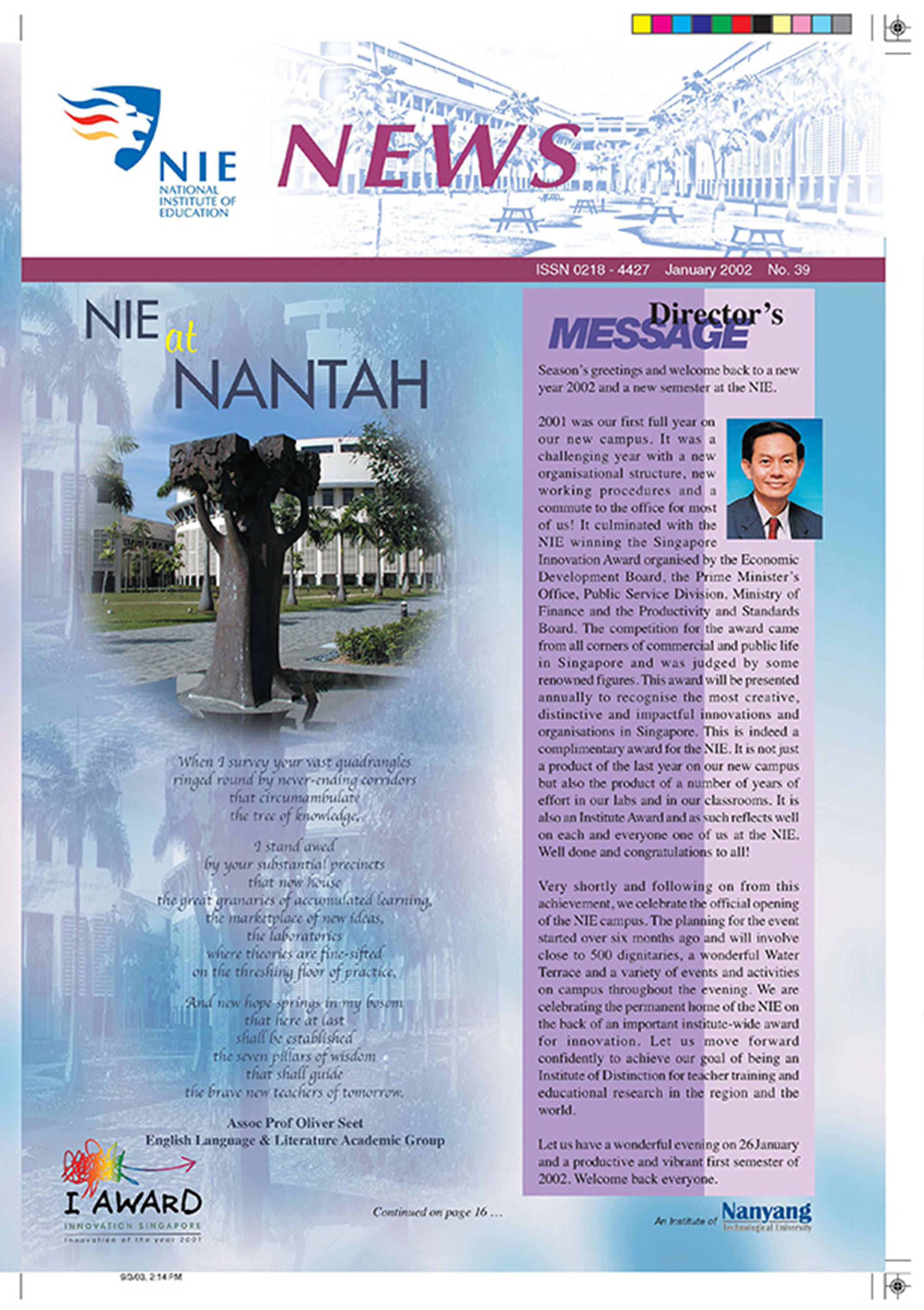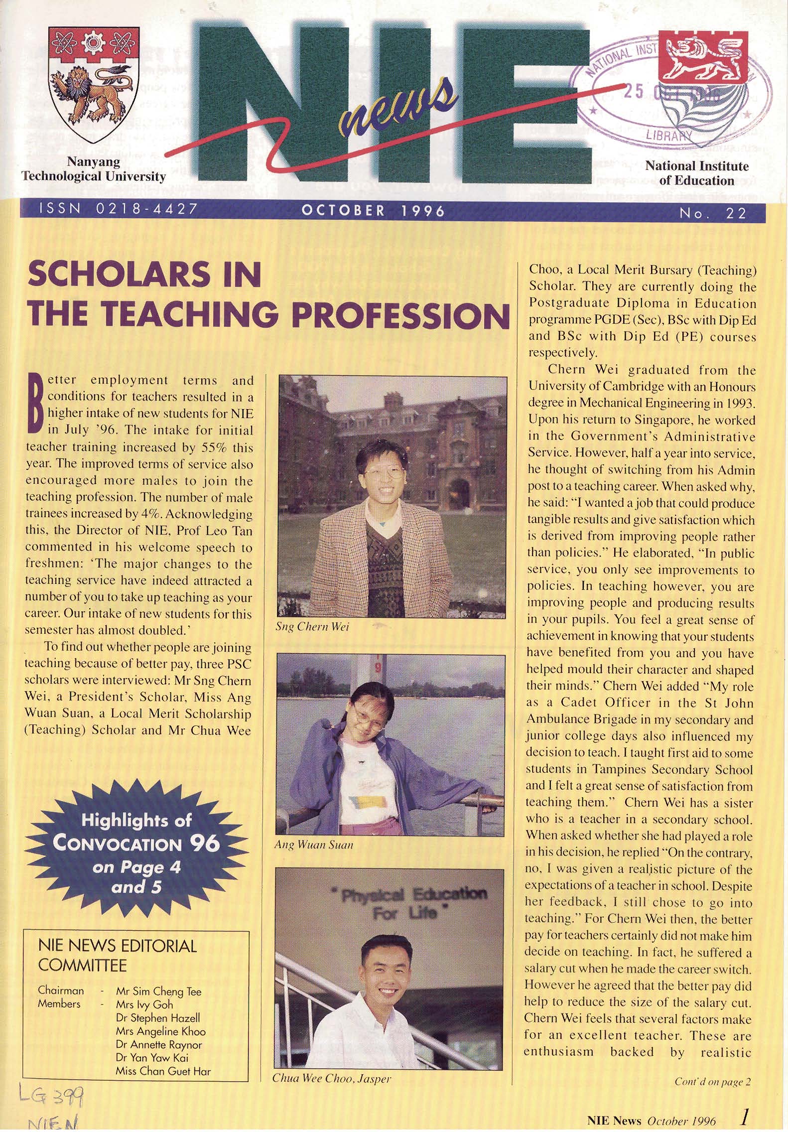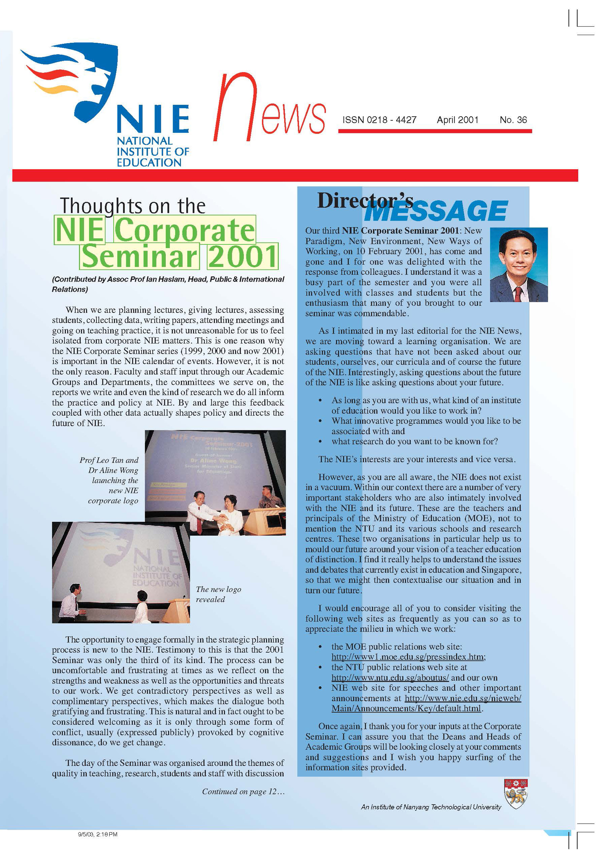 NIEWS 2020s #131 Unlocking Potential With Strategic SynergyMarch 2025 #132 Innovation through Inclusive EducationJune 2025 #133 Supercharging Teacher DevelopmentSeptember 2025 #134 Reflecting On Our Collective AchievementsDecember 2025 #130 Strengthening NetworksDecember 2024 #129 Instilling a Caring CultureSeptember 2024 #128 Championing Knowledge CreationJune 2024 #127 Unlocking the power for EdTechMarch 2024 #126 Ready for the FutureDecember 2023 #125Wired for KnowledgeSeptember 2023 #124Diversity in LearningJune 2023 #123Inspired to ServeMarch 2023 #122Reinforcing ValuesDecember 2022 #121Reimagining EducationSeptember 2022 #120Rethinking PossibilitiesJune 2022 #119Reconnecting LearningMarch 2022 #118Play to LearnDecember 2021 #117Building ResilienceSeptember 2021 #116Reimagining PedagogiesJune 2021 #115Rekindling InnovationMarch 2021 #114From Z to ADecember 2020 #113Learning UnlimitedSeptember 2020 #112The Teacher's Digital ToolboxJune 2020 #111Growing Into TeacherhoodMarch 2020 2010s #110Forward & UpwardDecember 2019 #109Celebrating Educators of TodaySeptember 2019 #108Architects of Learning EnvironmentJune 2019 #107Steering Learners in a Borderless WorldMarch 2019 #106A Future-Ready NIEDecember 2018 #105Prism of PossibilitiesSeptember 2018 #104Through A Different LensJune 2018 #103Nurture & NatureApril 2018 #102Transformation & ContinuityJanuary 2018 #101Advancing in Leadership and Educational ChangeOctober 2017 #100100th Issue: The Joy of LearningJuly 2017 #99Leading LearnerMarch 2017 #98Growing GlobalDecember 2016 #97Harnessing TalentSeptember 2016 #96Powering PassionJune 2016 #95Challenging CreativityMarch 2016 #94Impacting InsightDecember 2015 #93Driving DiscoverySeptember 2015 #92Scripting IntelligenceJune 2015 #91Seeding TalentMarch 2015 #90Reinventing the Future of LearningDecember 2014 #89Mapping Out Good LearningSeptember 2014 #88Opening Doors for Higher EducationJune 2014 #87Breaking Ground for EducationMarch 2014 #86Classroom InnovatorsDecember 2013 #85Growing ExcellenceSeptember 2013 #84Learning InspirationJune 2013 #83Leading ChangeMarch 2013 #82Designing the FutureDecember 2012 #81Teaching InspirationSeptember 2012 #80Growing ExcellenceJune 2012 #79Passion for TeachingMarch 2012 #78Passion for ServingDecember 2011 #77Passion for CollaboratingSeptember 2011 #76Passion for LearningJune 2011 #7521st Century Educators Lead with PassionMarch 2011 2000s #7460 Years of EducationDecember 2010 #73Touching Hearts and Transforming MindsSeptember 2010 #72Singapore Youth Olympic Games 2010 Special IssueJune 2010 #716 Decades of Transforming TeachingMarch 2010 #70Teacher Education in the 21st CenturyDecember 2009 #69Convocation 2009September 2009 #68Research. Art Gallery. Creativity. Innovative Teaching Technology.May 2009 #67Search Wikipedia: NIE AchievementsFebruary 2009 #66NIE Director's Race 2008October 2008 #65Leaders in the Service of LearnersJuly 2008 #64Learning to Serve, Serving to LearnApril 2008 #63January 2008 #62October 2007 #61July 2007 #60April 2007 #59January 2007 #58October 2006 #57July 2006 #56April 2006 #55January 2006 #54NIE's Conservation Efforts Lead to Release of Hawksbill Turtle HatchlingsOctober 2005 #53NIE is Energy EfficientJuly 2005 #52Teach Less, Learn MoreApril 2005 #51Caring & GivingJanuary 2005 #50Caring & GivingOctober 2004 #49Celebrate Learning!July 2004 #48April 2004 #47Signing CeremonyJanuary 2004 #46October 2003 #45Appointment Changes in ConversationJuly 2003 #44April 2003 #43Professor Leo Tan Awarded Ordre National du MeriteJanuary 2003 #42The Caring Teacher Awards 2002October 2002 #41July 2002 #40NIE Official OpeningApril 2002 #39NIE of NantahJanuary 2002 #38NIE: An Institute of Distinction?October 2001 #37An Invitation to the NIE Open HouseJuly 2001 #36Thoughts on the NIE Corporate Seminar 2001April 2001 #35Yunnan Garden Here We ComeFebruary 2001 1990s #34The Reflective SpinOctober 1999 #33Teacher's Investiture CeremonyJuly 1999 #32April 1999 #31Continuity and ChangeJanuary 1999 #30NIE Convocation 1998October 1998 #29The Singapore Centre for Teaching ThinkingJuly 1998 #28Educating the FutureApril 1998 #27AIESEP Singapore 1997 World ConferenceJanuary 1998 #26It's Never Too LateOctober 1997 #25The Thinking ConferenceJuly 1997 #24Minister's VisitApril 1997 #23The Tan Kah Kee ProfessorshipJanuary 1997 #22Scholars in the Teaching ProfessionOctober 1996 #21A Sign of Things to ComeJuly 1996 #20Professor Sir Michael Howard Lee Kuan Yew Distinguished VisitorApril 1996 #19Principal's Executive Centre (PEC)January 1996 #18Convocation 1995October 1995 #17The Eighth Asian Workshop on Child and Adolescent DevelopmentJuly 1995 #16NIE Celebrates World ChampionApril 1995 #15Designing Drugs Through Computer SimulationJanuary 1995 #14Convocation 1994October 1994 #13Relocation of NIE to Jurong CampusJuly 1994 #12Programme for National AwarenessApril 1994 #11A Glorious First... Commonwealth Writer's Prize 1993January 1994 #10Mentoring in Management Education: The NIE ModelOctober 1993 #9NIE Signed Memorandum of Understanding with the National Parks BoardJuly 1993 #8Elaine Feinstein: NTU's First Writer In-Residence - A Brief and Personal ResponseApril 1993 #7NIE Convocation 1992January 1993 #6NTU Open DayOctober 1992 #5Visit to UK UniversitiesJuly 1992 #4The Tree of Education - A Sculpture by Chern Lian ShanApril 1992 #3NIE (NTU) - SISIR Joint Project Agreement on the Lettuce Research ProjectJanuary 1992 #2Ministers Visit NIEOctober 1991 #1NTU Inauguration - A Major Step ForwardJuly 1991