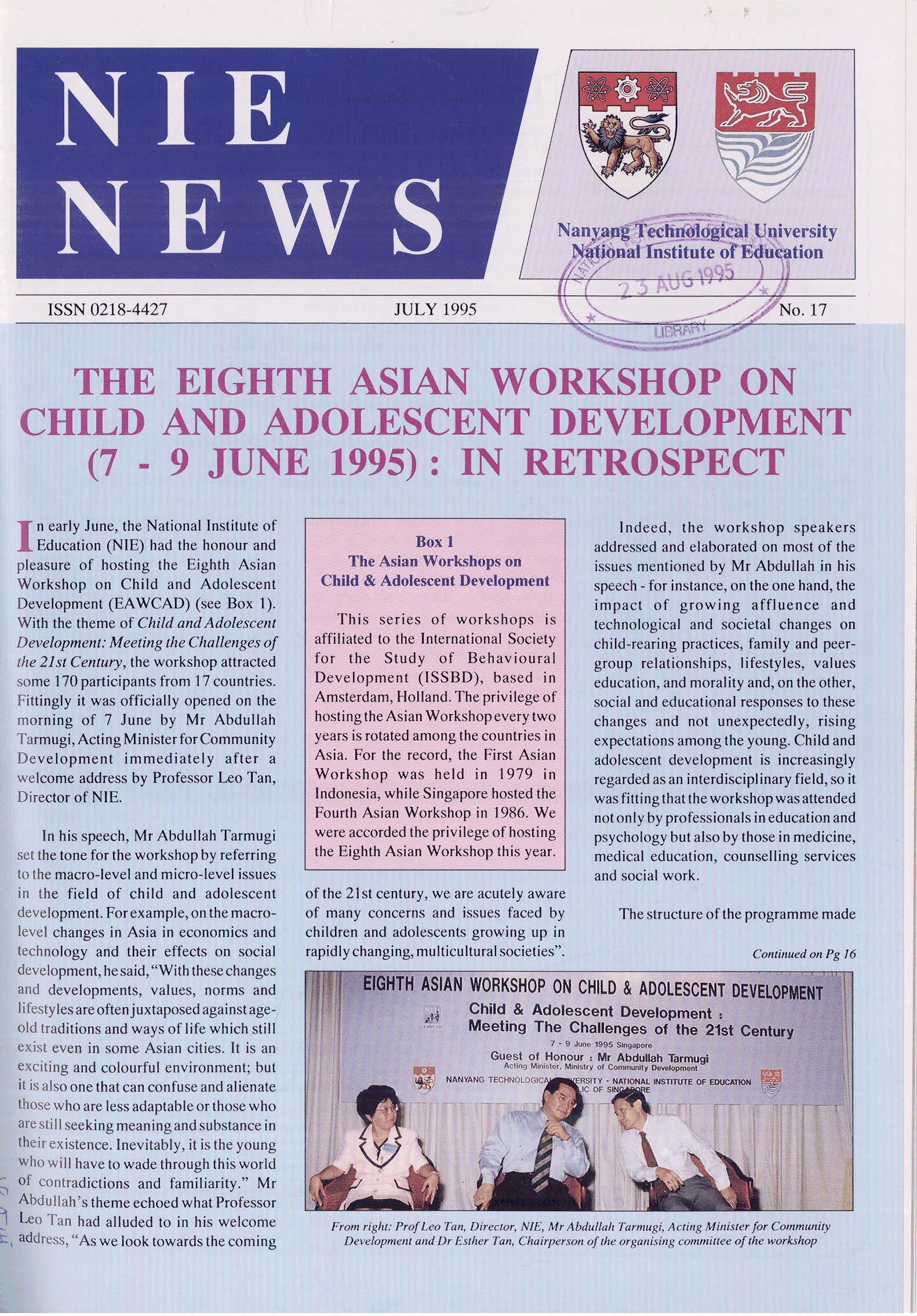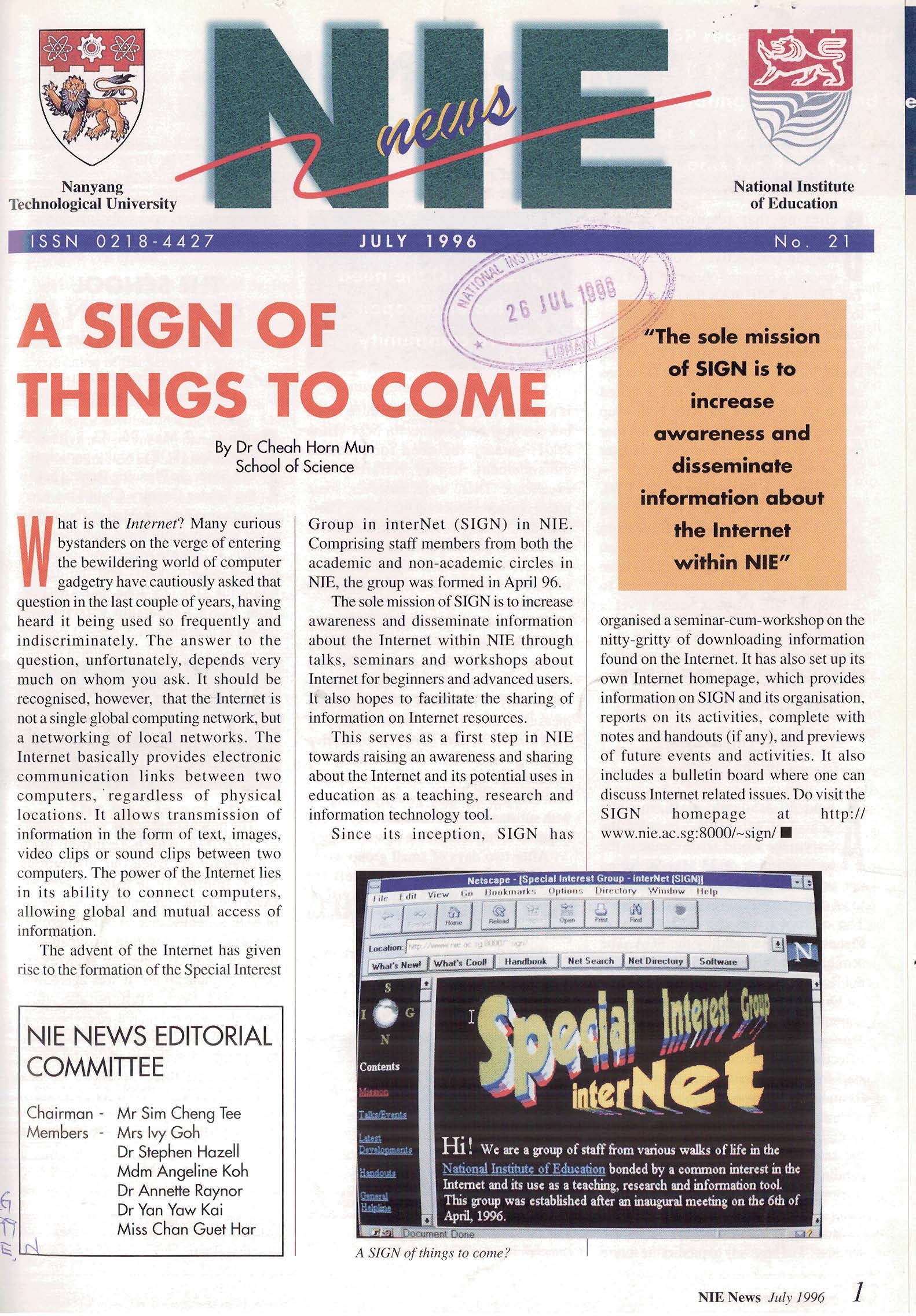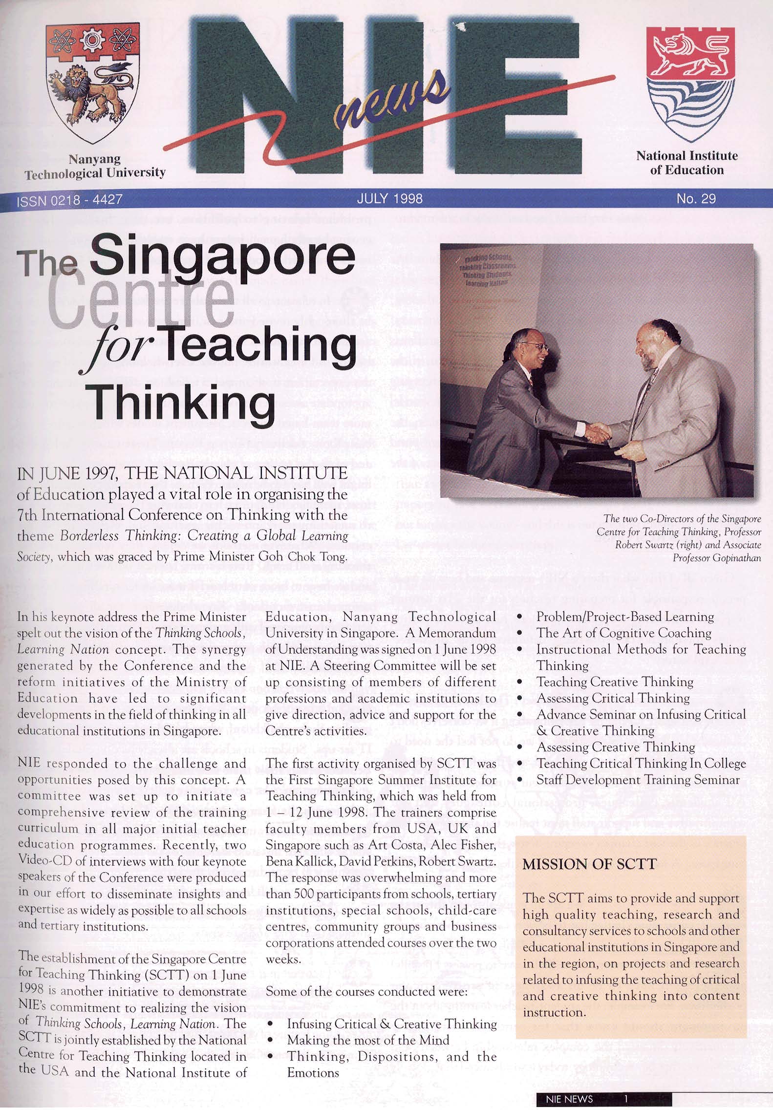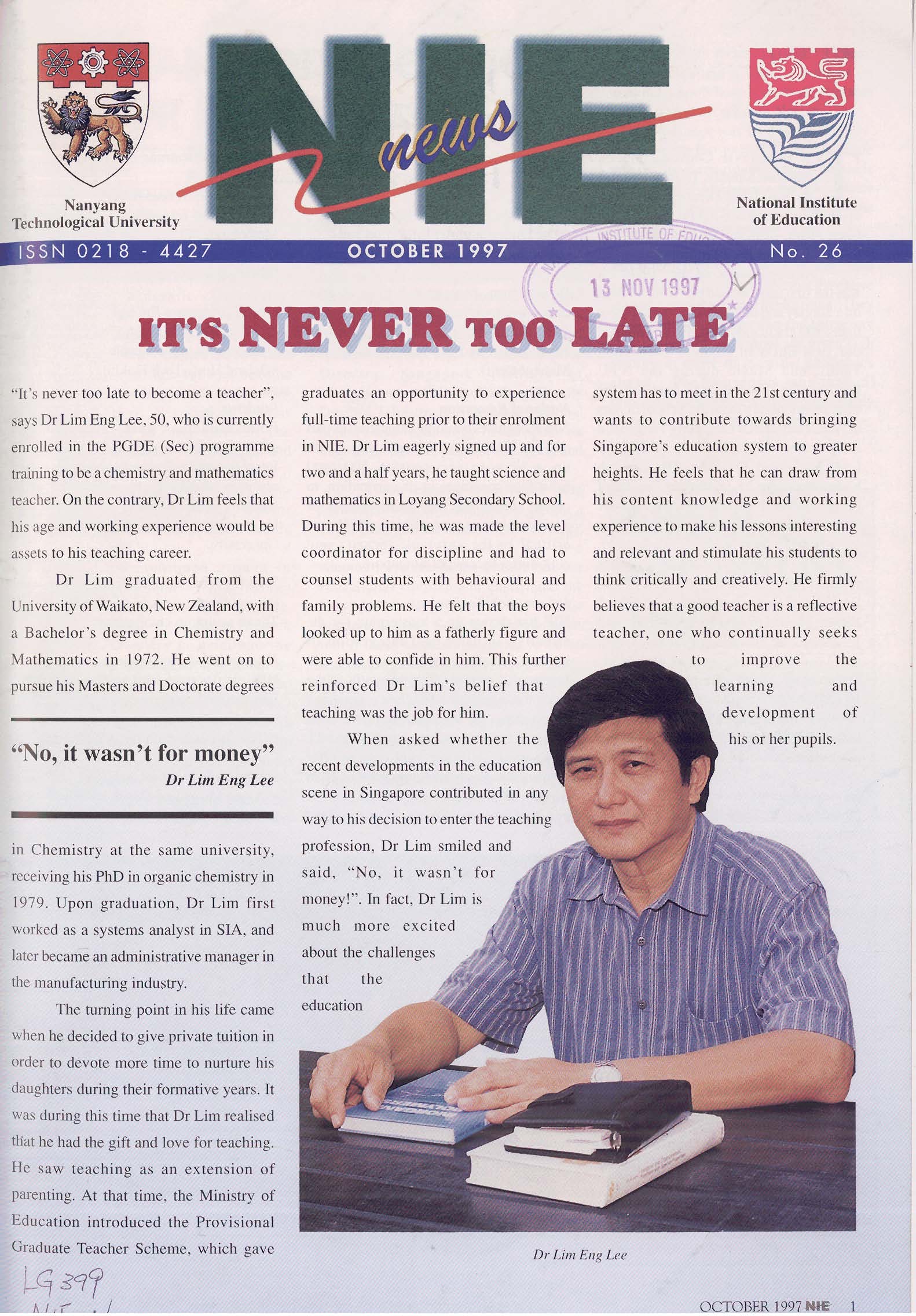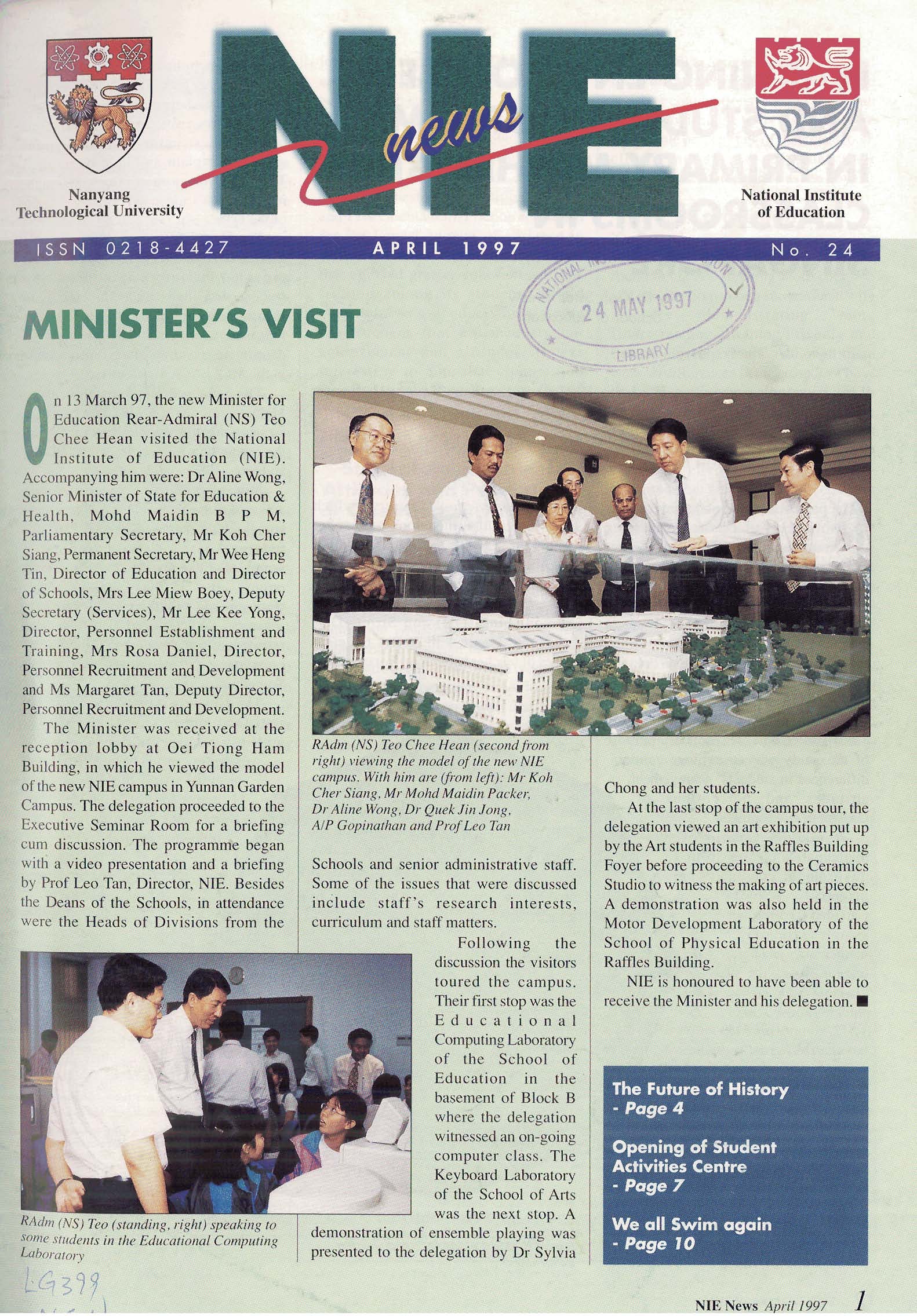 NIEWS 2020s #131 Unlocking Potential With Strategic SynergyMarch 2025 #132 Innovation through Inclusive EducationJune 2025 #133 Supercharging Teacher DevelopmentSeptember 2025 #134 Reflecting On Our Collective AchievementsDecember 2025 #130 Strengthening NetworksDecember 2024 #129 Instilling a Caring CultureSeptember 2024 #128 Championing Knowledge CreationJune 2024 #127 Unlocking the power for EdTechMarch 2024 #126 Ready for the FutureDecember 2023 #125Wired for KnowledgeSeptember 2023 #124Diversity in LearningJune 2023 #123Inspired to ServeMarch 2023 #122Reinforcing ValuesDecember 2022 #121Reimagining EducationSeptember 2022 #120Rethinking PossibilitiesJune 2022 #119Reconnecting LearningMarch 2022 #118Play to LearnDecember 2021 #117Building ResilienceSeptember 2021 #116Reimagining PedagogiesJune 2021 #115Rekindling InnovationMarch 2021 #114From Z to ADecember 2020 #113Learning UnlimitedSeptember 2020 #112The Teacher's Digital ToolboxJune 2020 #111Growing Into TeacherhoodMarch 2020 2010s #110Forward & UpwardDecember 2019 #109Celebrating Educators of TodaySeptember 2019 #108Architects of Learning EnvironmentJune 2019 #107Steering Learners in a Borderless WorldMarch 2019 #106A Future-Ready NIEDecember 2018 #105Prism of PossibilitiesSeptember 2018 #104Through A Different LensJune 2018 #103Nurture & NatureApril 2018 #102Transformation & ContinuityJanuary 2018 #101Advancing in Leadership and Educational ChangeOctober 2017 #100100th Issue: The Joy of LearningJuly 2017 #99Leading LearnerMarch 2017 #98Growing GlobalDecember 2016 #97Harnessing TalentSeptember 2016 #96Powering PassionJune 2016 #95Challenging CreativityMarch 2016 #94Impacting InsightDecember 2015 #93Driving DiscoverySeptember 2015 #92Scripting IntelligenceJune 2015 #91Seeding TalentMarch 2015 #90Reinventing the Future of LearningDecember 2014 #89Mapping Out Good LearningSeptember 2014 #88Opening Doors for Higher EducationJune 2014 #87Breaking Ground for EducationMarch 2014 #86Classroom InnovatorsDecember 2013 #85Growing ExcellenceSeptember 2013 #84Learning InspirationJune 2013 #83Leading ChangeMarch 2013 #82Designing the FutureDecember 2012 #81Teaching InspirationSeptember 2012 #80Growing ExcellenceJune 2012 #79Passion for TeachingMarch 2012 #78Passion for ServingDecember 2011 #77Passion for CollaboratingSeptember 2011 #76Passion for LearningJune 2011 #7521st Century Educators Lead with PassionMarch 2011 2000s #7460 Years of EducationDecember 2010 #73Touching Hearts and Transforming MindsSeptember 2010 #72Singapore Youth Olympic Games 2010 Special IssueJune 2010 #716 Decades of Transforming TeachingMarch 2010 #70Teacher Education in the 21st CenturyDecember 2009 #69Convocation 2009September 2009 #68Research. Art Gallery. Creativity. Innovative Teaching Technology.May 2009 #67Search Wikipedia: NIE AchievementsFebruary 2009 #66NIE Director's Race 2008October 2008 #65Leaders in the Service of LearnersJuly 2008 #64Learning to Serve, Serving to LearnApril 2008 #63January 2008 #62October 2007 #61July 2007 #60April 2007 #59January 2007 #58October 2006 #57July 2006 #56April 2006 #55January 2006 #54NIE's Conservation Efforts Lead to Release of Hawksbill Turtle HatchlingsOctober 2005 #53NIE is Energy EfficientJuly 2005 #52Teach Less, Learn MoreApril 2005 #51Caring & GivingJanuary 2005 #50Caring & GivingOctober 2004 #49Celebrate Learning!July 2004 #48April 2004 #47Signing CeremonyJanuary 2004 #46October 2003 #45Appointment Changes in ConversationJuly 2003 #44April 2003 #43Professor Leo Tan Awarded Ordre National du MeriteJanuary 2003 #42The Caring Teacher Awards 2002October 2002 #41July 2002 #40NIE Official OpeningApril 2002 #39NIE of NantahJanuary 2002 #38NIE: An Institute of Distinction?October 2001 #37An Invitation to the NIE Open HouseJuly 2001 #36Thoughts on the NIE Corporate Seminar 2001April 2001 #35Yunnan Garden Here We ComeFebruary 2001 1990s #34The Reflective SpinOctober 1999 #33Teacher's Investiture CeremonyJuly 1999 #32April 1999 #31Continuity and ChangeJanuary 1999 #30NIE Convocation 1998October 1998 #29The Singapore Centre for Teaching ThinkingJuly 1998 #28Educating the FutureApril 1998 #27AIESEP Singapore 1997 World ConferenceJanuary 1998 #26It's Never Too LateOctober 1997 #25The Thinking ConferenceJuly 1997 #24Minister's VisitApril 1997 #23The Tan Kah Kee ProfessorshipJanuary 1997 #22Scholars in the Teaching ProfessionOctober 1996 #21A Sign of Things to ComeJuly 1996 #20Professor Sir Michael Howard Lee Kuan Yew Distinguished VisitorApril 1996 #19Principal's Executive Centre (PEC)January 1996 #18Convocation 1995October 1995 #17The Eighth Asian Workshop on Child and Adolescent DevelopmentJuly 1995 #16NIE Celebrates World ChampionApril 1995 #15Designing Drugs Through Computer SimulationJanuary 1995 #14Convocation 1994October 1994 #13Relocation of NIE to Jurong CampusJuly 1994 #12Programme for National AwarenessApril 1994 #11A Glorious First... Commonwealth Writer's Prize 1993January 1994 #10Mentoring in Management Education: The NIE ModelOctober 1993 #9NIE Signed Memorandum of Understanding with the National Parks BoardJuly 1993 #8Elaine Feinstein: NTU's First Writer In-Residence - A Brief and Personal ResponseApril 1993 #7NIE Convocation 1992January 1993 #6NTU Open DayOctober 1992 #5Visit to UK UniversitiesJuly 1992 #4The Tree of Education - A Sculpture by Chern Lian ShanApril 1992 #3NIE (NTU) - SISIR Joint Project Agreement on the Lettuce Research ProjectJanuary 1992 #2Ministers Visit NIEOctober 1991 #1NTU Inauguration - A Major Step ForwardJuly 1991