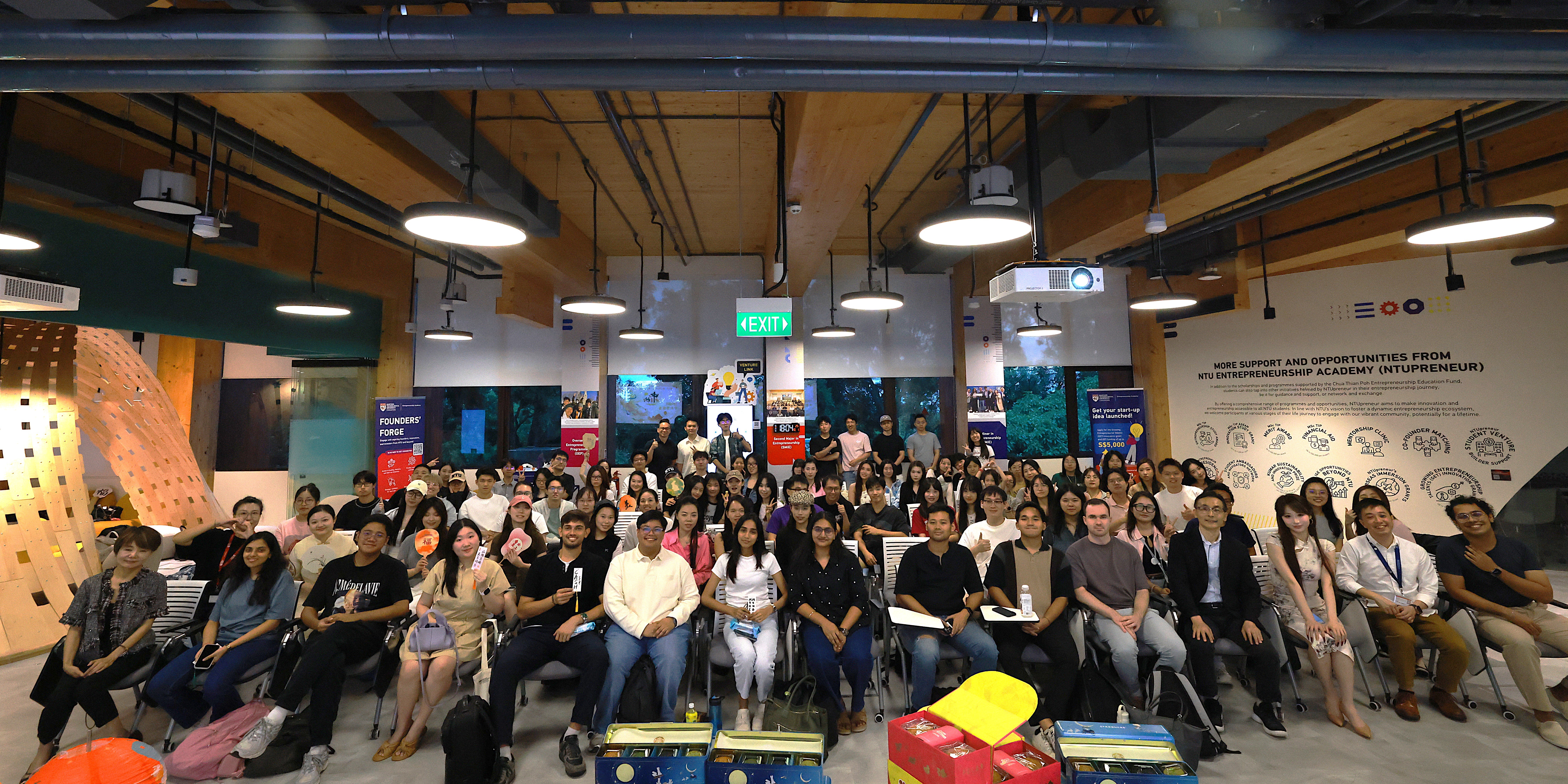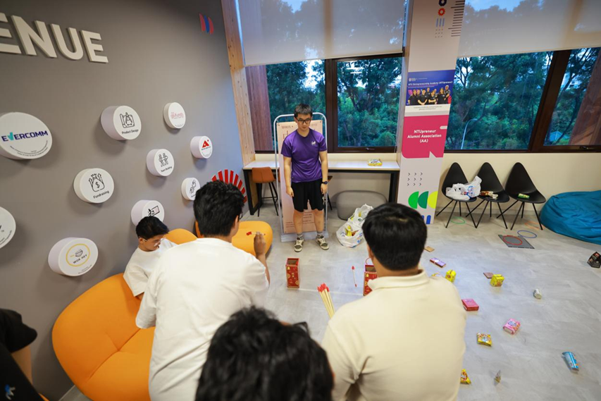 The evening began with a warm dinner, during which students shared food and laughter. A highlight came when Dr Xia Zhiqiang, Deputy Director of Academic Learning at NTUpreneur, personally cut open the mooncakes, filling the room with the sweet symbolism of reunion and togetherness. A big group photo followed, with our smiles shining as brightly as the full moon.