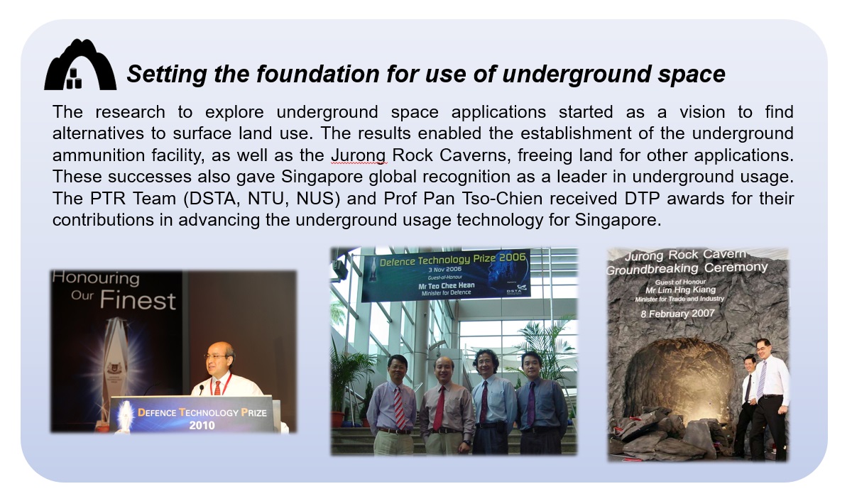 Noteworthy R&D Milestones by the PTR Team include field tests to explore new methodologies of blast-resistance structures, underground ammunition facilities which has led to the establishment of the underground Technology and Rock Engineering (UTRE) Programme and a review of the state-of-the-art protective materials and advanced technology that protect structures against closed-in blasts and penetrations; as well as an assessment of new materials that could be incorporated into existing building for their protection.