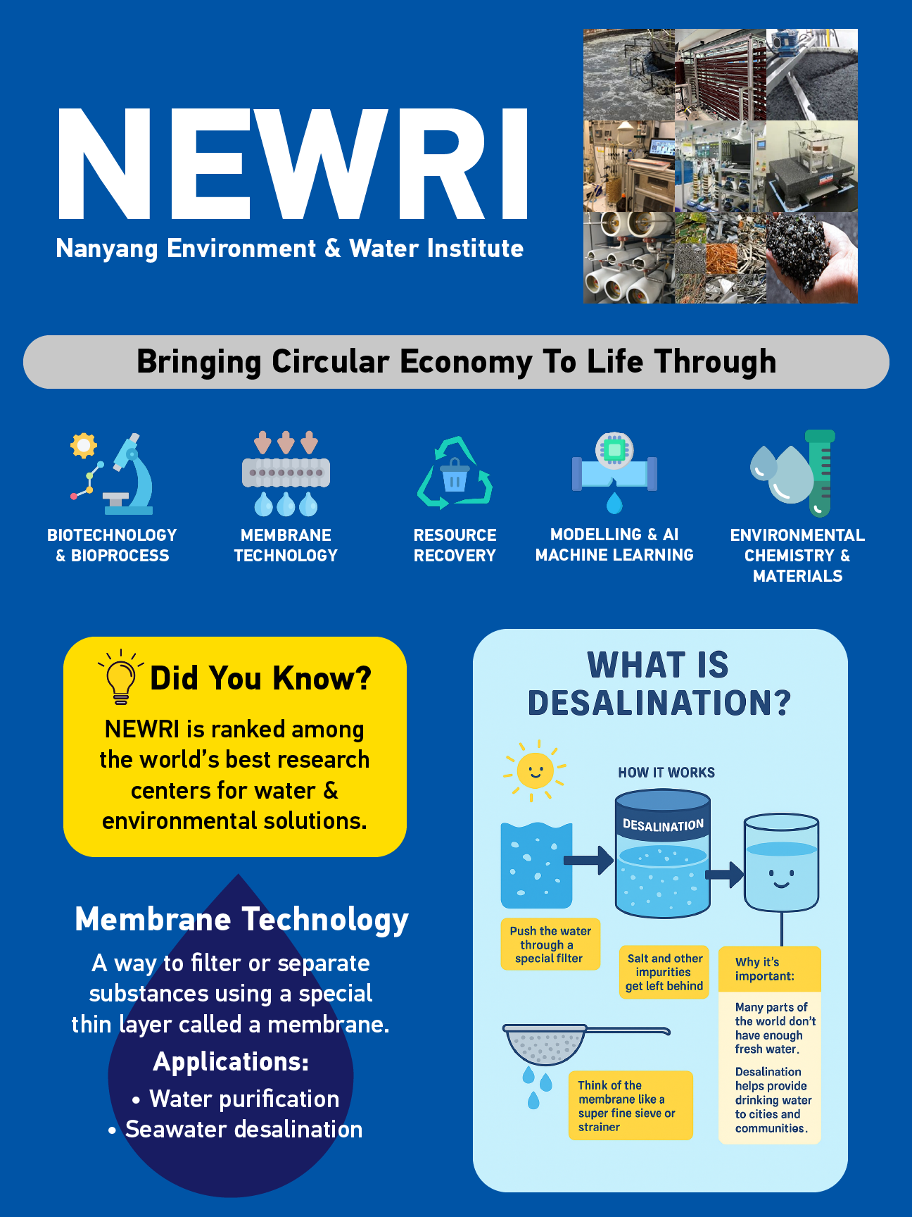 Nanyang Environment & Water Research Institute (NEWRI) ![]() | Globally ranked among the top research and technology organisations in the environment and water domain, the NEWRI ecosystem strives to take its lab-scale innovations to innovative engineered solutions for the water and environmental markets. With ‘Research-Engineering-Deployment’ (RED) as its guiding philosophy, NEWRI bridges deep research with cutting-edge innovation, robust engineering coupled with industry-level translation, to field applications, piloting and deployment at full scale in real-life settings.